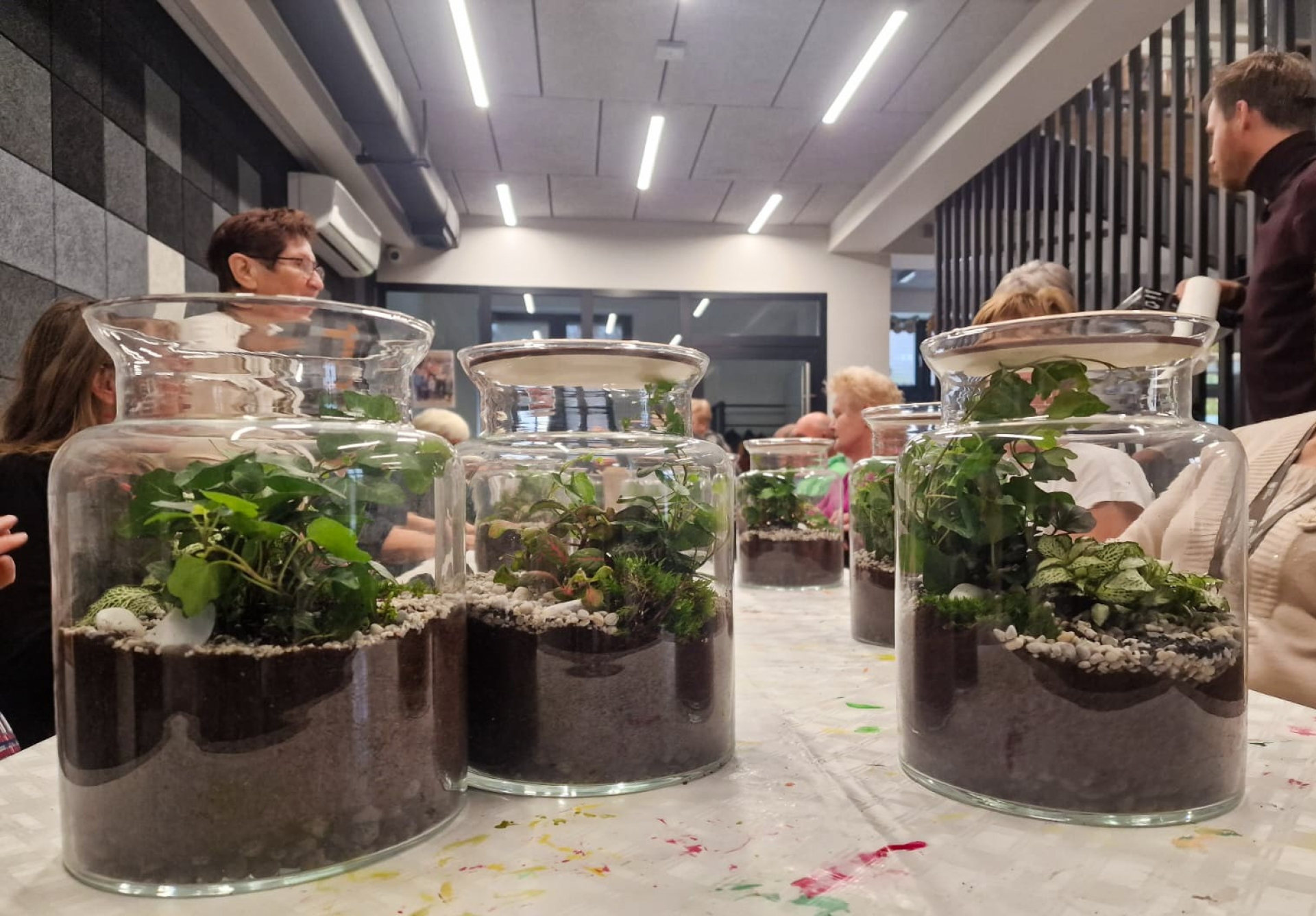 Ogrody w szkle to miniaturowe ekosystemy zamknięte w szklanych słojach, odwzorowujące w skali np. las. To małe biosfery, gdzie panujące warunki imitują naturalne środowisko życia roślin. Warsztaty z tworzenia zamkniętych ekosystemów podzielone zostały na cztery bloki. Pierwszy, to wprowadzenie, w którym prowadzący opowiedział krótko o etapach i ciekawostkach przy tworzeniu lasu/ogrodu w słoiku. W kolejnym etapie uczestnicy przygotowali podłoża pod sadzenie roślin. Trzeci etap to ten najważniejszy, gdzie następuje sadzenie roślin. To w nim Seniorzy zaaranżowali swoje osobiste ekosystemy. Ostatni etap to dekorowanie.