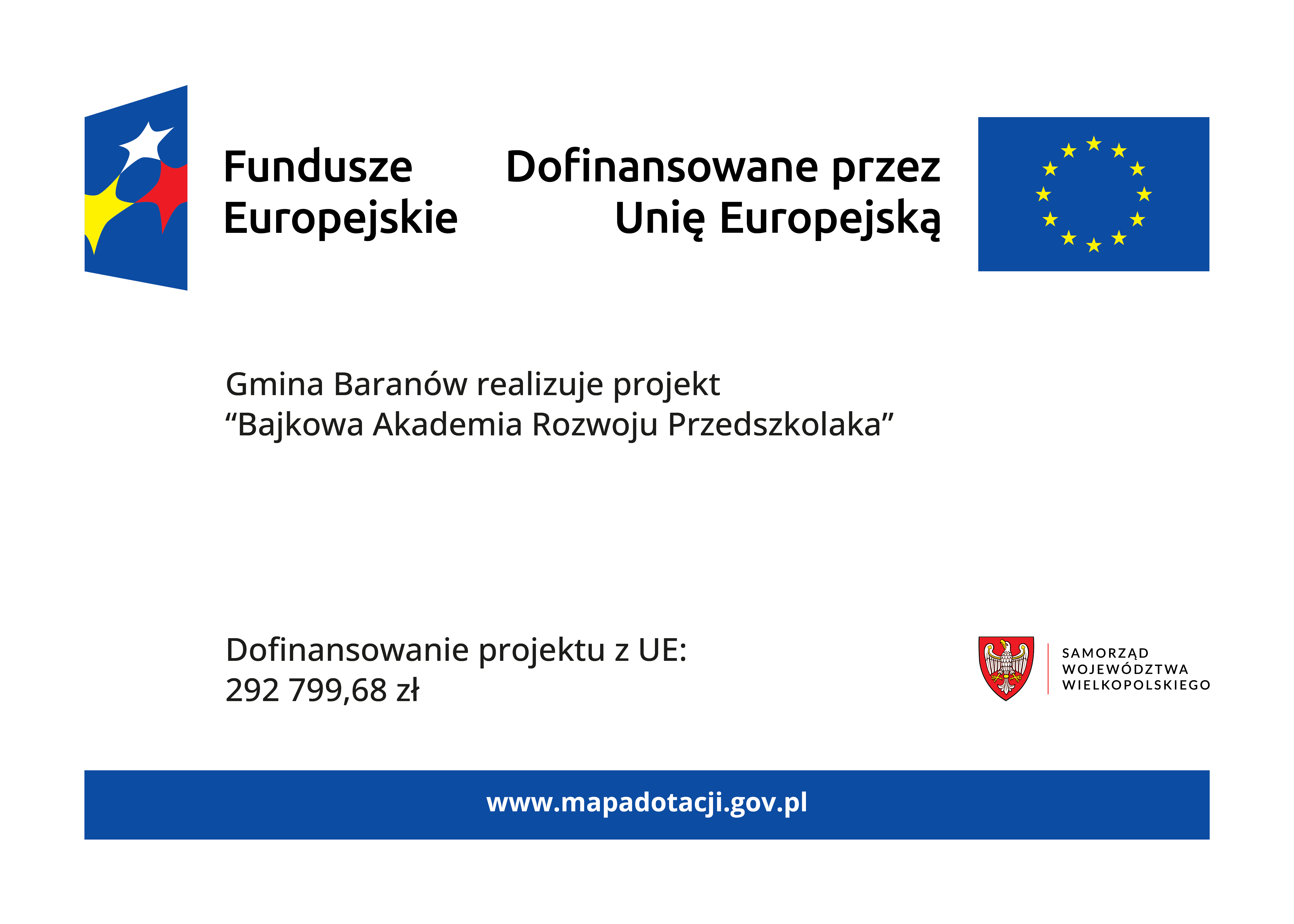 Gmina Baranów w dniu 10 grudnia 2025 r. podpisała z Zarządem Województwa Wielkopolskiego umowę o dofinansowanie projektu pn. „Bajkowa akademia rozwoju przedszkolaka” w ramach Programu Regionalnego Fundusze Europejskie dla Wielkopolski 2021-2027 współfinansowanego ze środków Europejskiego Funduszu Społecznego Plus. Całkowita wartość projektu wynosi 308.212,68zł w tym dofinansowanie w wysokości 292.799,68zł (środki europejskie – 246.570,14zł, dotacja celowa 46. 229,54zł.), a wkład własny w wysokości 14 336,00zł.
