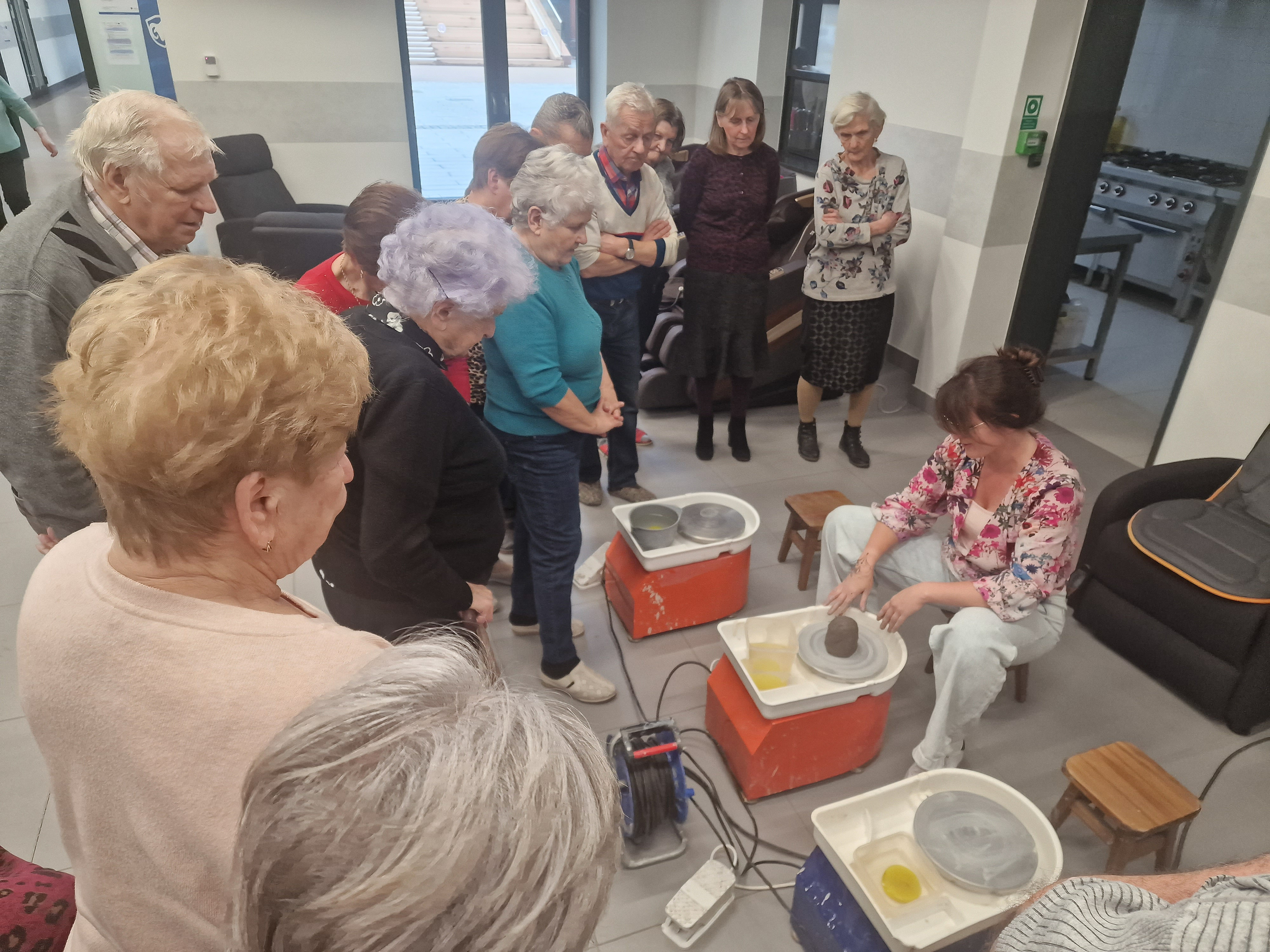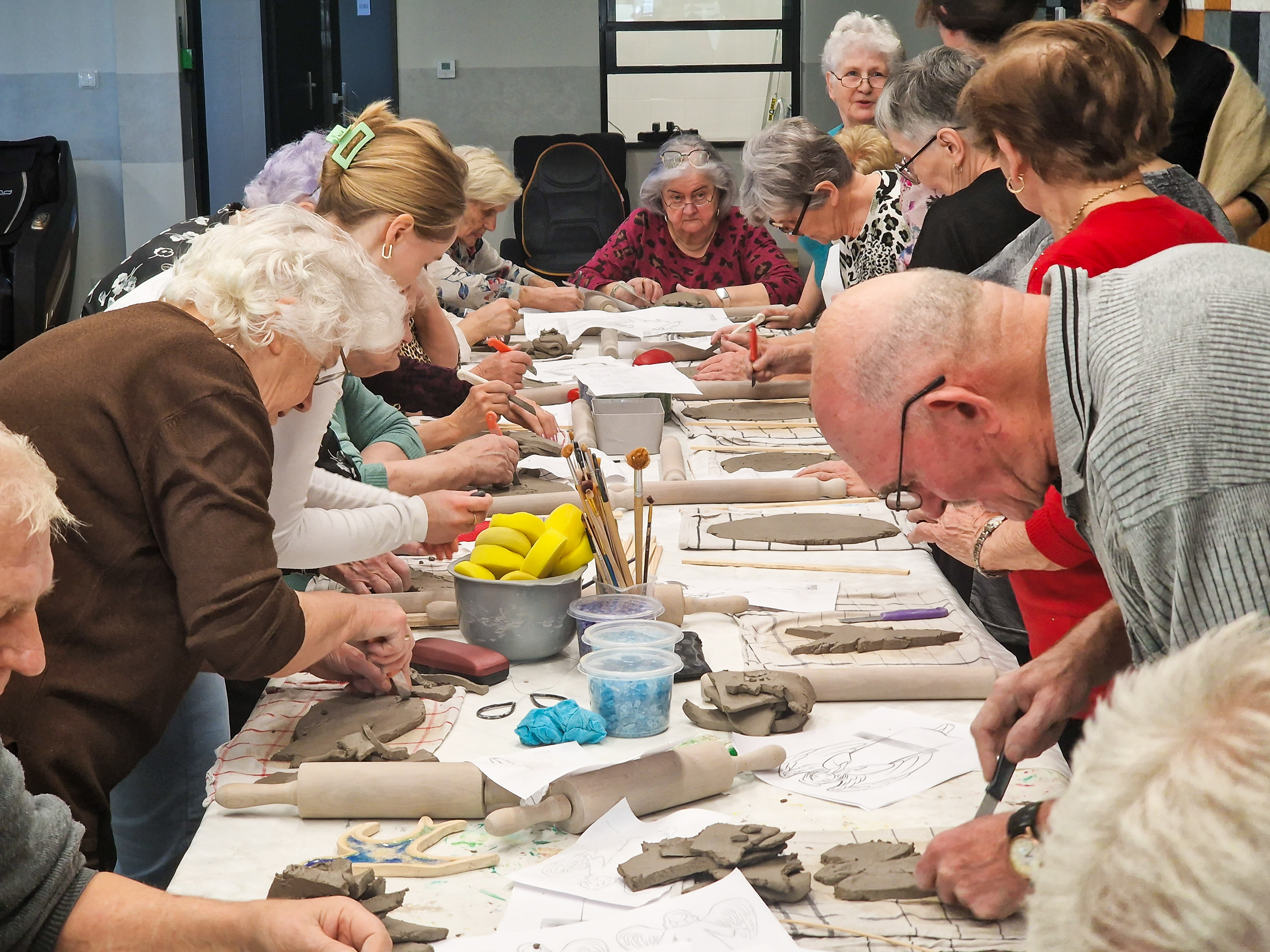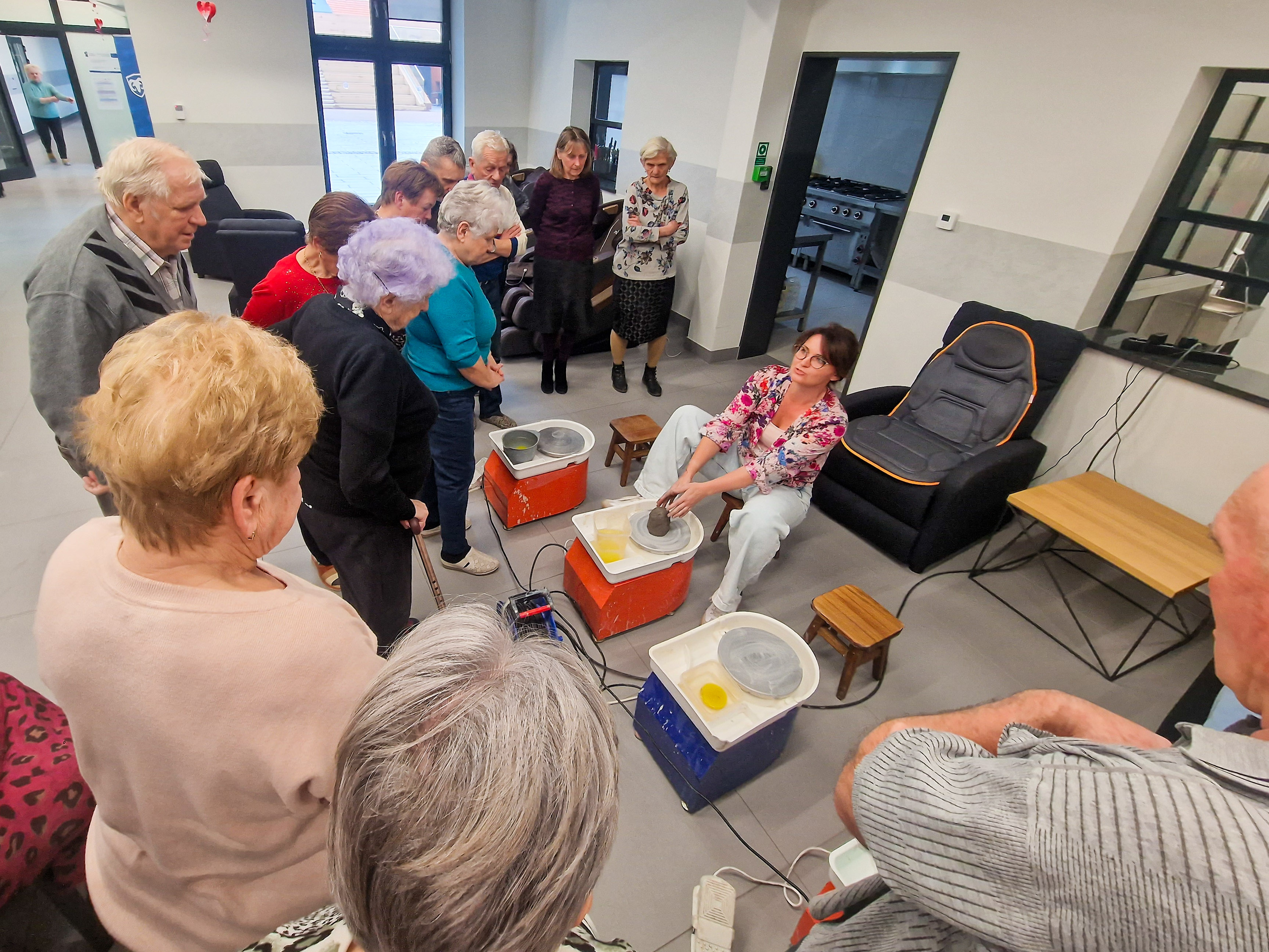 W trakcie cyklu 4 warsztatów Seniorzy poznają różne techniki formowania gliny, zdobienia oraz podstawy szkliwienia i wypalania ceramiki. Zdaniem prowadzącej warsztaty – pani Justyny Wolnej „Glina to niezwykły materiał o nieskończonych możliwościach. Jej plastyczność i kontakt z dłońmi mają kojące działanie, a sam proces tworzenia uczy cierpliwości i uważności. Powstałe prace są unikatowe, odzwierciedlają czas, emocje i osobistą ekspresję twórcy.” Warsztaty ceramiczne są wyjątkową, kreatywną formą integracji, podczas której Seniorzy rozwijają sprawność manualną i koordynację ruchową oraz pobudzają wyobraźnię przestrzenną tworząc dzieła z gliny.