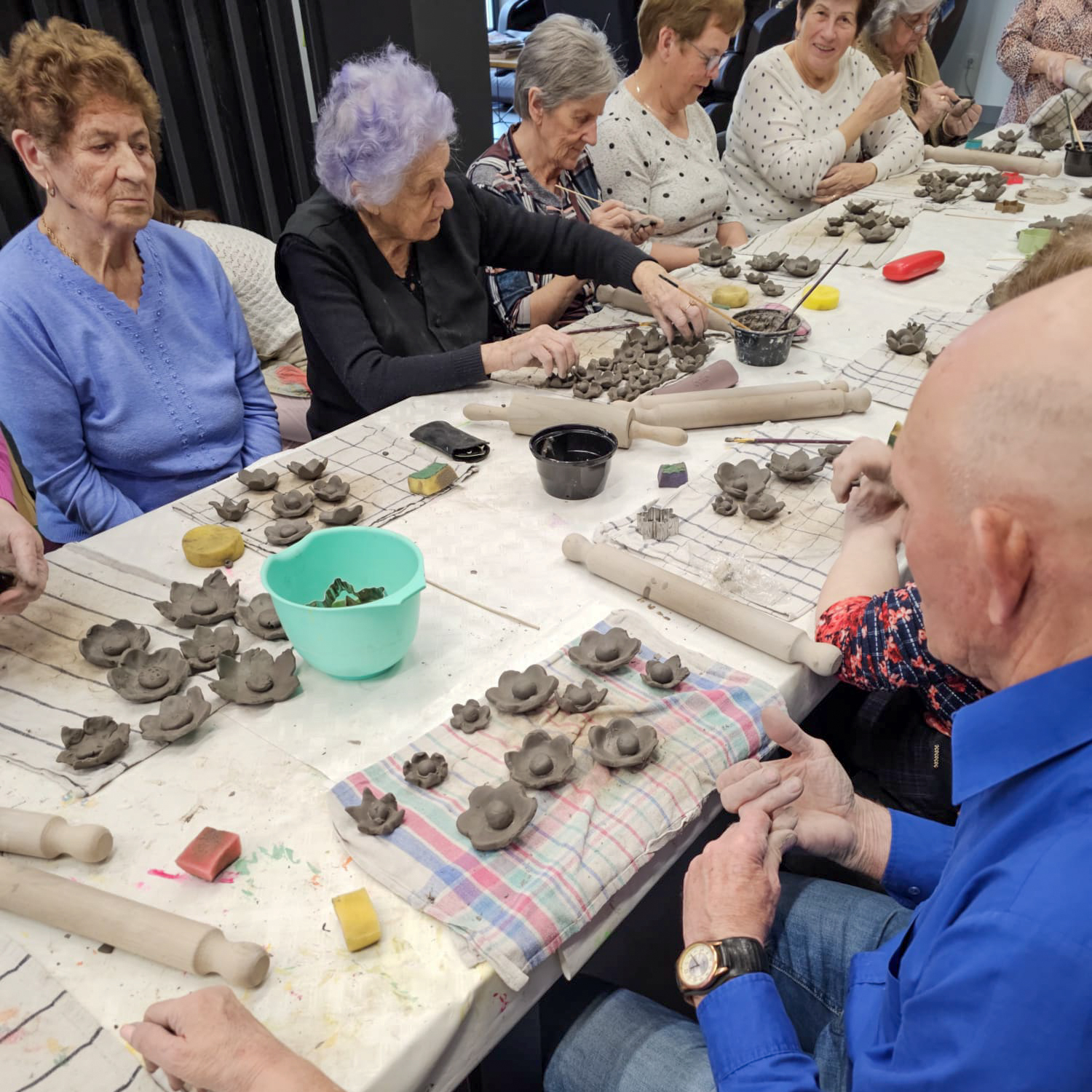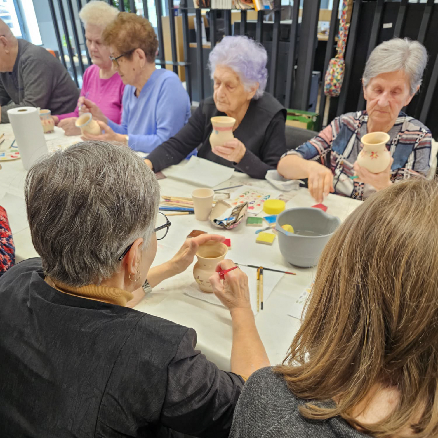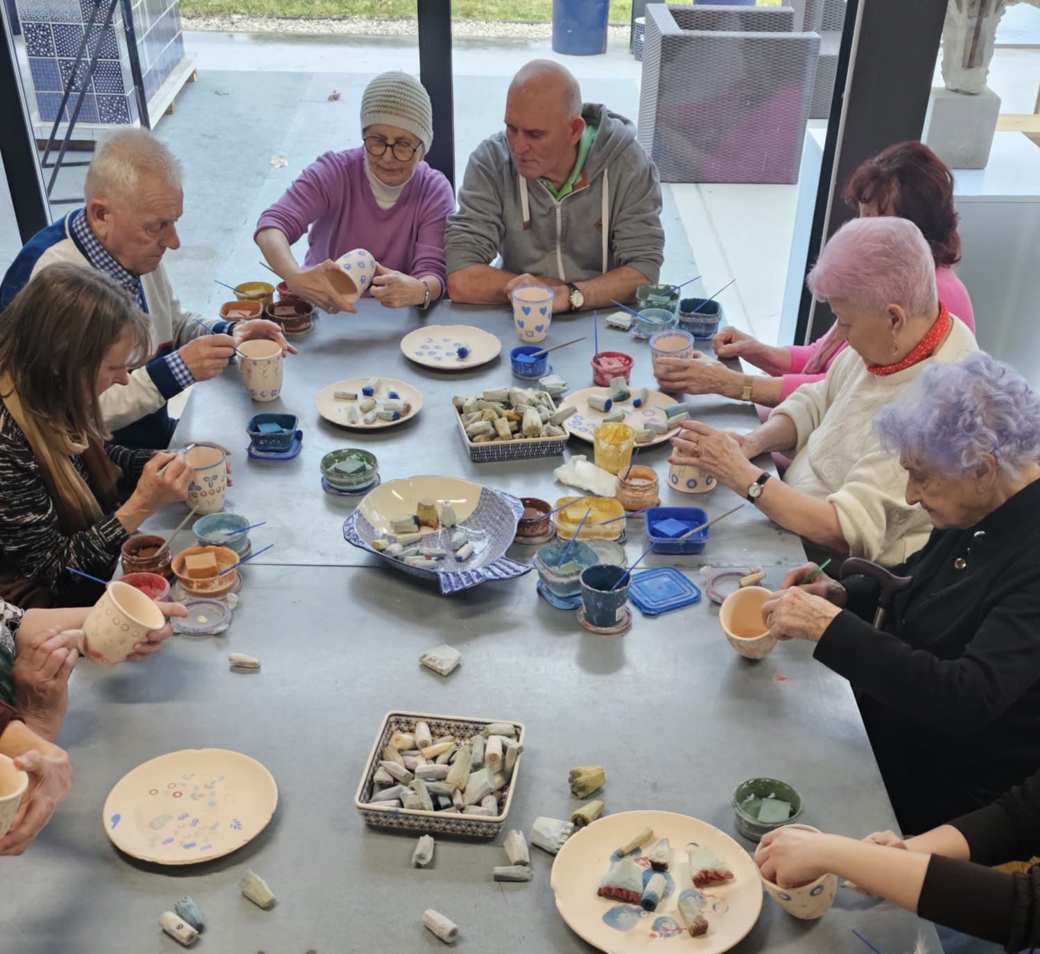 Odbyły się także kolejne warsztaty ceramiczne, których tematem było szkliwienie wypalonych naczyń. Po omówieniu przez prowadzącą procesu i technik szkliwienia (metoda nanoszenia szkliwa: zanurzanie oraz malowanie pędzlem) Seniorzy przystąpili do prac nad kolorystyką stworzonych przez siebie na poprzednich zajęciach aniołów oraz wazonów. Przygotowane tak prace zostały zabrane do pracowni na wypał końcowy. Przerwy pomiędzy warsztatami Seniorzy spędzali przy słodkim i owocowym poczęstunku we wspólnym gronie, który sprzyjał rozmowom i integracji grupy. Ponadto w ramach przerwy kawowej Seniorzy dwukrotnie wybrali się do pobliskiego Bistro na domowe wypieki, deserki, naleśniki, pyszną kawę i herbatę. W marcu Seniorzy uczestniczyli także w całodniowym wyjeździe do Muzeum Ceramiki w Bolesławcu. Wycieczka stanowiła uzupełnienie trwających warsztatów ceramicznych. Odwiedzając manufakturę w Bolesławcu Seniorzy zobaczyli z bliska, jak powstaje ceramika bolesławiecka oraz jak wygląda praca artystów i rzemieślników, którzy tworzą unikatowe wzory na ceramice. Dowiedzieli się także o tradycjach i technikach stosowanych przy wytwarzaniu ceramiki bolesławieckiej. Ponadto, uczestnicy projektu wzięli udział w warsztatach ceramicznych, podczas których samodzielnie ozdabiali wybrane przedmioty ceramiczne, tworząc osobistą pamiątkę pełną wspomnień.
