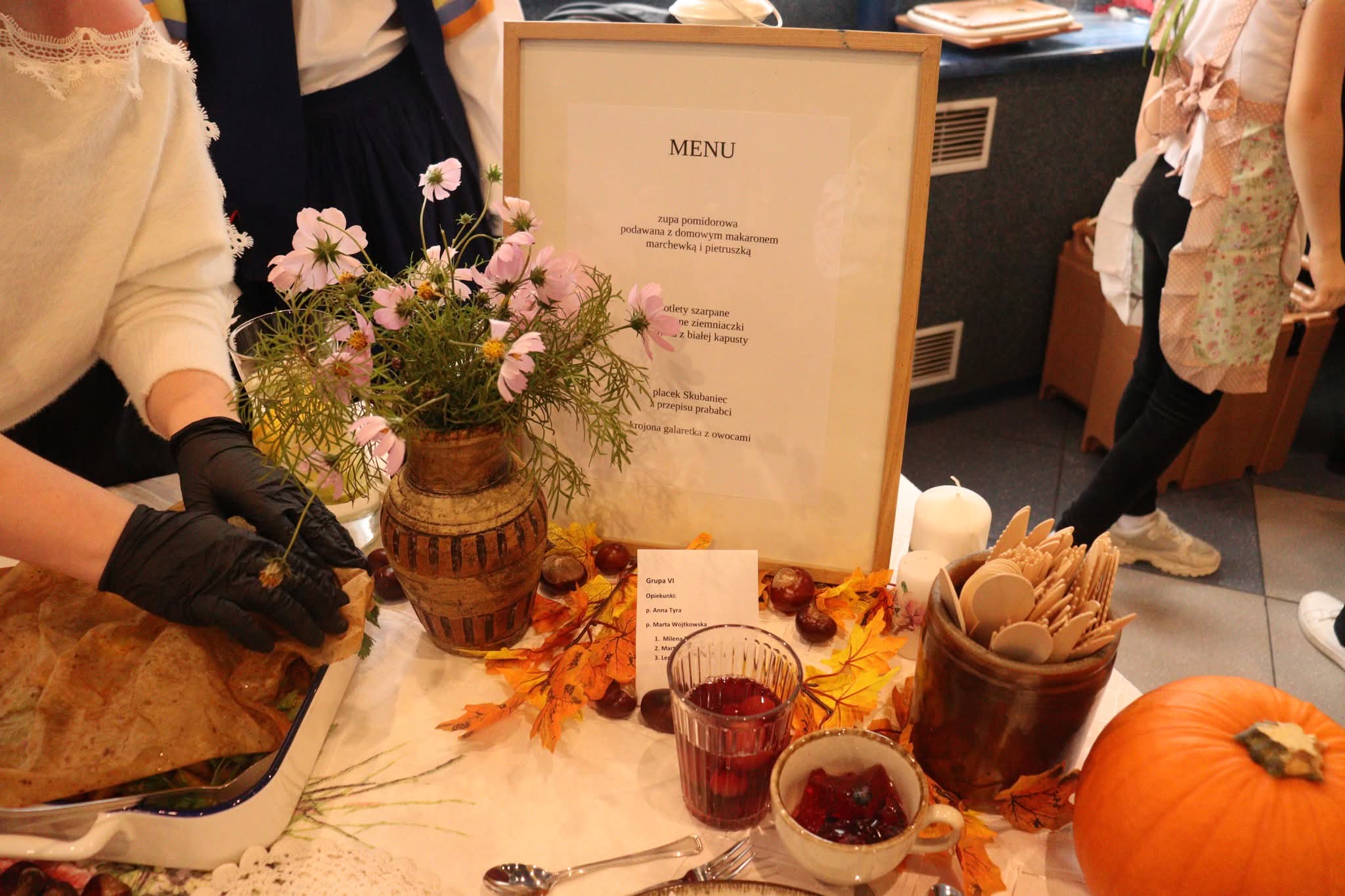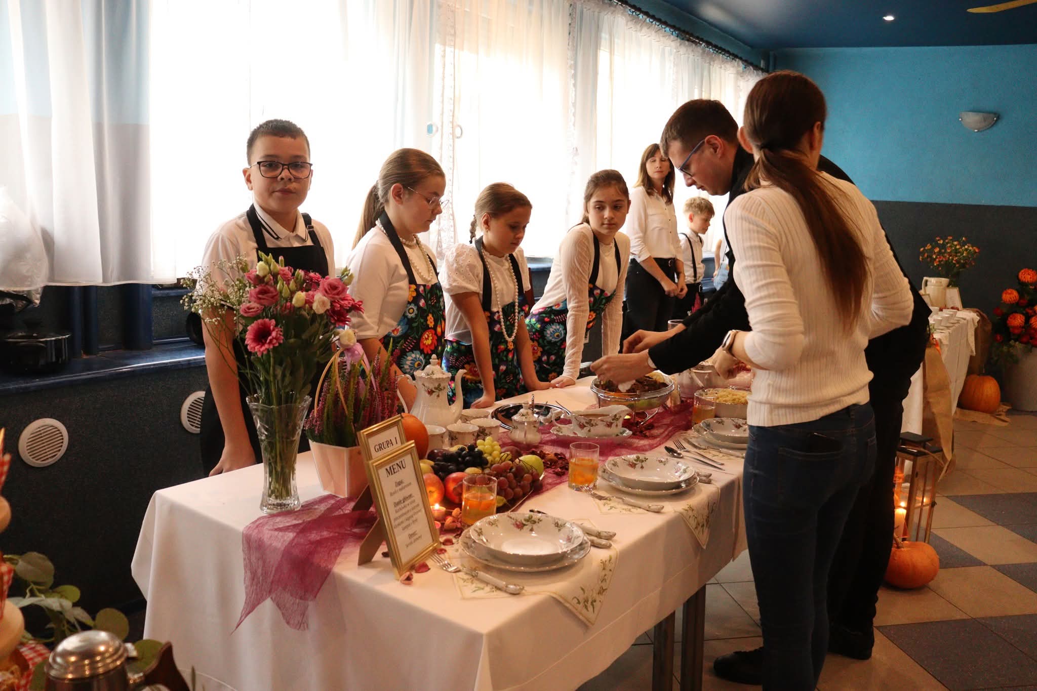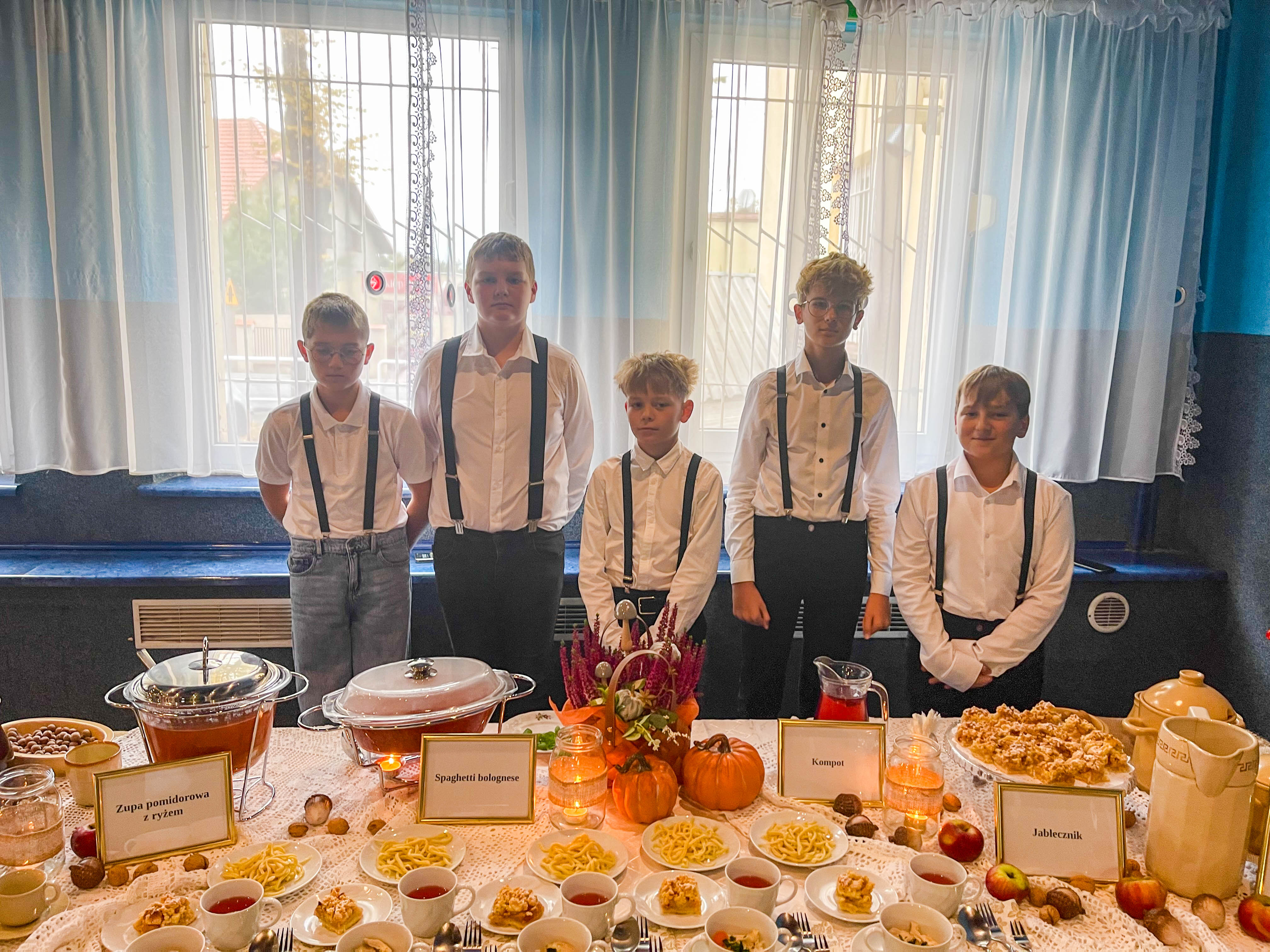 Grupa I, pod opieką pań Sylwii Goli, Beaty Misiek i Barbary Wiśniewskiej (uczestnicy: Blanka Kowalilak, Nikola Misiek, Filip Wiśniewski, Anna Gola), przygotowała tradycyjny rosół z lanymi kluskami, pieczeń z karkówki z ciemnym sosem i szarymi kluskami, surówkę z białej kapusty, kompot z dyni oraz sernik. Grupa II, której opiekunkami były panie Ivana Karliak i Olena Okhremchuk (uczestnicy: Artur Karliak, Andrej Okhremchuk, Dawid Usiak), zaserwowała rosół, kotlet schabowy z kością, pieczone ziemniaki, surówkę i deserki. Grupa III pod kierunkiem pań Karoliny Wodyńskiej, Urszuli Marczak i Katarzyny Nawrot (uczestnicy: Maja Marczak, Maja Wodyńska, Kamila Marczak, Dominika Wodyńska, Nadia Nawrot) zachwyciła jury rosołem, roladą z kluskami i surówką z czerwonej kapusty oraz pachnącą szarlotką. Grupa IV, pracująca pod opieką pań Weroniki Serafin, Katarzyny Kani i Hanny Rymus (uczestnicy: Lilianna Kania, Agata Stasiewska, Maja Czechlowska, Maria Serafin, Oliwia Rymus) przygotowała żurek, schab duszony z ziemniakami i surówką oraz kolorowe babeczki. Grupa V, prowadzona przez panie Emilię Rachulę i Ewelinę Klimecką (uczestnicy: Kacper Rachula, Konrad Klimecki, Jan Lipiński, Hubert Murawski, Stanisław Zimoch), postawiła na prostotę i smak – serwując zupę pomidorową z ryżem, makaron z sosem pomidorowym i jabłecznik. Natomiast Grupa VI, pod czujnym okiem pań Anny Tyry, Mazur i Marty Wojtkowskiej (uczestnicy: Milena Tyra, Marta Mazur, Lena Handrysik), przyrządziła zupę pomidorową z makaronem, kotlet „szarpany” z pieczonymi ziemniaczkami i surówką oraz aromatyczne ciasto ze śliwkami.