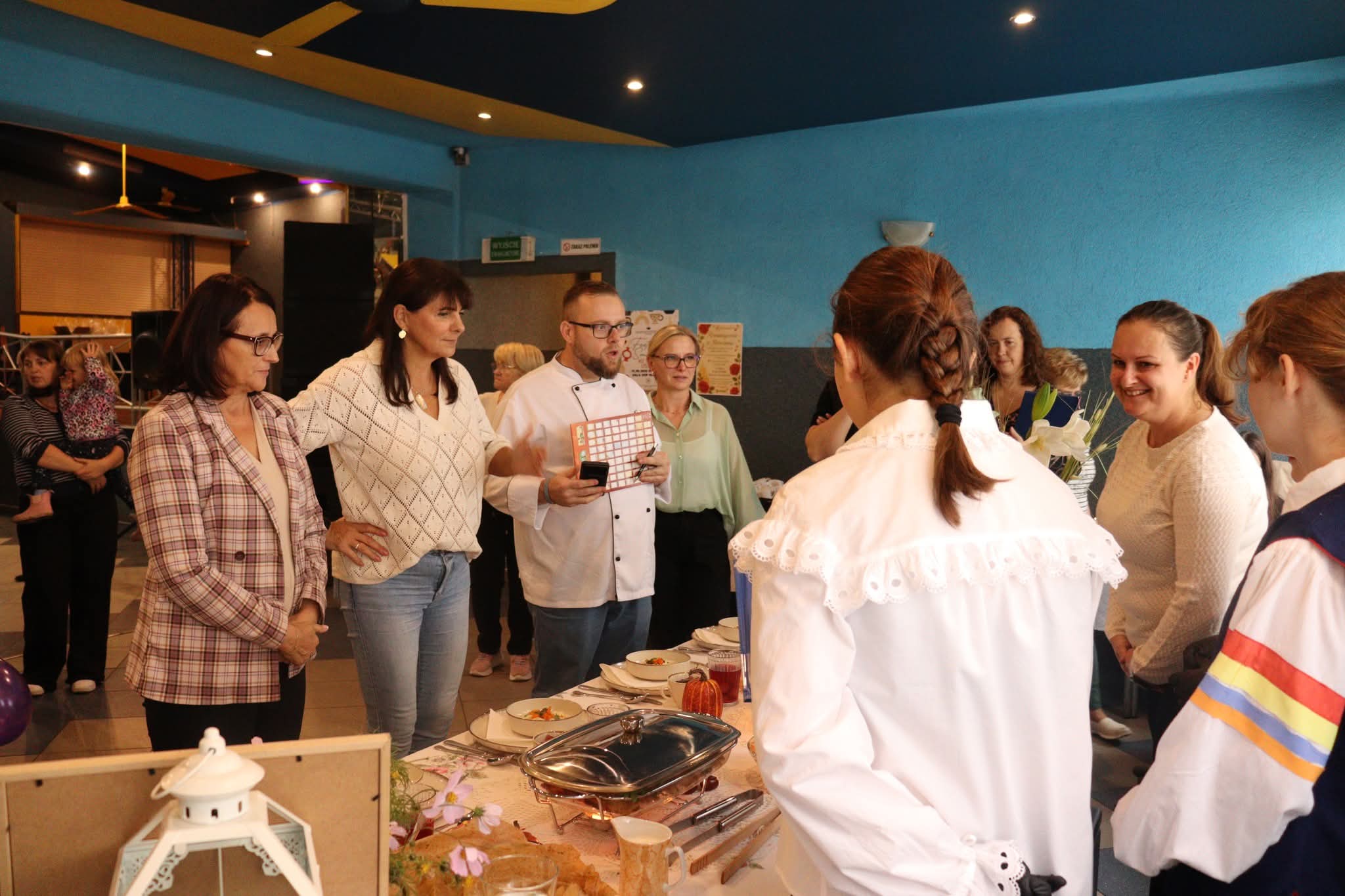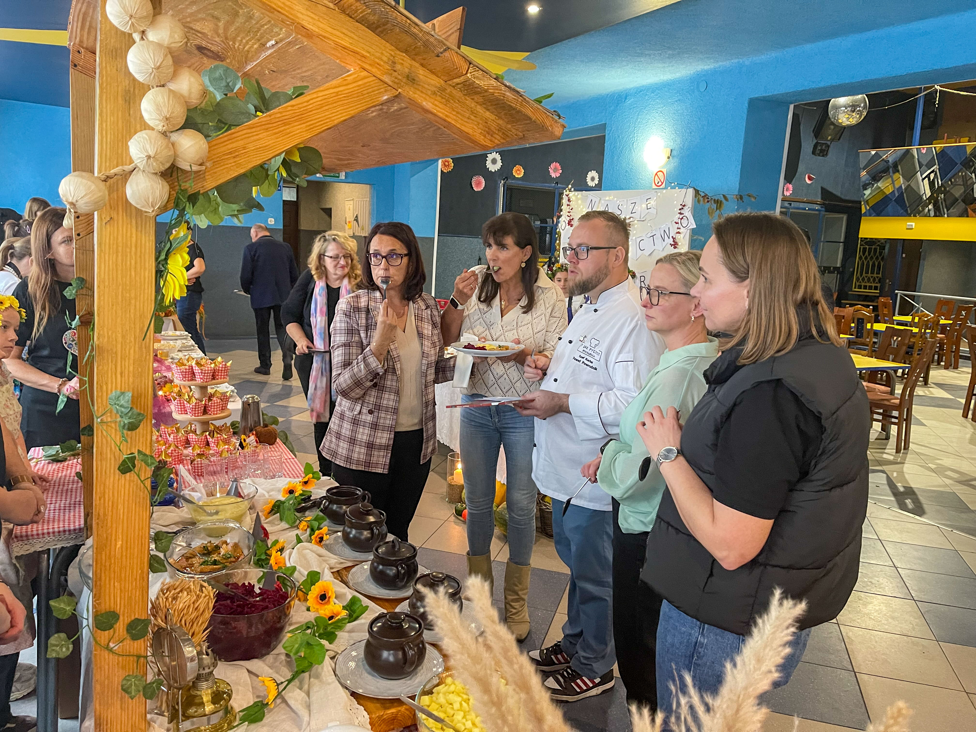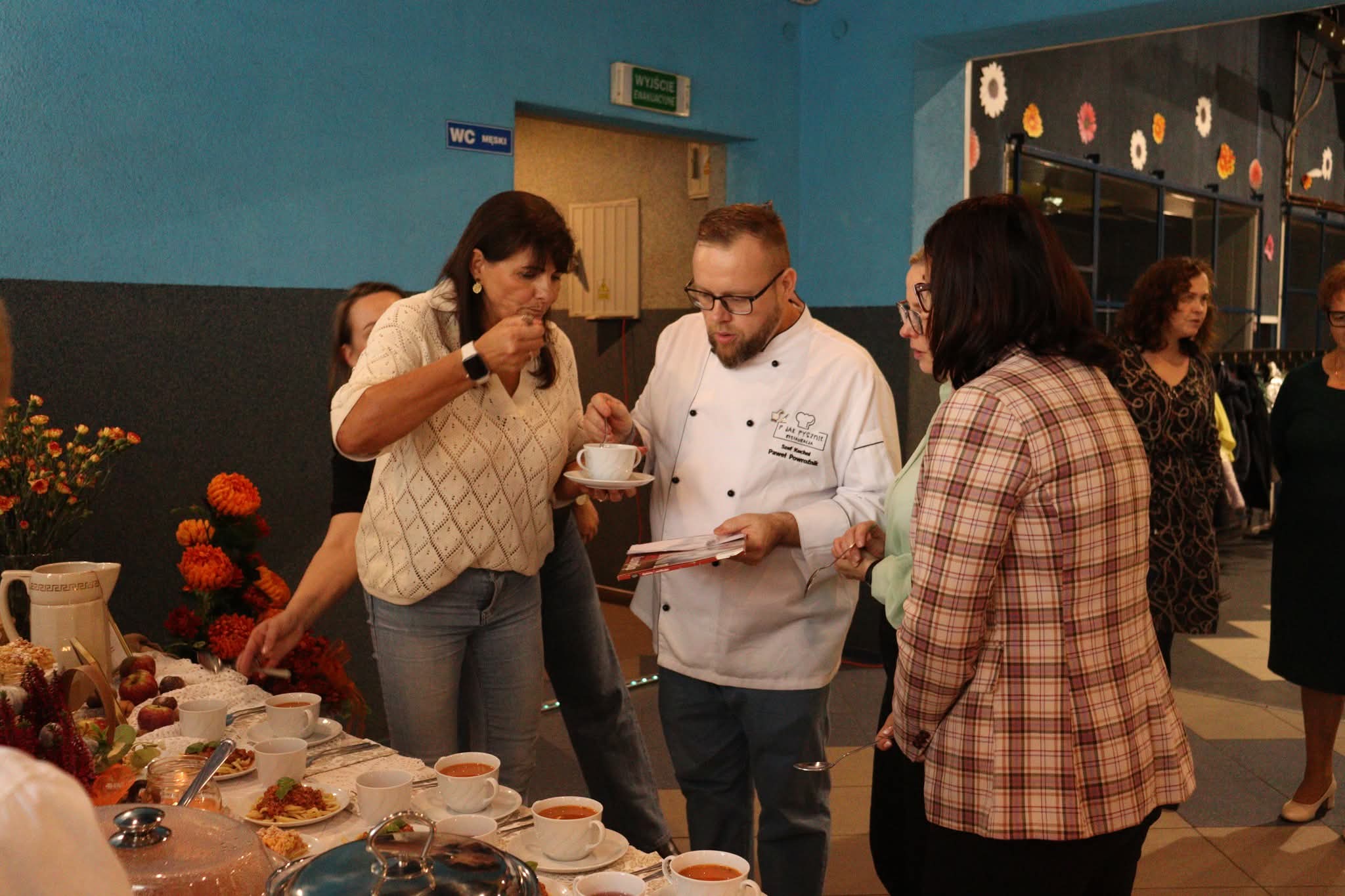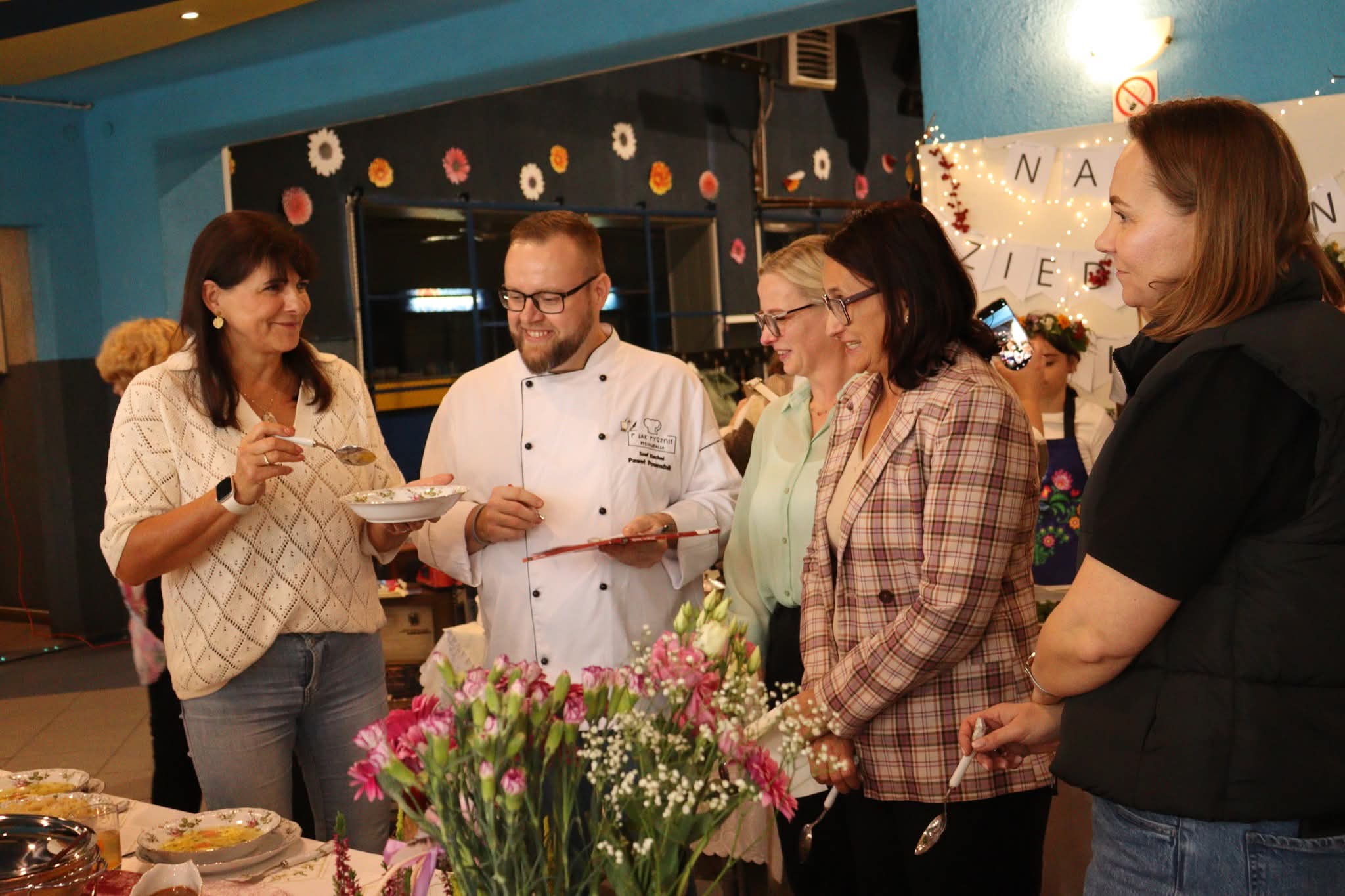 Na zakończenie nadszedł najbardziej oczekiwany moment – wspólna degustacja. Goście mogli skosztować przygotowanych potraw, delektując się smakiem domowych zup, pieczonych mięs i słodkich wypieków. W sali unosił się zapach tradycji, a rozmowom przy stole towarzyszył śmiech i radość ze wspólnego świętowania. Szczególnym wydarzeniem był również pokaz gotowania w wykonaniu pana Pawła Powroźnika.