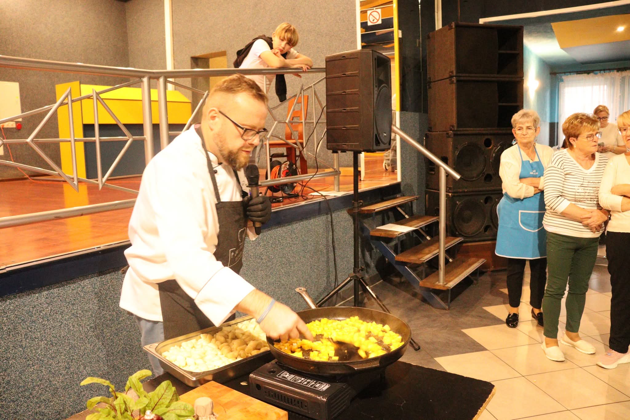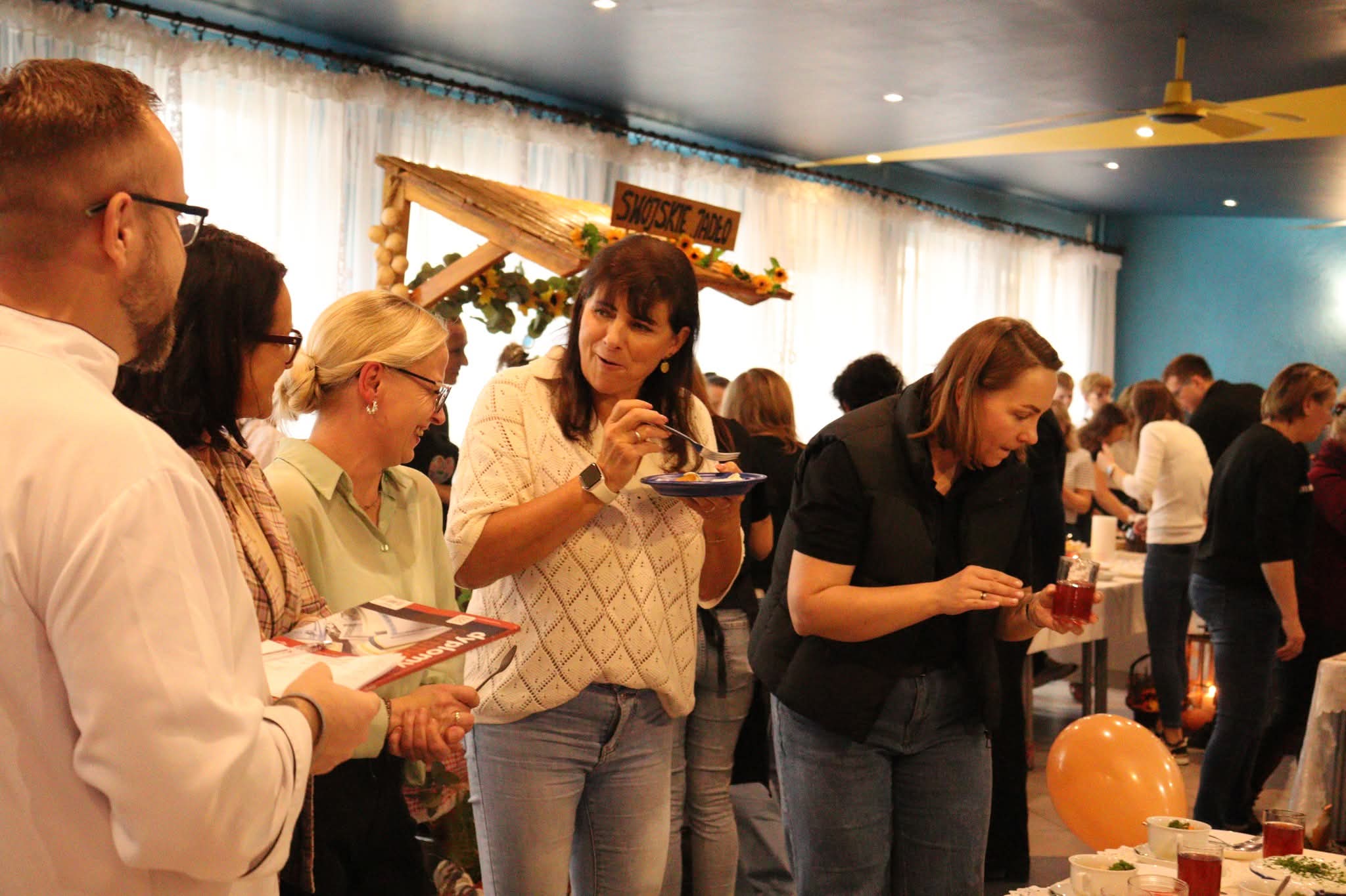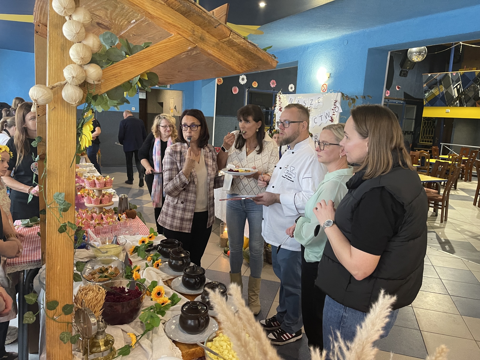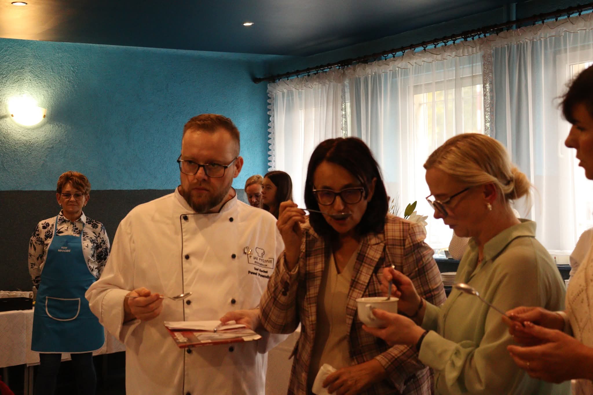 Na zakończenie nadszedł najbardziej oczekiwany moment – wspólna degustacja. Goście mogli skosztować przygotowanych potraw, delektując się smakiem domowych zup, pieczonych mięs i słodkich wypieków. W sali unosił się zapach tradycji, a rozmowom przy stole towarzyszył śmiech i radość ze wspólnego świętowania. Szczególnym wydarzeniem był również pokaz gotowania w wykonaniu pana Pawła Powroźnika.