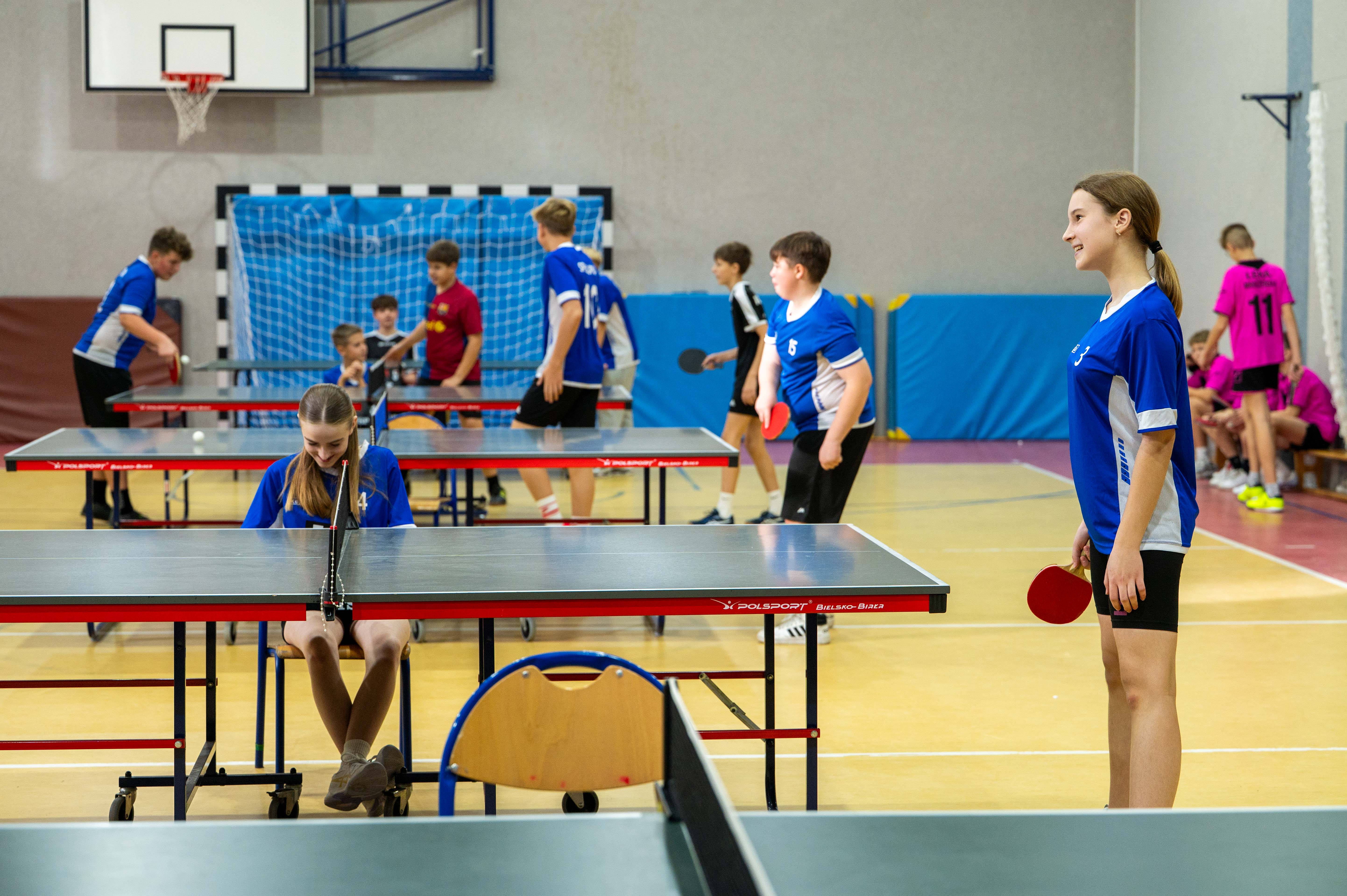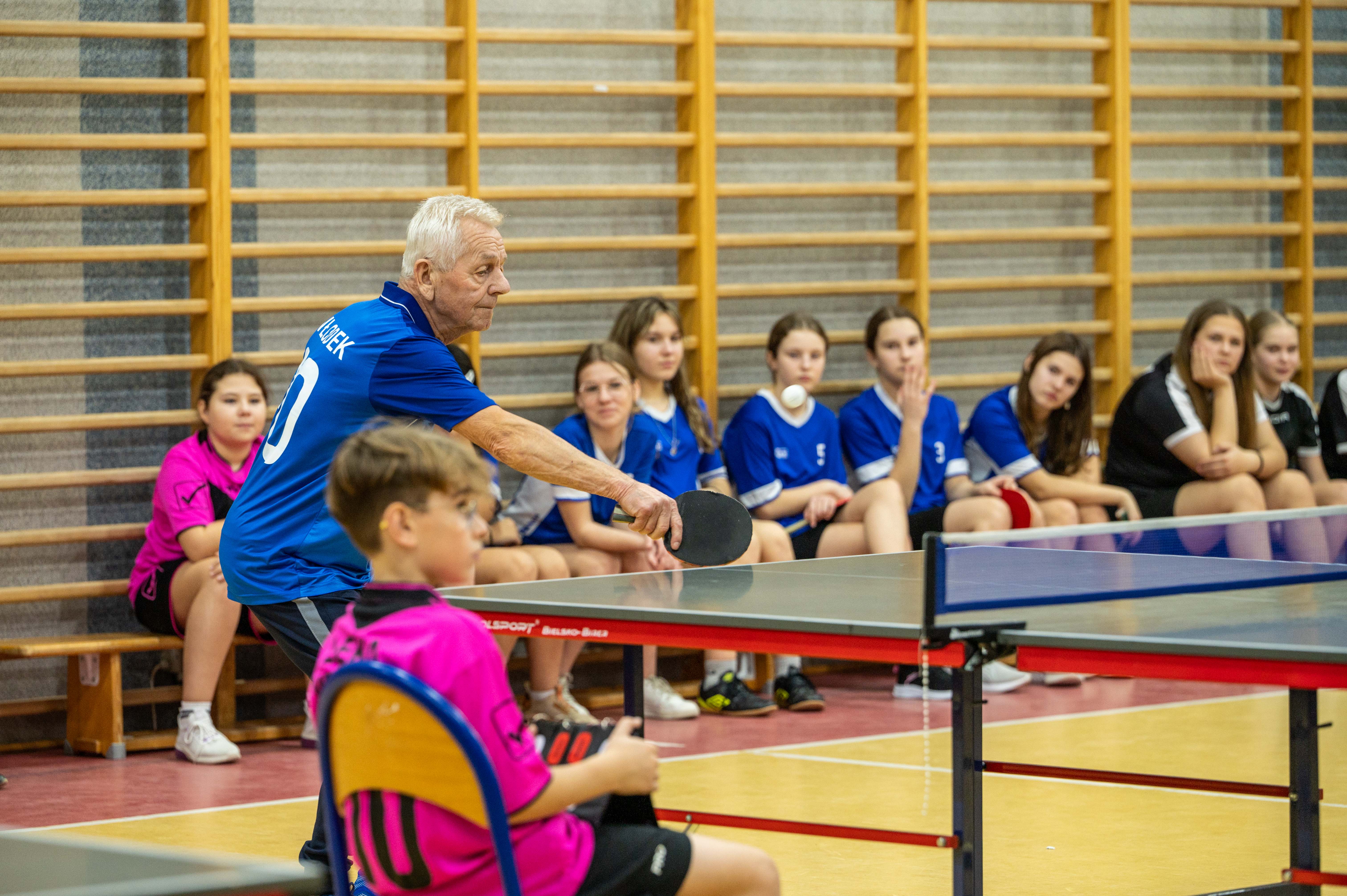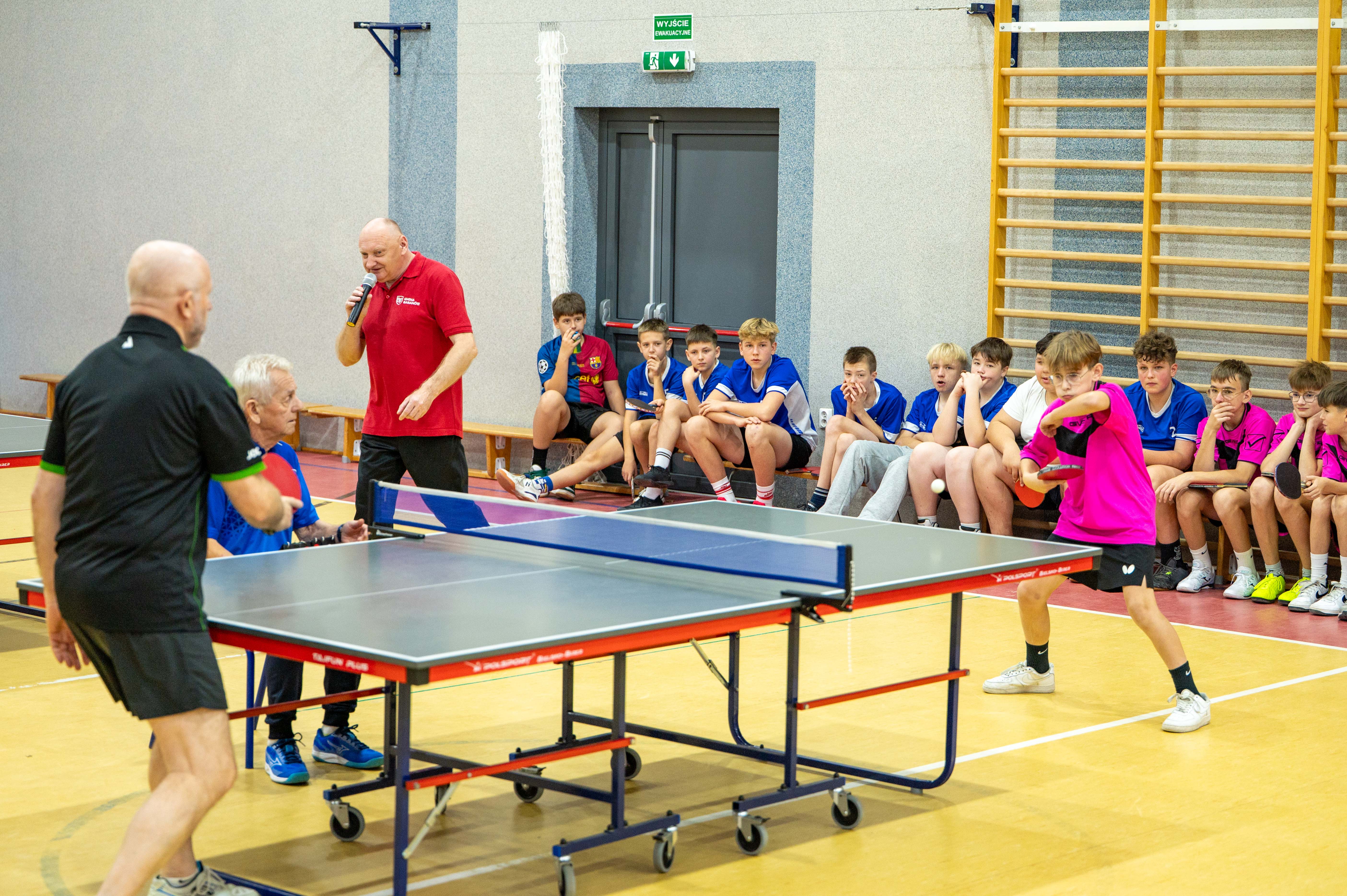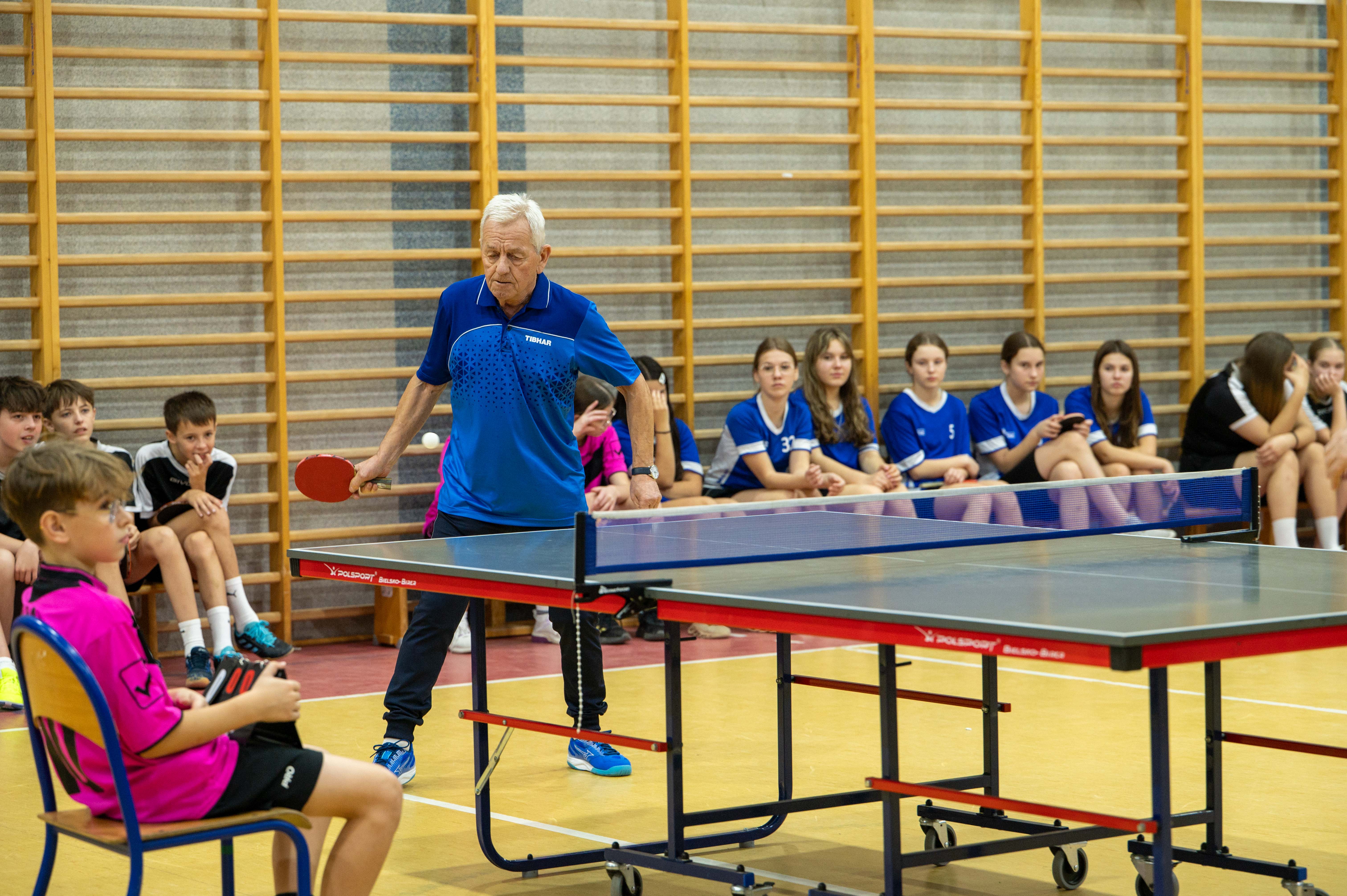 Regulamin zawodów animowanych przez Szkolny Związek Sportowy jest często uproszczeniem zasad rządzących grami profesjonalnymi. Dotyczy to również tenisa stołowego, albo …ping-ponga. Różnicę tę cierpliwie tłumaczył ekspert, gość specjalny naszego turnieju oraz sędzia główny w jednej osobie. - Ping-pong jest młodą dyscypliną sportu, która narodziła się na nowo zaledwie 14 lat temu w USA. Tam też, w 2011 roku zostały po raz pierwszy rozegrane Mistrzostwa Świata. W ping-pongu seta wygrywa osoba, która pierwsza zdobędzie 15 punktów. Przy stanie 14:14 wygra zawodnik który zdobędzie 15 punkt. Gra się do 2 wygranych setów. Turnieje rozgrywane są wyłącznie rakietkami oklejonymi papierem ściernym koloru niebieskiego lub szarego dostarczonymi przez organizatorów. Zawodnicy po zakończonym secie zmieniają strony stołu i wymieniają się rakietkami. Urozmaiceniem jest przepis, że raz w meczu można zmienić kolor piłki, co oznacza, że gra się tzw. „double point ball”. Może to zrobić serwujący, o ile nie zdobył w secie więcej niż 12 punktów. Jeżeli wygra tę piłkę, to dostaje 2 punkty, gdy przegra - przeciwnik otrzymuje jeden punkt. Cały mecz gra się pomarańczową piłką, a białą tylko „double point ball” – objaśniał Jan Kasendra. Lista triumfów Jana Kasendry jest iście bajkowa. - Moje największe sukcesy to: Mistrzostwo Polski Amatorów, kilka tytułów wicemistrza Polski Amatorów, kilka 3. miejsc w Mistrzostwach Polski Amatorów, 3. miejsce w kategorii open powyżej 50 lat z udziałem zawodowców. Natomiast wśród profesjonalistów najwyżej cenię sobie: brązowy medal w Mistrzostwach Polski Masters w grze podwójnej, 2 miejsce w Grand Prix Polski Masters w Międzyzdrojach, 2. Miejsce w Grand Prix Polski Masters w Węgierskiej Górce i kilka trzecich miejsc w cyklu rozgrywek Grand Prix Polski Masters. Z imprez o randze międzynarodowej najlepsze wyniki to: 9. miejsce w Mistrzostwach Europy w grze mieszanej, 17. miejsce w grze podwójnej w Mistrzostwach Europy w Sandefjord w Norwegii (w grupie pokonaliśmy Niemców, późniejszych wicemistrzów Europy).