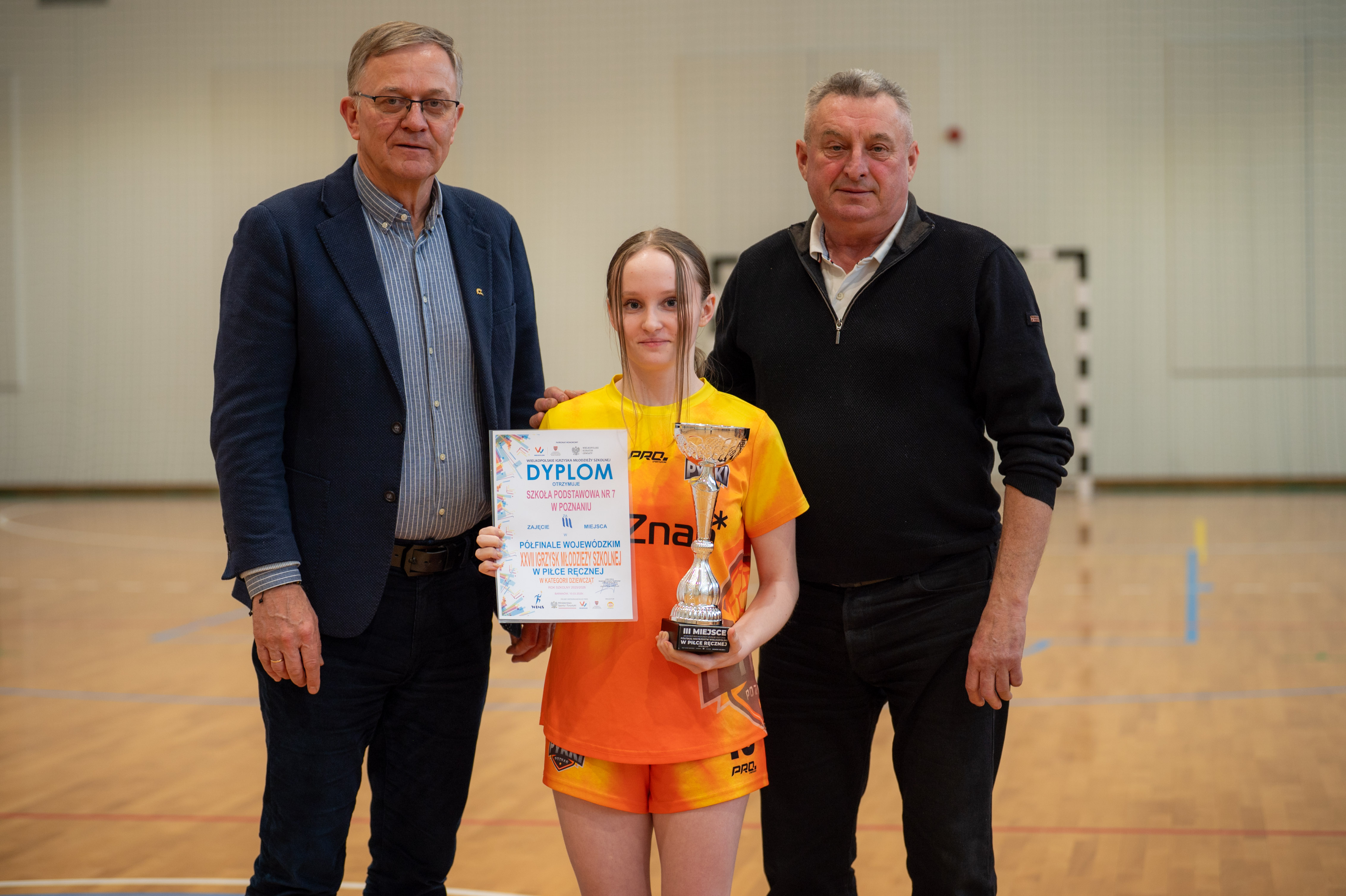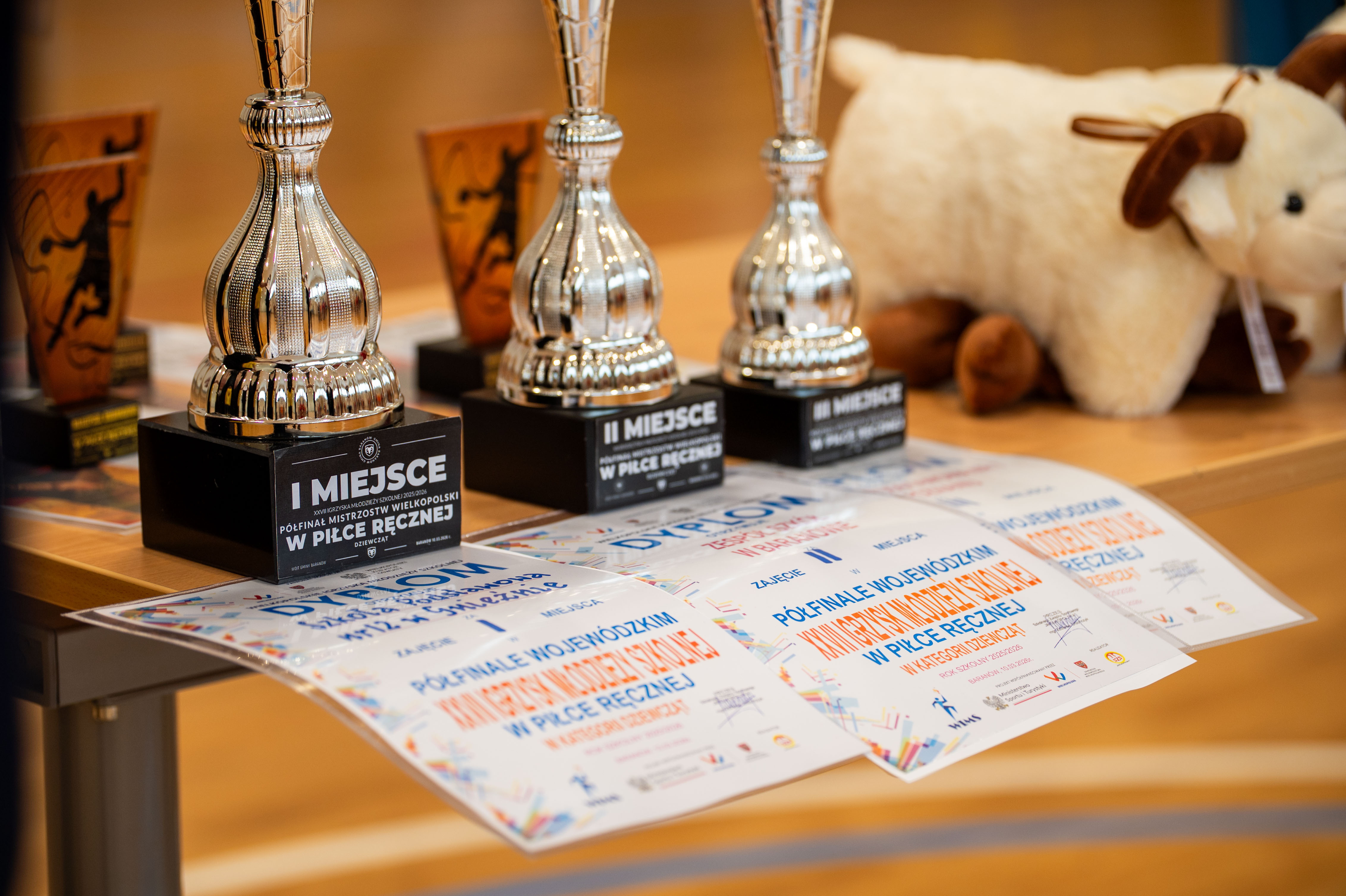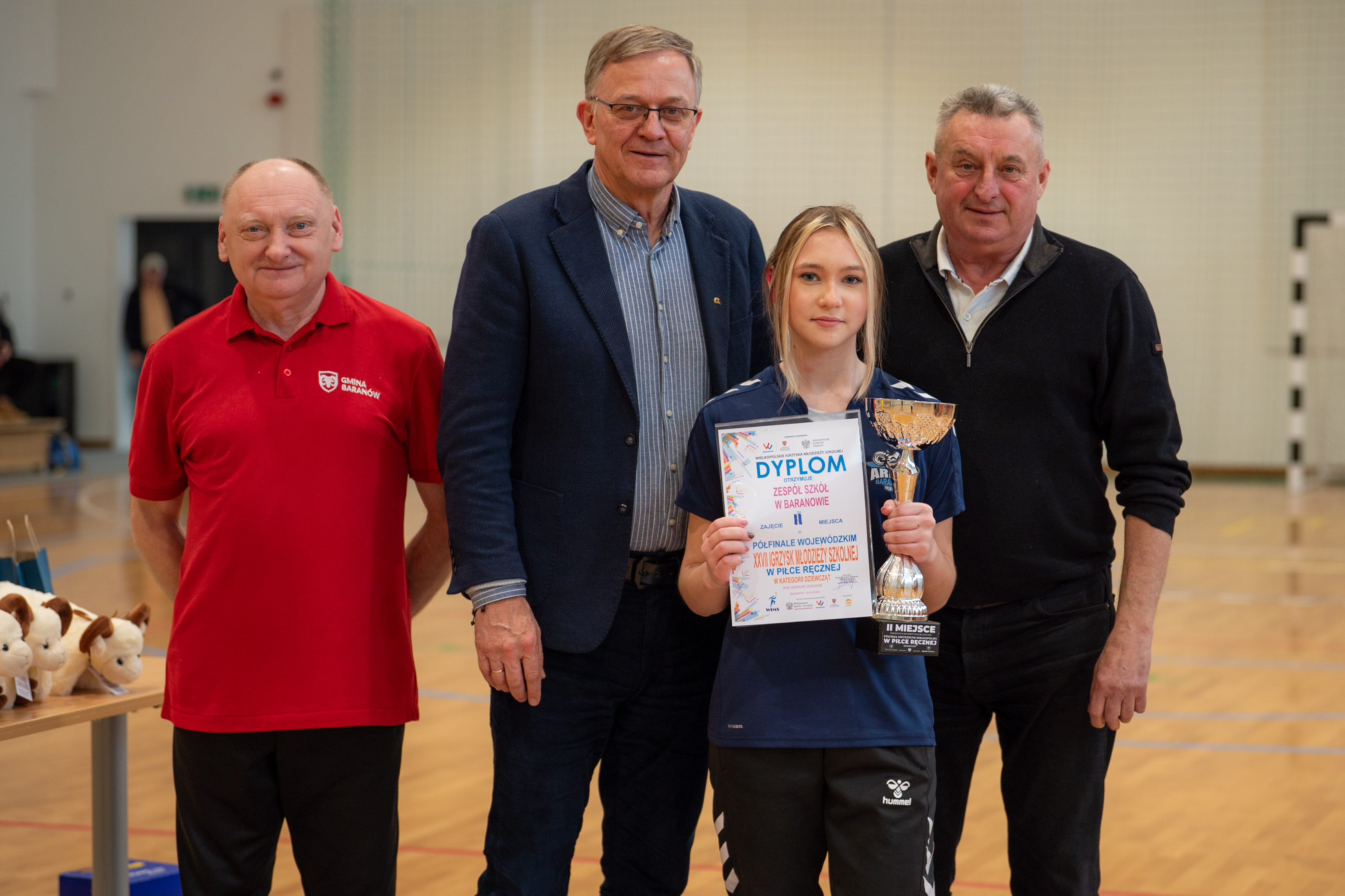 Wybudowana przed czterema laty baranowska hala sportowa po raz pierwszy gościła turniej rangi półfinału województwa. Decyzji o powierzeniu Baranowowi tego prestiżowego zadania z pewnością pomógł fakt, iż reprezentacja miejscowej szkoły wywalczyła awans do tej imprezy. Handbalistki ze szkoły w Baranowie na co dzień grają w barwach „Aries”, najmłodszego klubu sportowego w powiecie. Udział w baranowskim Półfinale to jak do tej pory największy sukces podopiecznych Pauliny Leszczyńskiej. Tym razem poprzeczka zawieszona została jeszcze wyżej. Szczypiornistki z Baranowa musiały stawić czoła trzem czołowym zespołom w Wielkopolsce (Przykona: trener Rafał Łukasik, Poznań: trener Tomasz Draszkiewicz, Gniezno: p. trener Martyna Bigoszewska-Jackowiak, Baranów: p. trener Paulina Leszczyńska), a tylko dwa z nich mogły zameldować się w Finale Wojewódzkim. Gospodarze starali się sprostać prestiżowemu zadaniu, jakim była organizacja takiego Turnieju. Uczestnicy zawodów, a niektórzy z nich dotarli przecież do południowych „Wrót Wielkopolski” po kilkugodzinnej podróży, podjęci zostali śniadaniem. Na zawodniczki oraz ich opiekunów czekała herbata i smaczne kanapki. Punktualnie o godz. 10.00, po prezentacji drużyn w iście olimpijskim stylu, Turniej otworzyła p. wójt Bogumiła Lewandowska-Siwek. Już pierwszy mecz pokazał, kto w tym Turnieju może grać pierwsze skrzypce. Drużyna z Gniezna rozbiła rywalki z Przykony, wbijając im aż 19 goli, a tracąc tylko jednego. Następny mecz rozgrzał publiczność do czerwoności. Poznanianki kilka razy uciekały Baranowiankom na kilka punktów, ale w sześciu kluczowych momentach zadrżały im ręce i kolana. Z trzech najtrudniejszych w trakcie regulaminowego czasu prób dla bramkarki, jakimi są rzuty karne, Kasia Garyga, golkiperka Baranowa, wyszła zwycięsko. Co więcej, w serii rzutów karnych ani razu nie dała się pokonać! Po zwycięstwie z Przykoną, baranowianki złożyły swój sportowy los w ręce rywalek z Poznania i Gniezna. Poznanianki, by myśleć o awansie, musiały wygrać z Gnieznem. I tej przeszkody nie udało im się pokonać. Baranowskiemu turniejowi patronował olimpijski duch fair play. Żywiołowi kibice wspierali jak tylko mogli swój zespół, ale nagradzali również udane akcje pozostałych teamów. Ceremonia wręczenia nagród, ufundowanych przez wójta Gminy Baranów (puchary, dyplomy, statuetki oraz niecodzienne upominki dla najlepszych zawodniczek – bramkarki, MVP oraz snajperki) miała więc fantastyczną oprawę. Każda z wyróżnionych szczypiornistek wzbogaciła swoją kolekcję trofeów o maskotkę, urokliwego Baranka – Franka. Po zmaganiach sportowych na wszystkich uczestników turnieju czekał zaś smaczny obiad (ems).