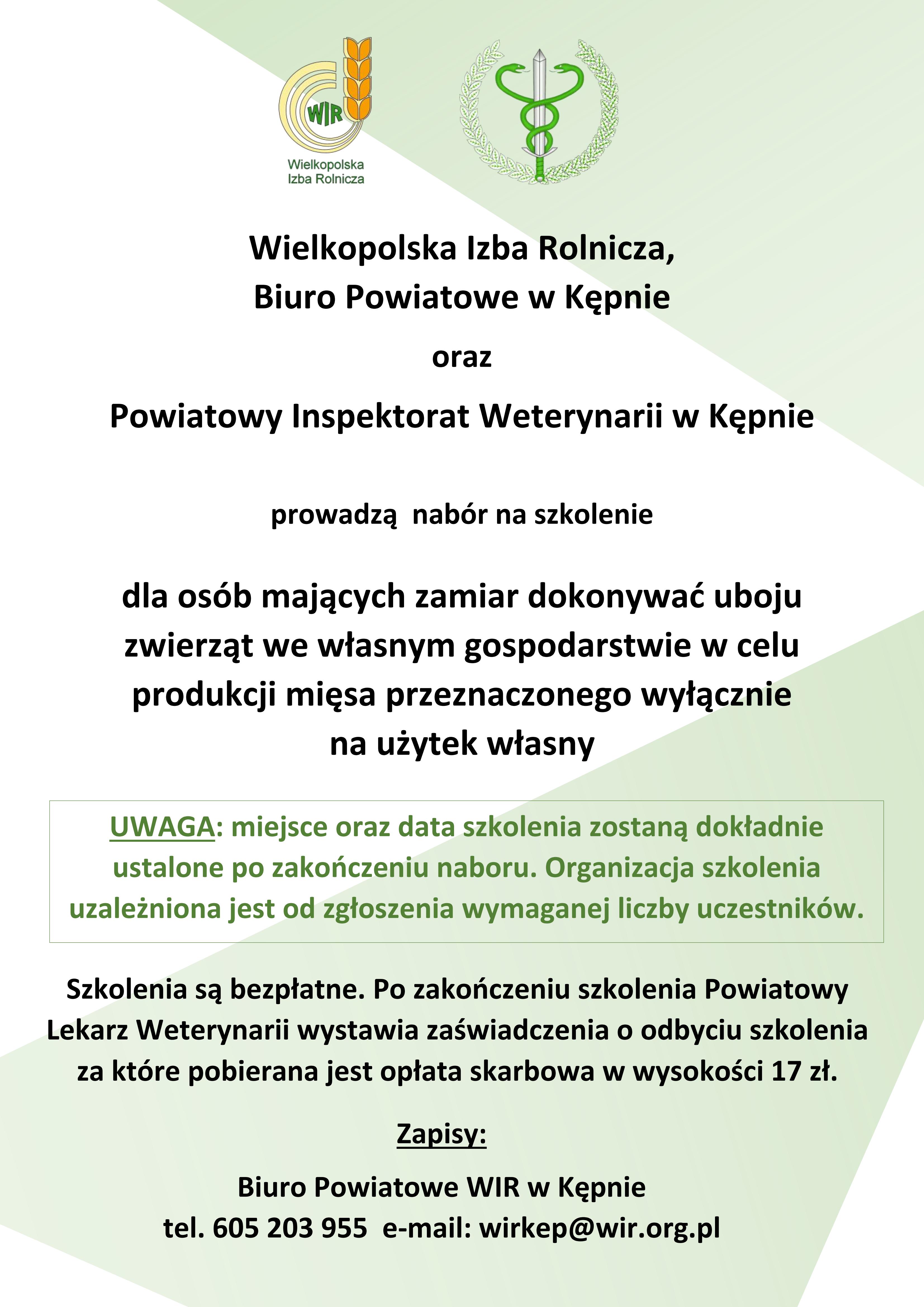 Wielkopolska Izba Rolnicza, Biuro Powiatowe w Kępnie oraz Powiatowy Inspektorat Weterynarii w Kępnie prowadzą nabór na szkolenie dla osób mających zamiar dokonywać uboju zwierząt we własnym gospodarstwie w celu produkcji mięsa przeznaczonego wyłącznie na użytek własny.