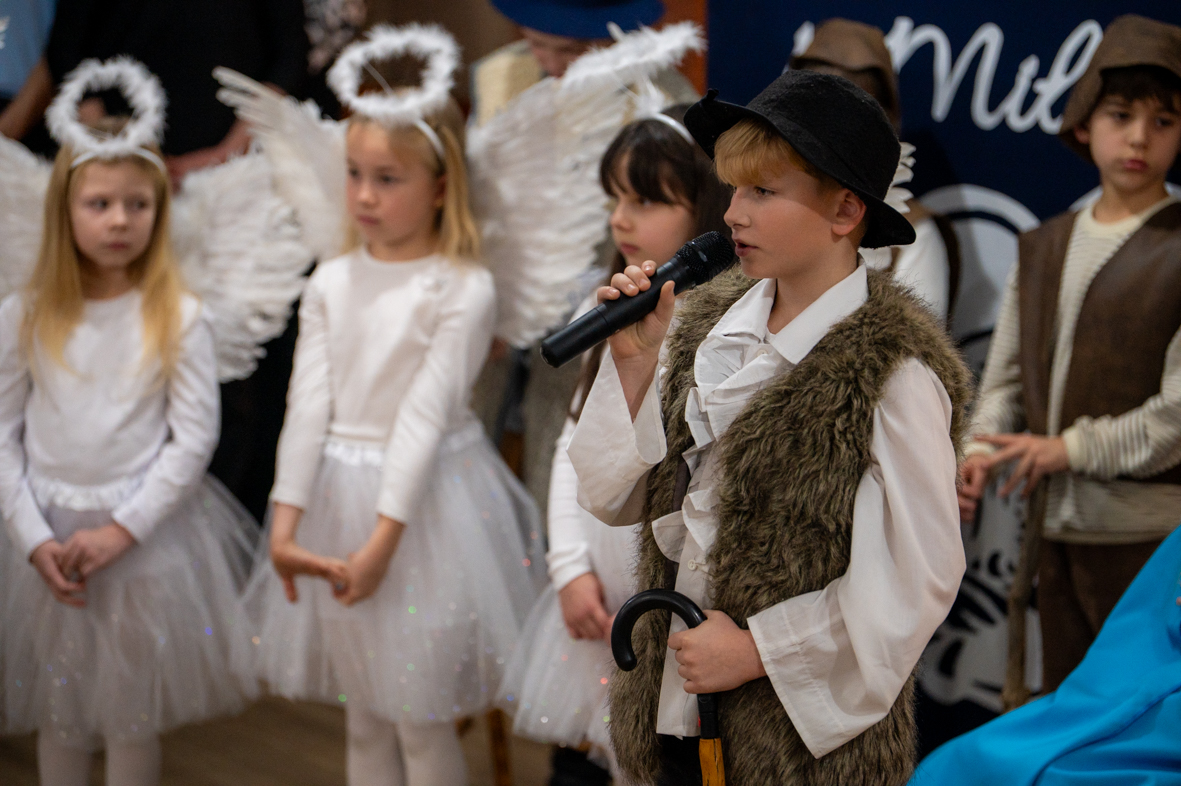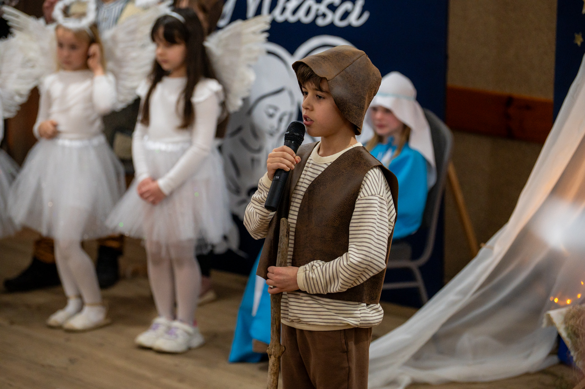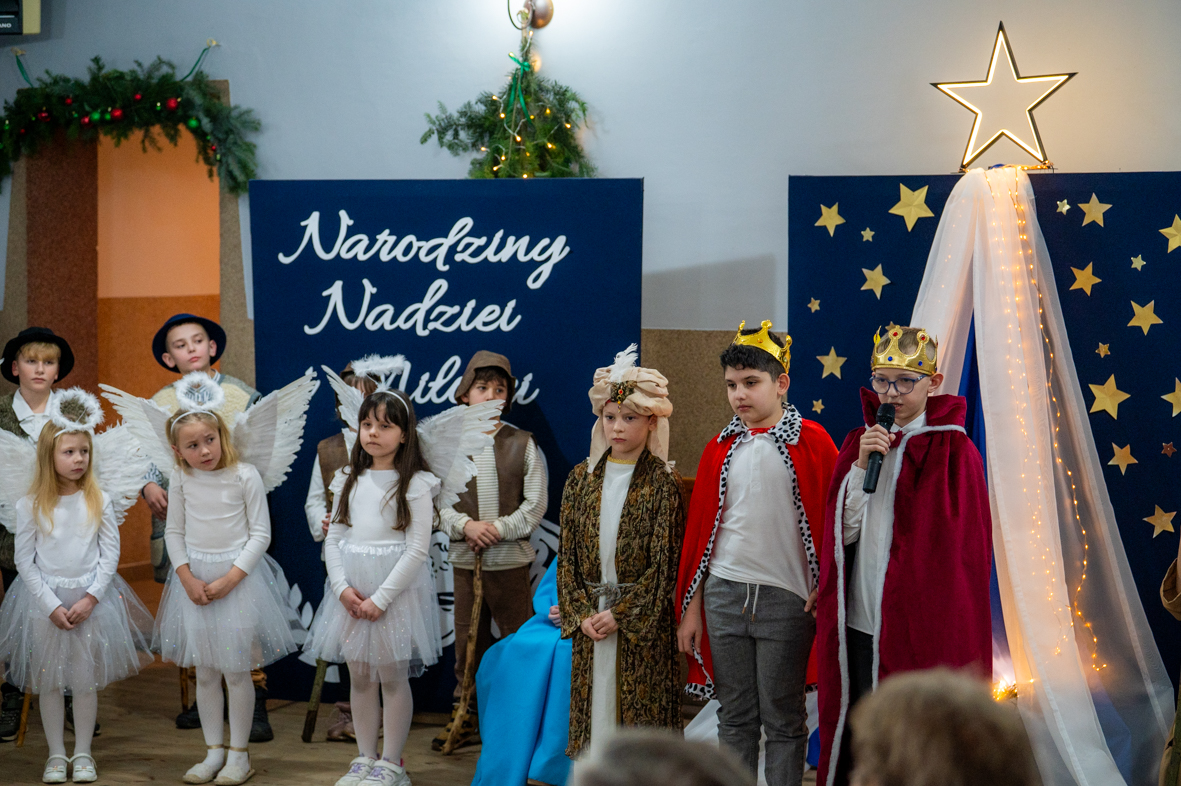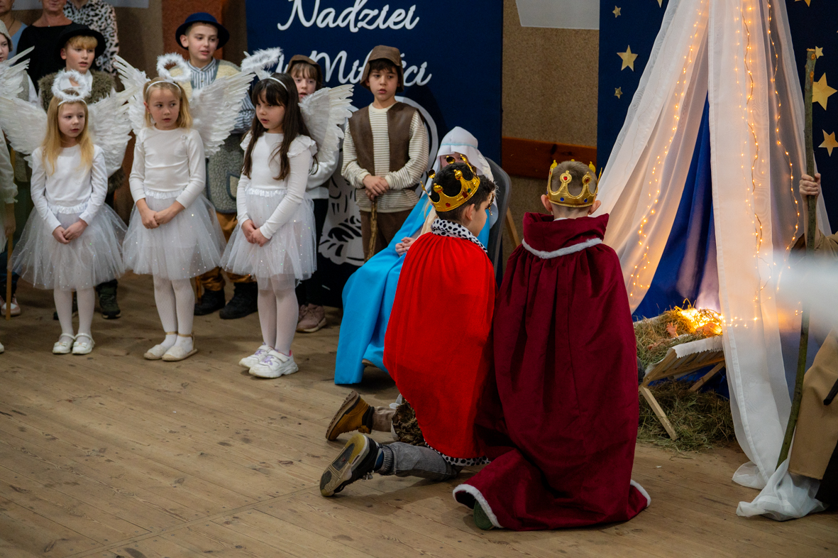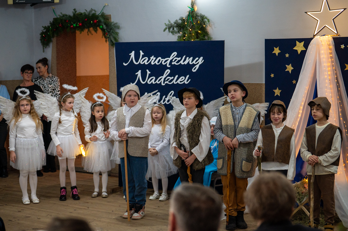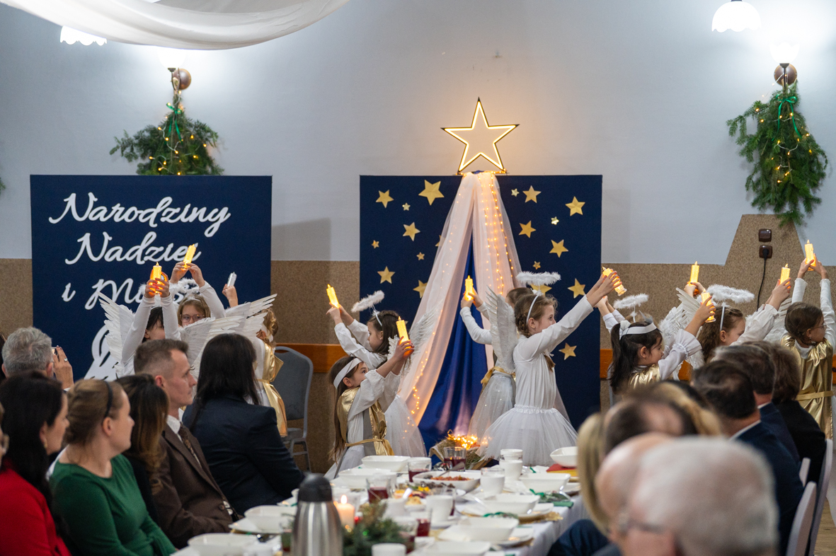 Cytowany na wstępie C.K. Norwid wspominał o Wspólnym Gnieździe, a Nasze Gniazdo to Gminna Wspólnota. I tak wszyscy spotkali się przy symbolicznym świątecznym stole. Powitali ich mali artyści, którzy przygotowali świąteczne widowisko. Witamy serdecznie wszystkich gości, / wszystkich co dziś są pełni radości, / Tych, co przyszli z nadzieją w sercu, / że coś pięknego zobaczą - Ta zachęta popłynęła ze strony aktorów z szkoły w Łęce Mroczeńskiej, którzy zaprezentowali spektakl wyreżyserowany przez Andżelikę Marcinkowską, Henrykę Orszulak oraz Annę Raszewską. Oprawę muzyczną stworzył Andrzej Ciurys. Choć lata lecą i płyną wieki, / Choć nas oddziela dziś czas daleki / Od tamtych czasów gdy w Betlejem/Pan Bóg zstąpił do nas na ziemię / Chcemy te wydarzenia uczcić przedstawieniem.