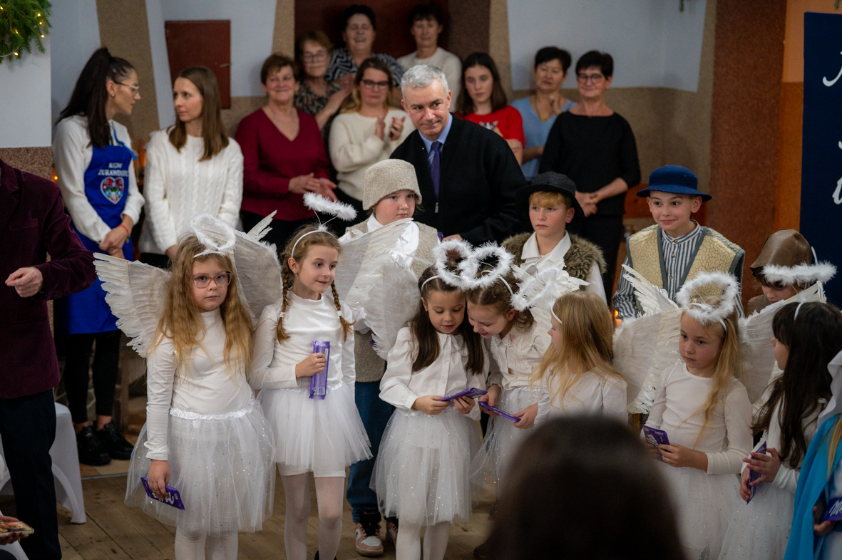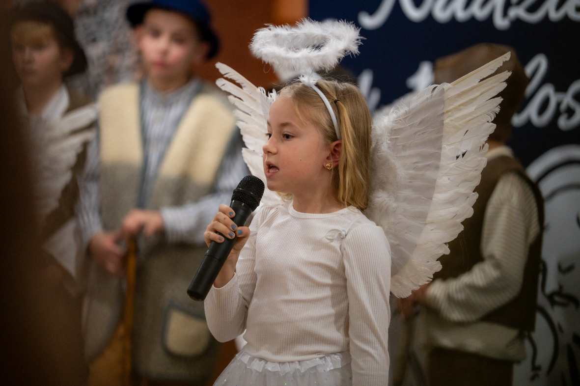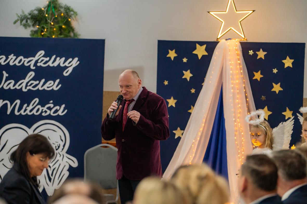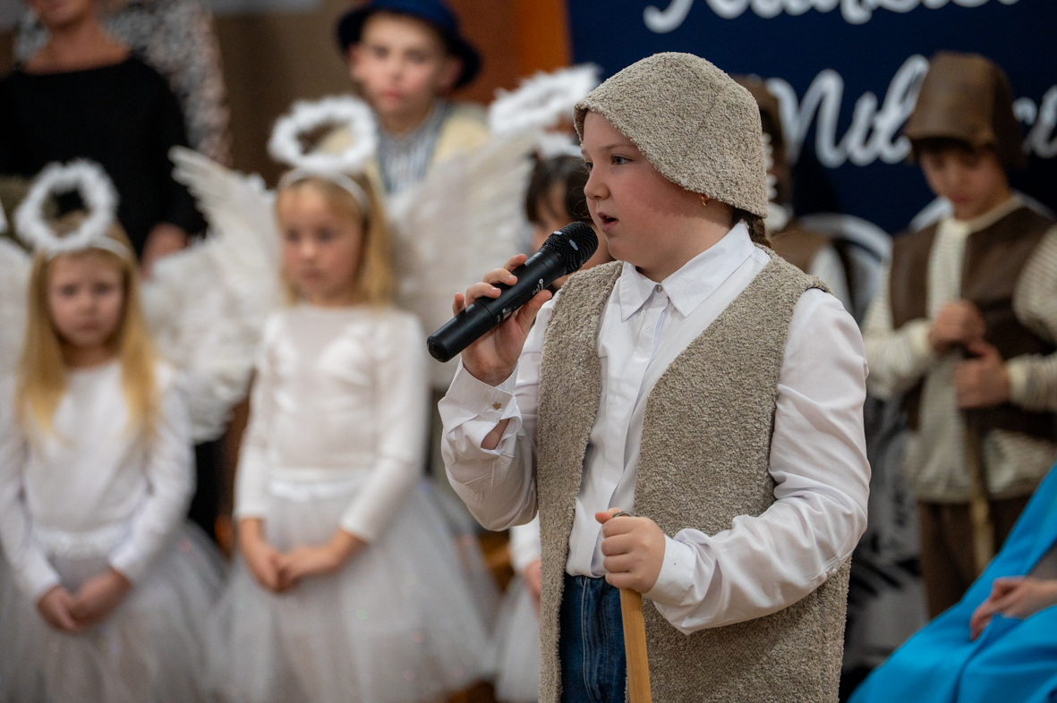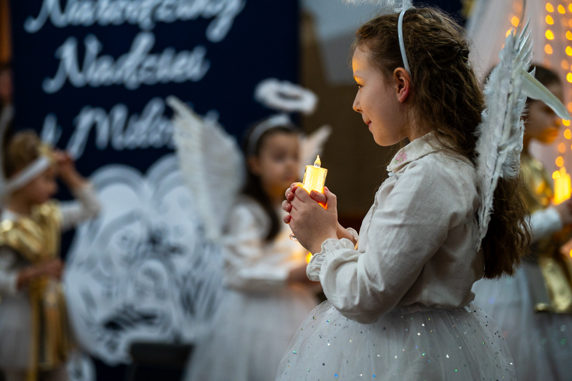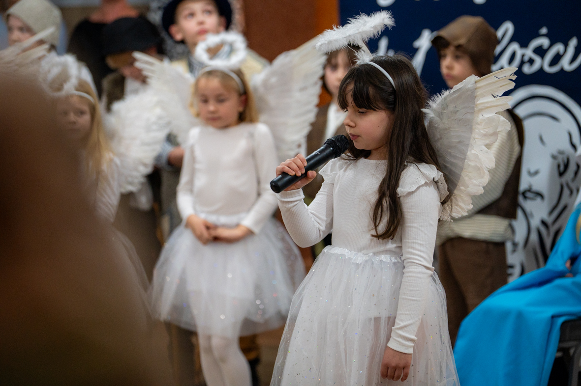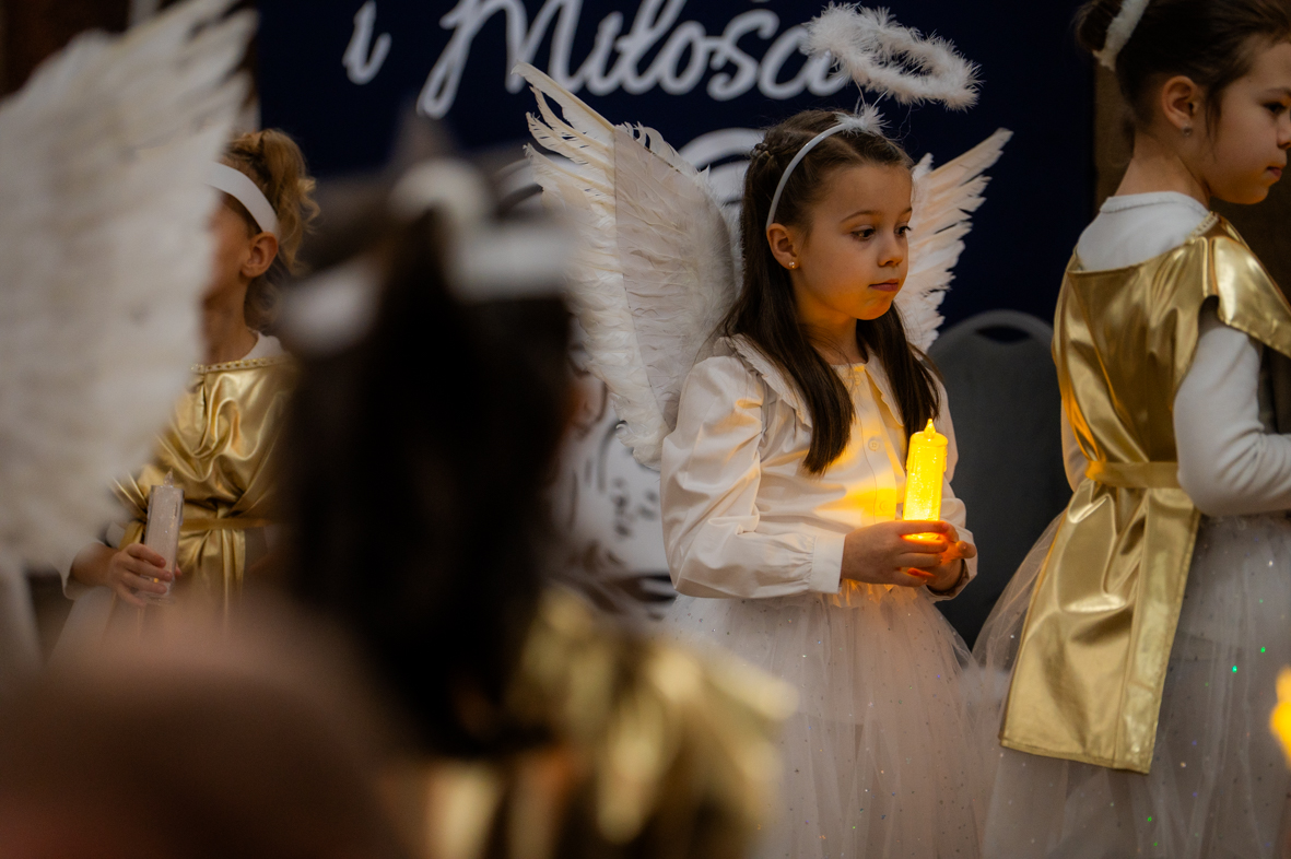 Cytowany na wstępie C.K. Norwid wspominał o Wspólnym Gnieździe, a Nasze Gniazdo to Gminna Wspólnota. I tak wszyscy spotkali się przy symbolicznym świątecznym stole. Powitali ich mali artyści, którzy przygotowali świąteczne widowisko. Witamy serdecznie wszystkich gości, / wszystkich co dziś są pełni radości, / Tych, co przyszli z nadzieją w sercu, / że coś pięknego zobaczą - Ta zachęta popłynęła ze strony aktorów z szkoły w Łęce Mroczeńskiej, którzy zaprezentowali spektakl wyreżyserowany przez Andżelikę Marcinkowską, Henrykę Orszulak oraz Annę Raszewską. Oprawę muzyczną stworzył Andrzej Ciurys. Choć lata lecą i płyną wieki, / Choć nas oddziela dziś czas daleki / Od tamtych czasów gdy w Betlejem/Pan Bóg zstąpił do nas na ziemię / Chcemy te wydarzenia uczcić przedstawieniem.