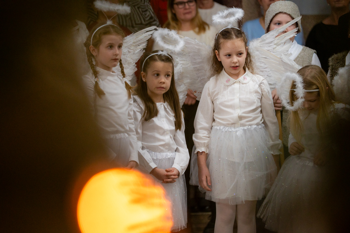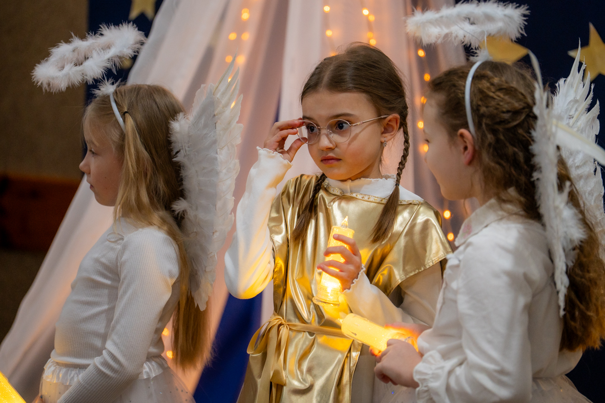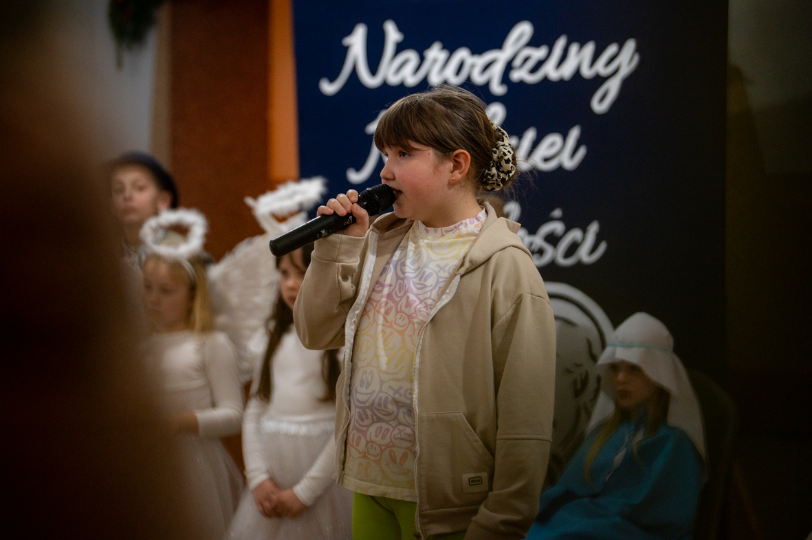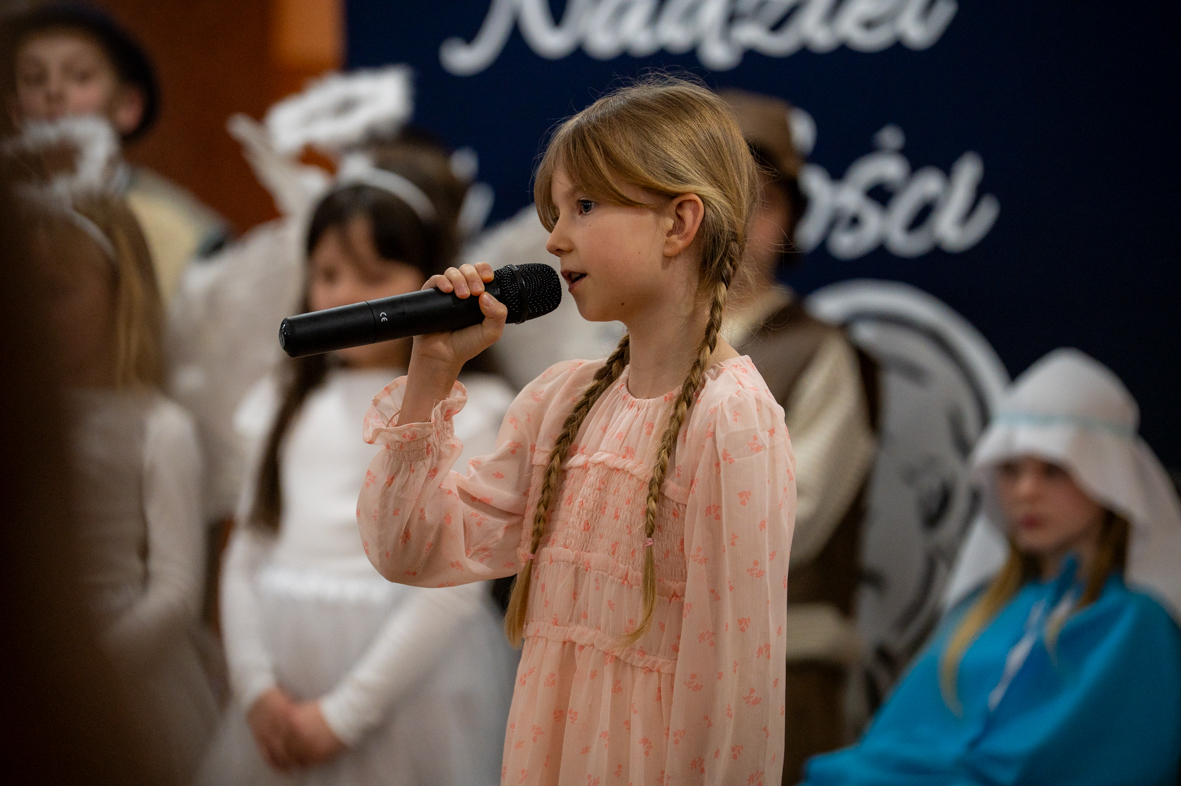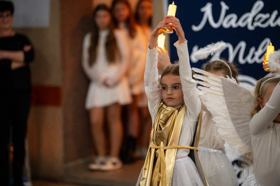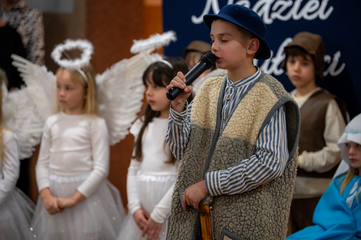 Cytowany na wstępie C.K. Norwid wspominał o Wspólnym Gnieździe, a Nasze Gniazdo to Gminna Wspólnota. I tak wszyscy spotkali się przy symbolicznym świątecznym stole. Powitali ich mali artyści, którzy przygotowali świąteczne widowisko. Witamy serdecznie wszystkich gości, / wszystkich co dziś są pełni radości, / Tych, co przyszli z nadzieją w sercu, / że coś pięknego zobaczą - Ta zachęta popłynęła ze strony aktorów z szkoły w Łęce Mroczeńskiej, którzy zaprezentowali spektakl wyreżyserowany przez Andżelikę Marcinkowską, Henrykę Orszulak oraz Annę Raszewską. Oprawę muzyczną stworzył Andrzej Ciurys. Choć lata lecą i płyną wieki, / Choć nas oddziela dziś czas daleki / Od tamtych czasów gdy w Betlejem/Pan Bóg zstąpił do nas na ziemię / Chcemy te wydarzenia uczcić przedstawieniem.