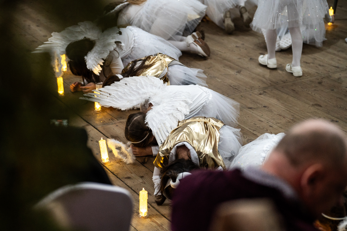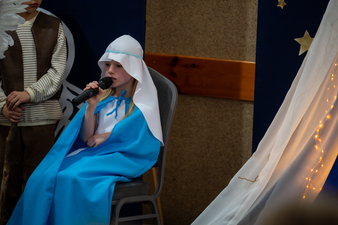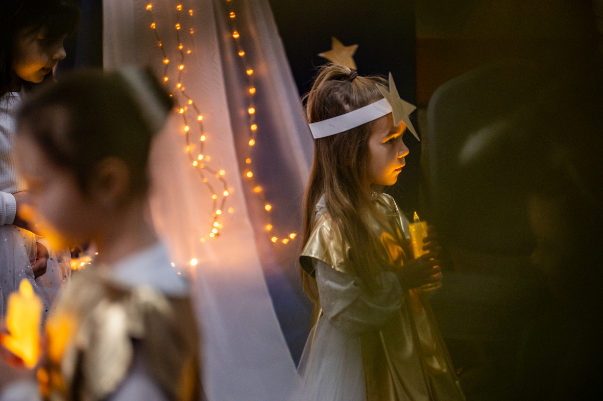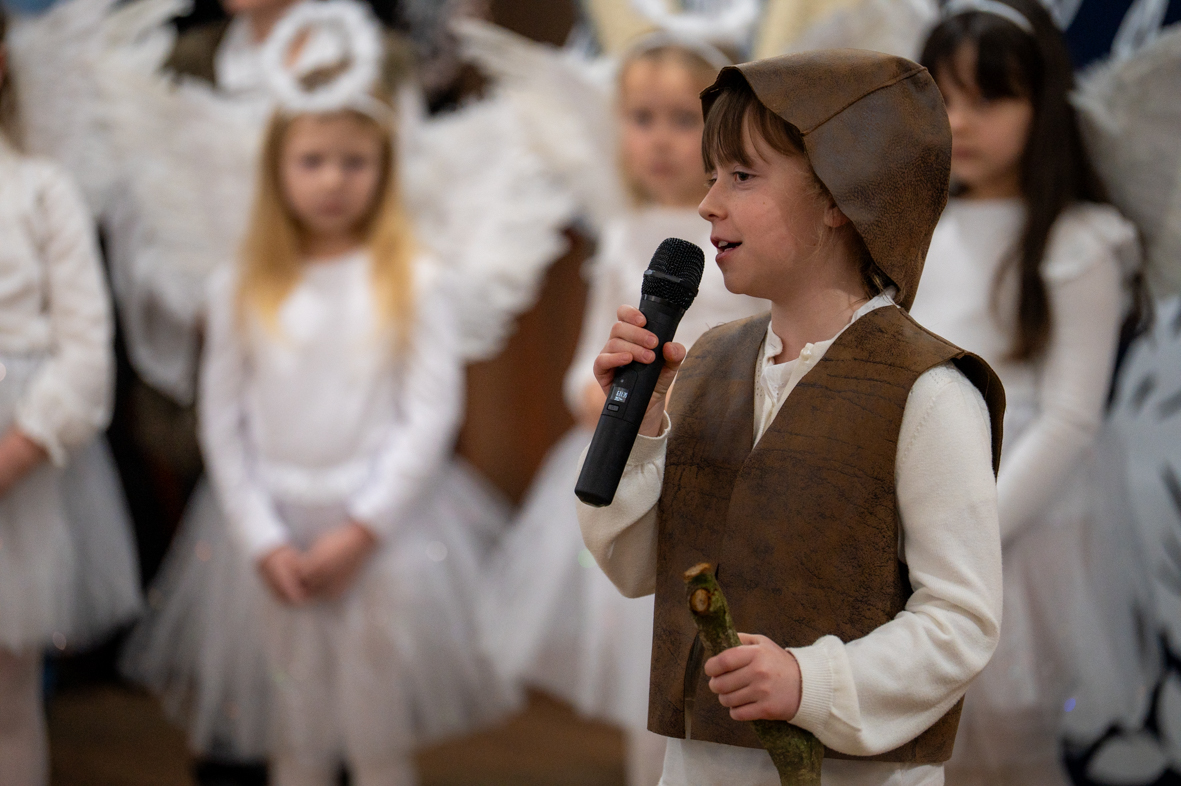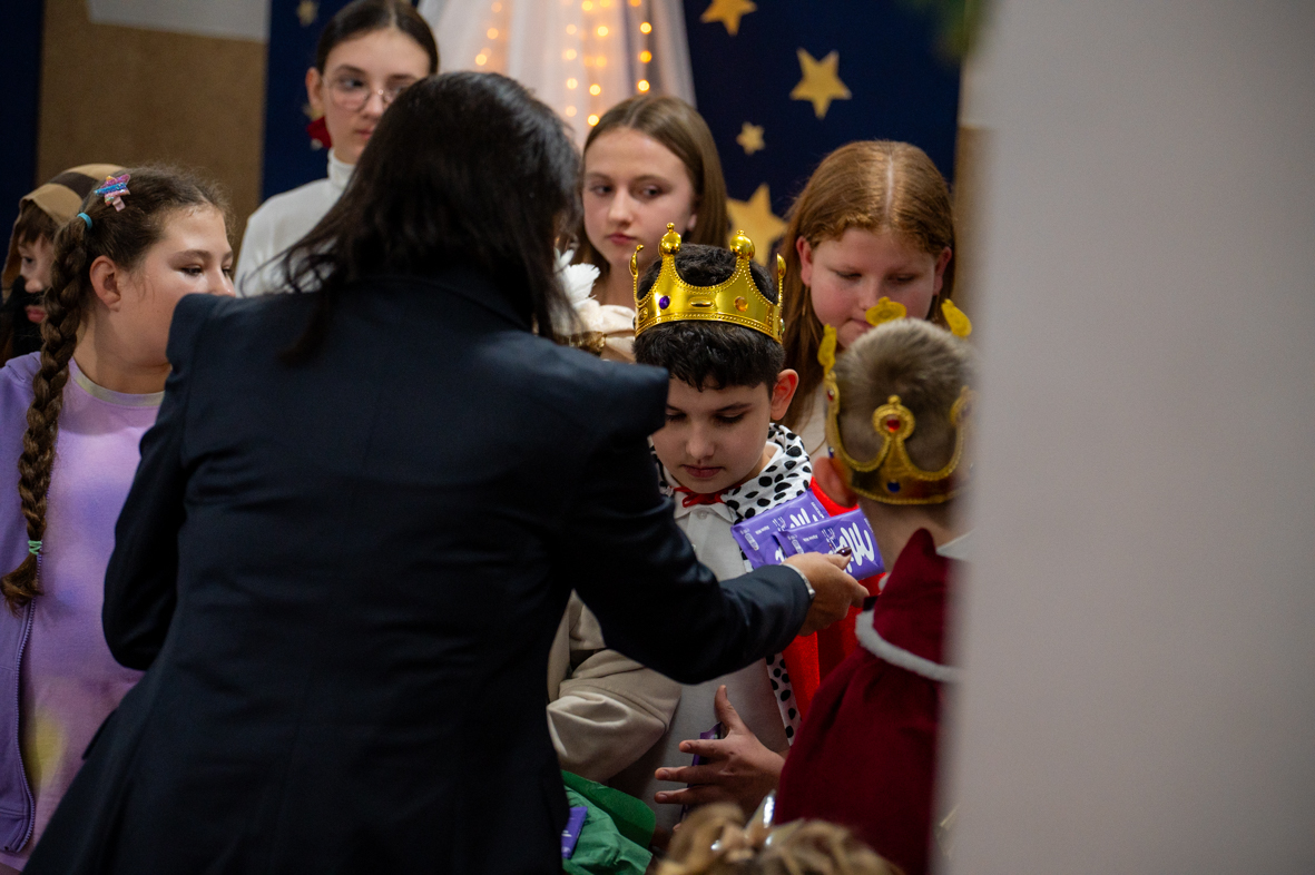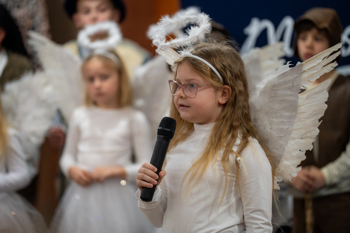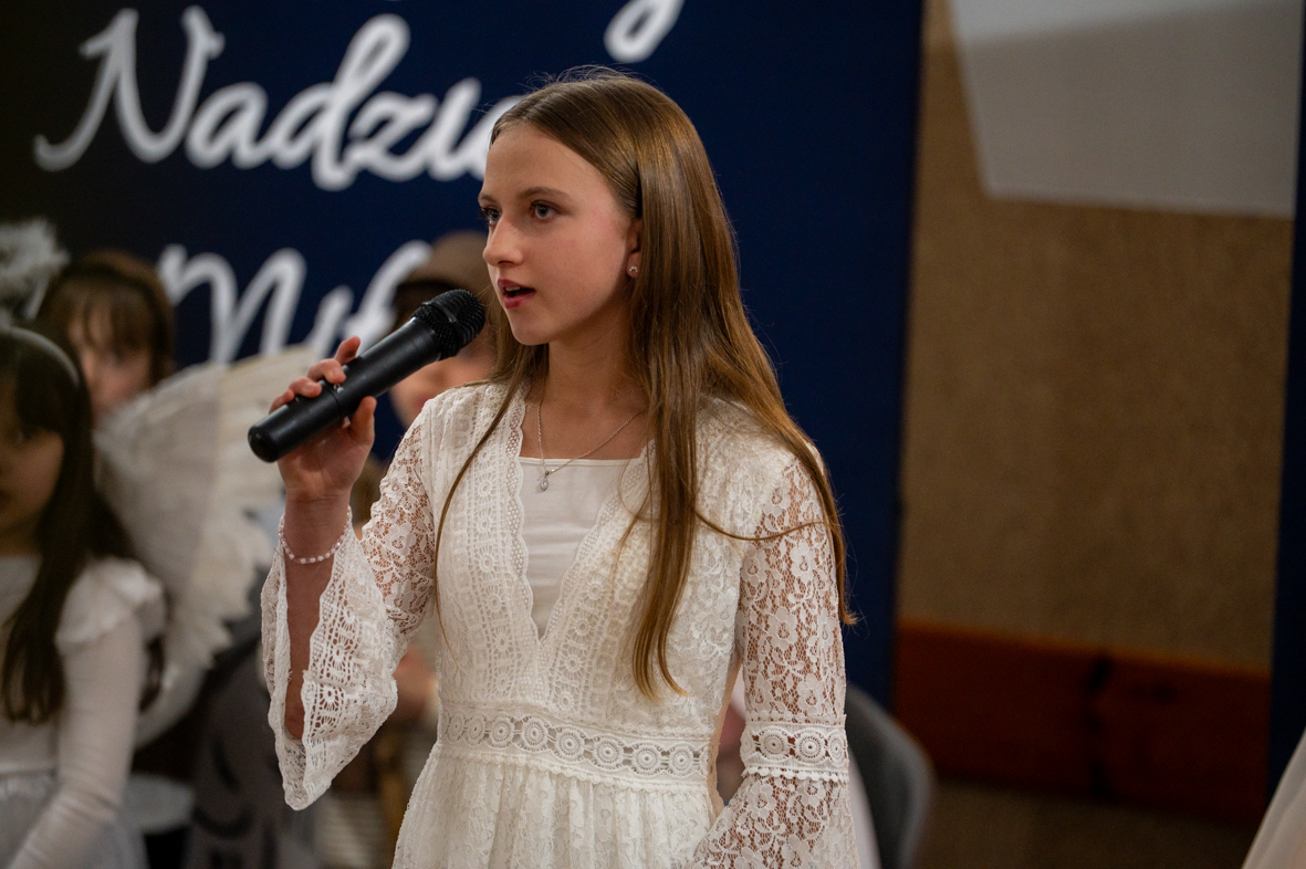 Cytowany na wstępie C.K. Norwid wspominał o Wspólnym Gnieździe, a Nasze Gniazdo to Gminna Wspólnota. I tak wszyscy spotkali się przy symbolicznym świątecznym stole. Powitali ich mali artyści, którzy przygotowali świąteczne widowisko. Witamy serdecznie wszystkich gości, / wszystkich co dziś są pełni radości, / Tych, co przyszli z nadzieją w sercu, / że coś pięknego zobaczą - Ta zachęta popłynęła ze strony aktorów z szkoły w Łęce Mroczeńskiej, którzy zaprezentowali spektakl wyreżyserowany przez Andżelikę Marcinkowską, Henrykę Orszulak oraz Annę Raszewską. Oprawę muzyczną stworzył Andrzej Ciurys. Choć lata lecą i płyną wieki, / Choć nas oddziela dziś czas daleki / Od tamtych czasów gdy w Betlejem/Pan Bóg zstąpił do nas na ziemię / Chcemy te wydarzenia uczcić przedstawieniem.