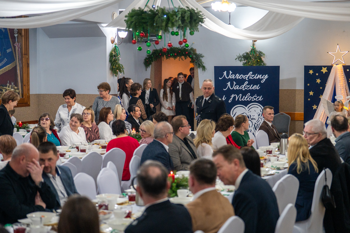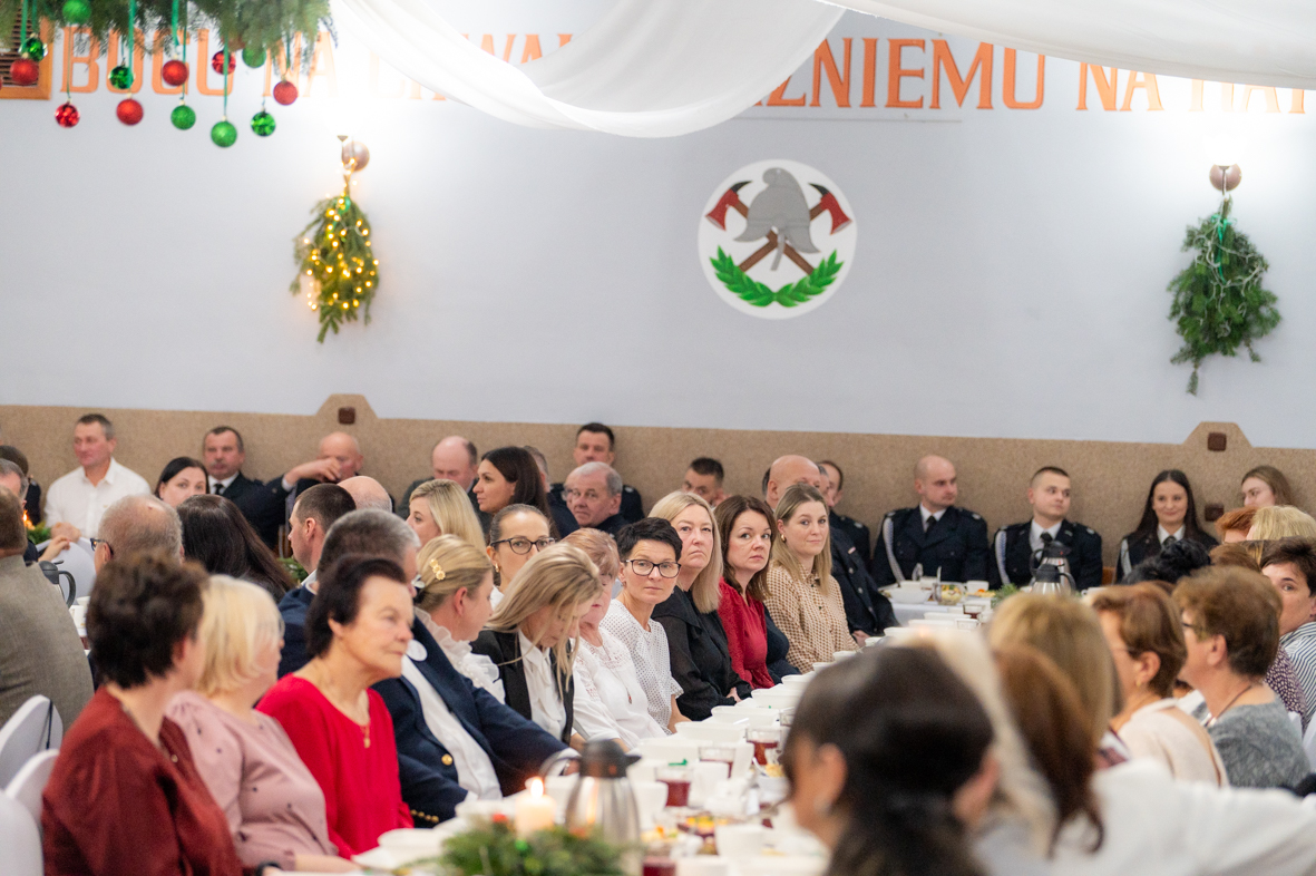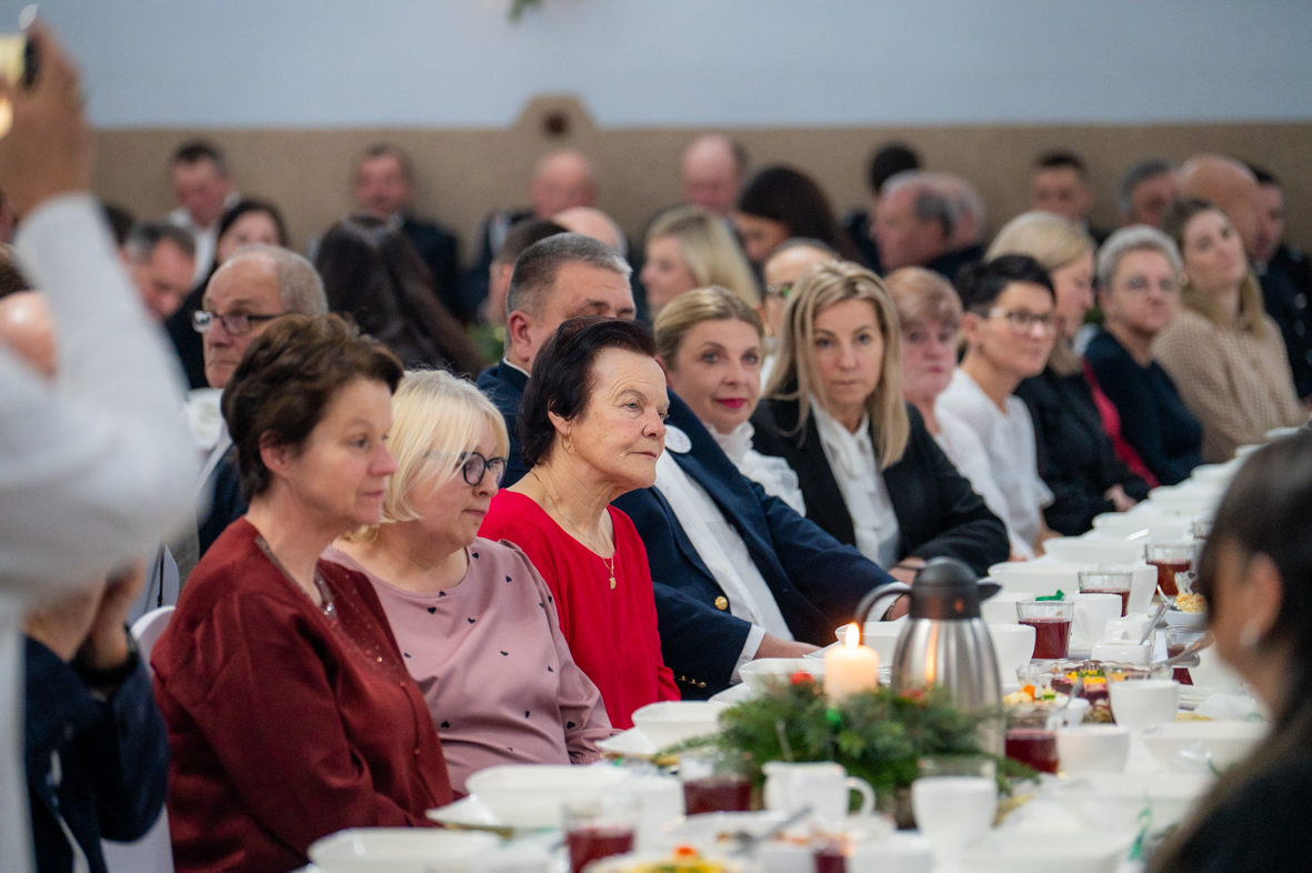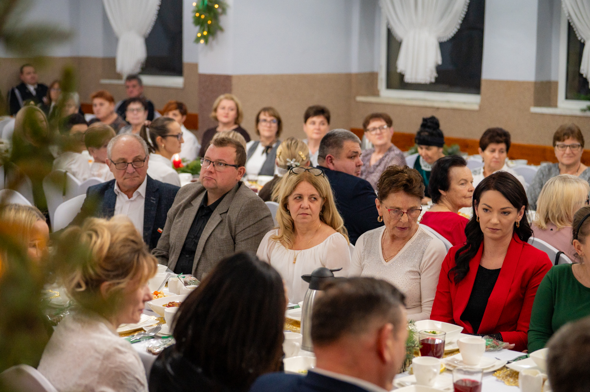 Przed świąteczną wieczerzą, szacowni Goście Gminnej Wigilii przełamali się opłatkiem. Ten biały kruchy opłatek, / pszenna kruszyna chleba, / a symbol wielkich rzeczy, / symbol pokoju i nieba. / Na ziemię w noc wtuloną, Bóg schodzi jak przed wiekami. / Braćmi się znowu poczyńmy, przebaczmy krzywdy, gdy trzeba. / Podzielmy się opłatkiem, chlebem pokoju i nieba. (ems)