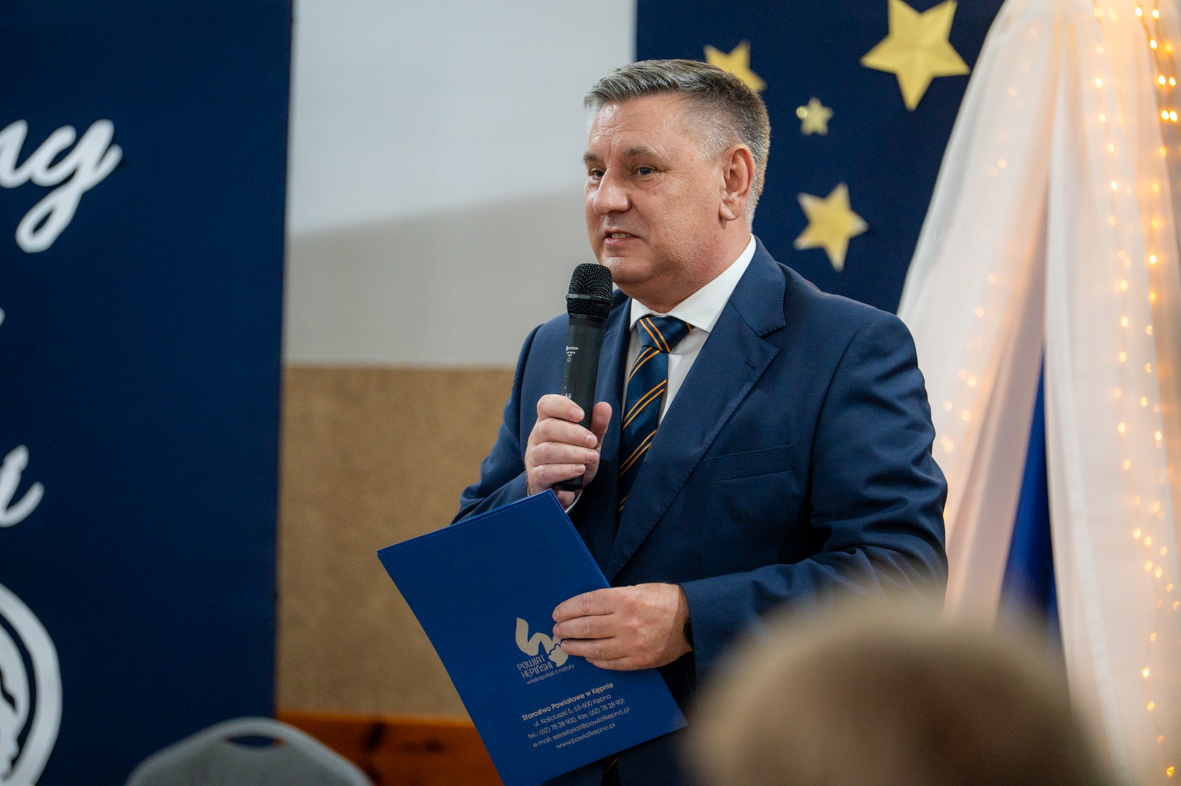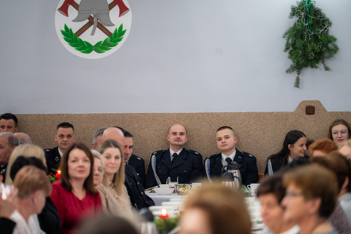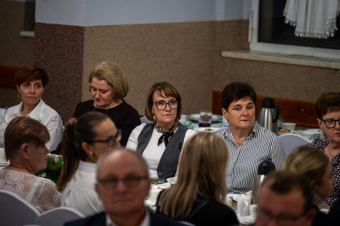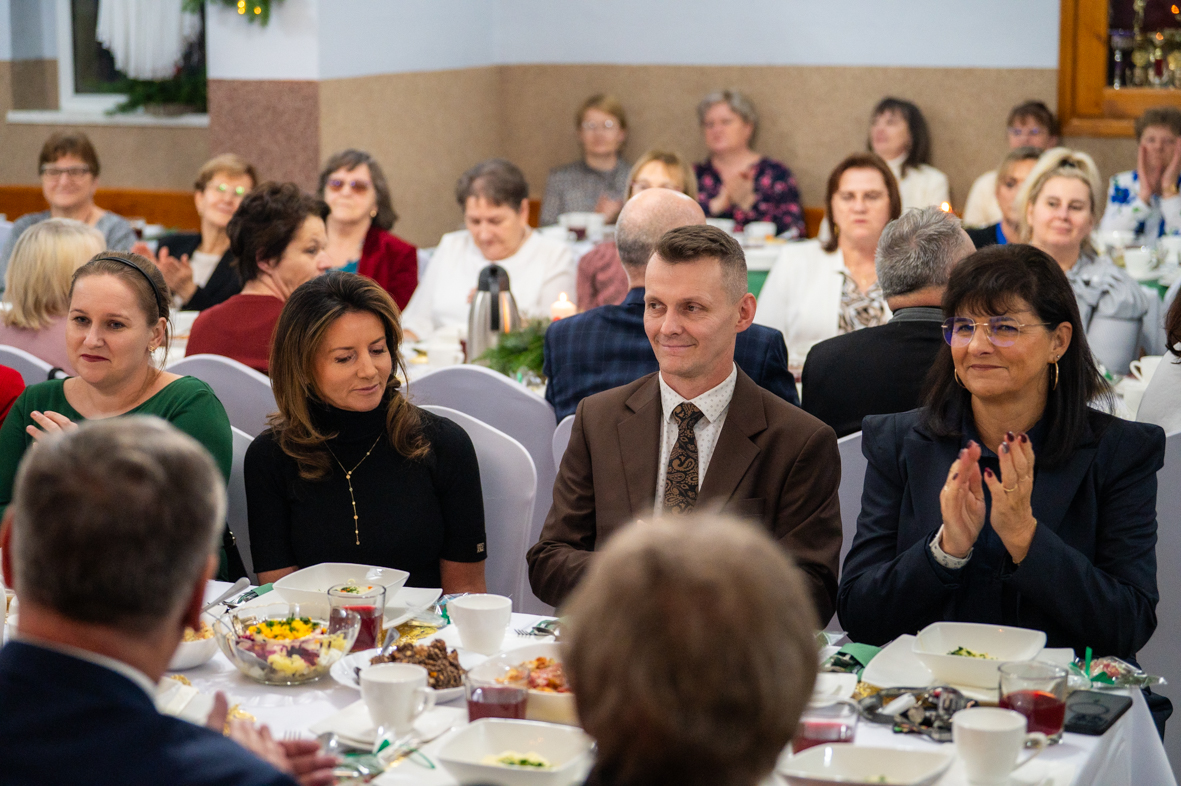 Przed świąteczną wieczerzą, szacowni Goście Gminnej Wigilii przełamali się opłatkiem. Ten biały kruchy opłatek, / pszenna kruszyna chleba, / a symbol wielkich rzeczy, / symbol pokoju i nieba. / Na ziemię w noc wtuloną, Bóg schodzi jak przed wiekami. / Braćmi się znowu poczyńmy, przebaczmy krzywdy, gdy trzeba. / Podzielmy się opłatkiem, chlebem pokoju i nieba. (ems)