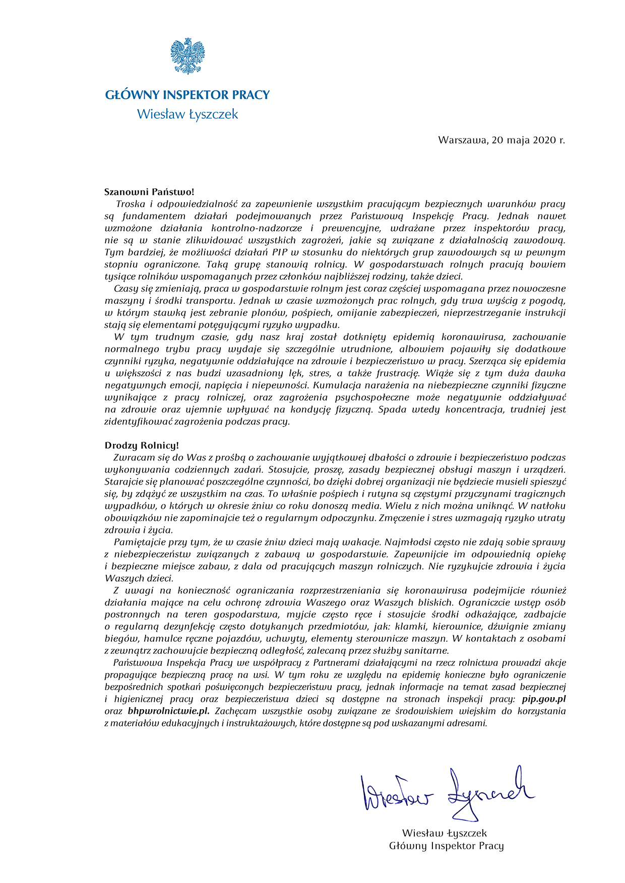 Apel Głównego Inspektora Pracy skierowany do rolników o przestrzeganie w tym szczególnym czasie epidemii koronawirusa, podstawowych zasad związanych z zapewnieniem bezpiecznego i zdrowego środowiska pracy oraz opieki i bezpieczeństwa dzieci przebywających w gospodarstwach. Więcej informacji na stronie www.pip.gov.pl oraz bhpwrolnictwie.pl.