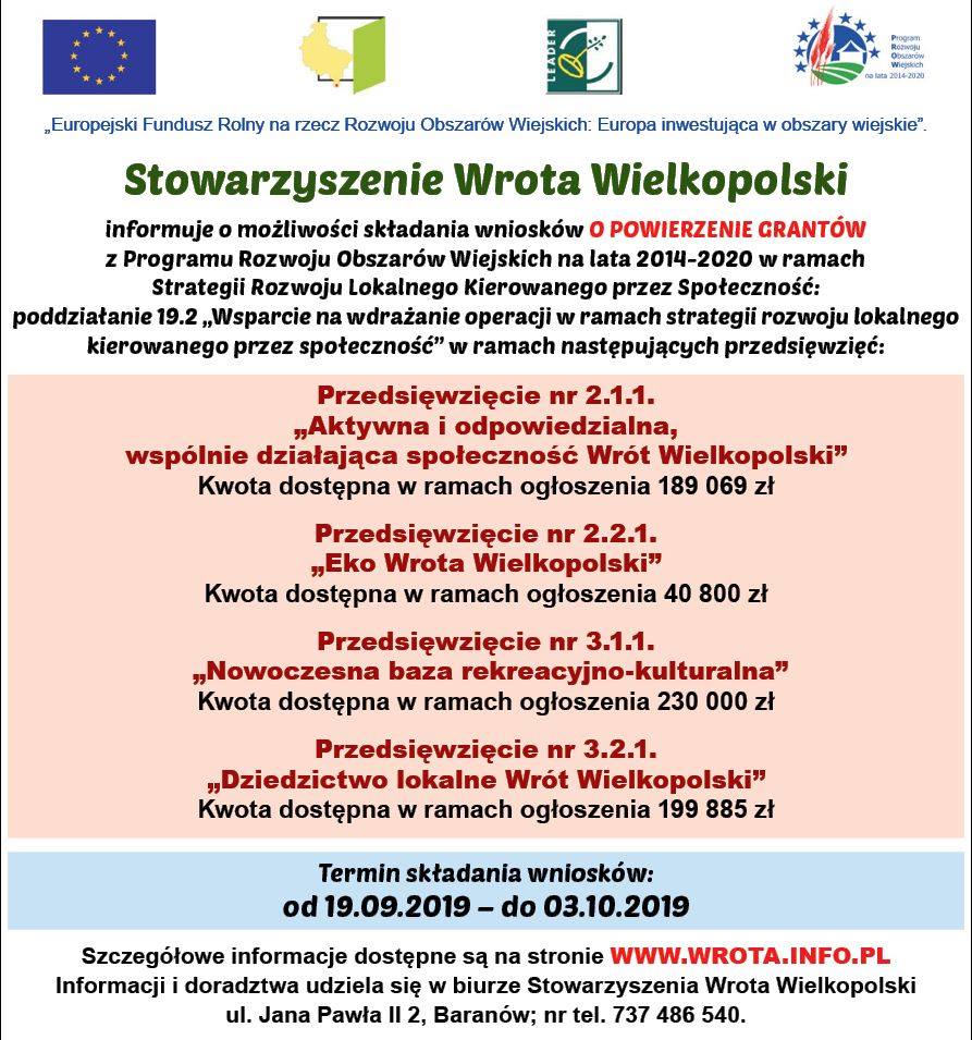 Stowarzyszenie Wrota Wielkopolski informuje o możliwości składania wniosków o powierzenie grantów z Programu Rozwoju Obszarów Wiejskich na lata 2014-2020 w ramach Strategii Rozwoju Lokalnego Kierowanego przez Społeczność.