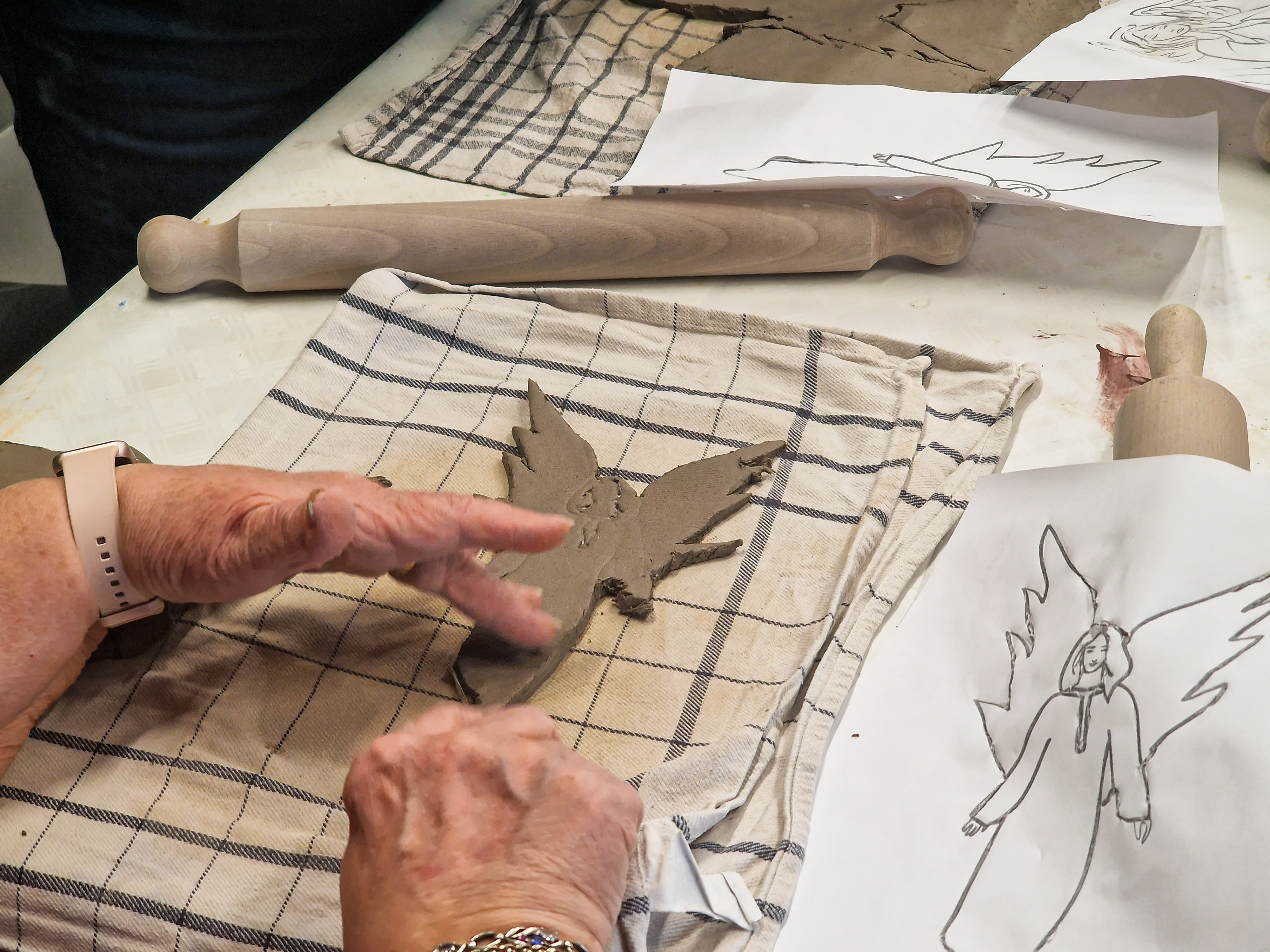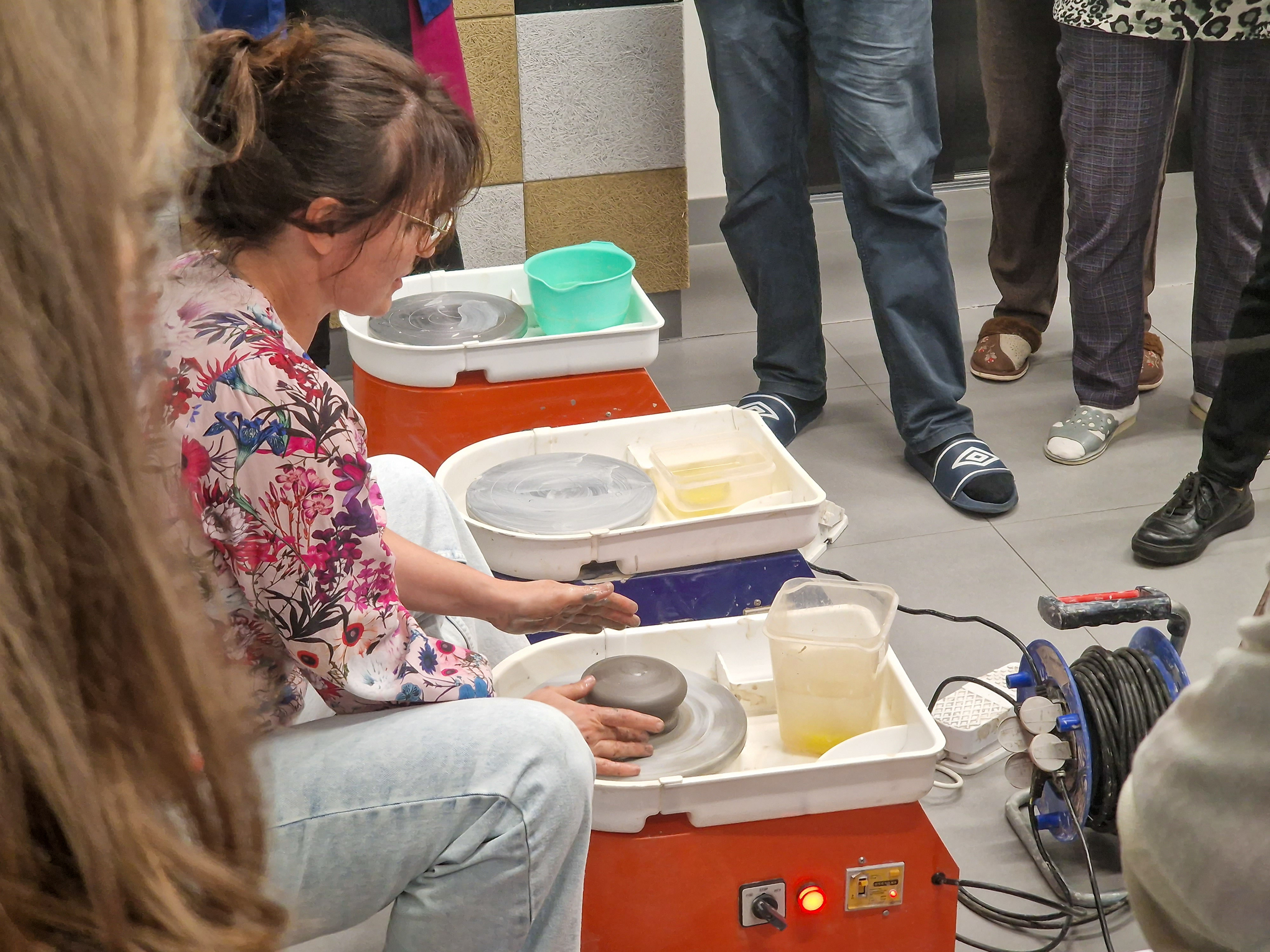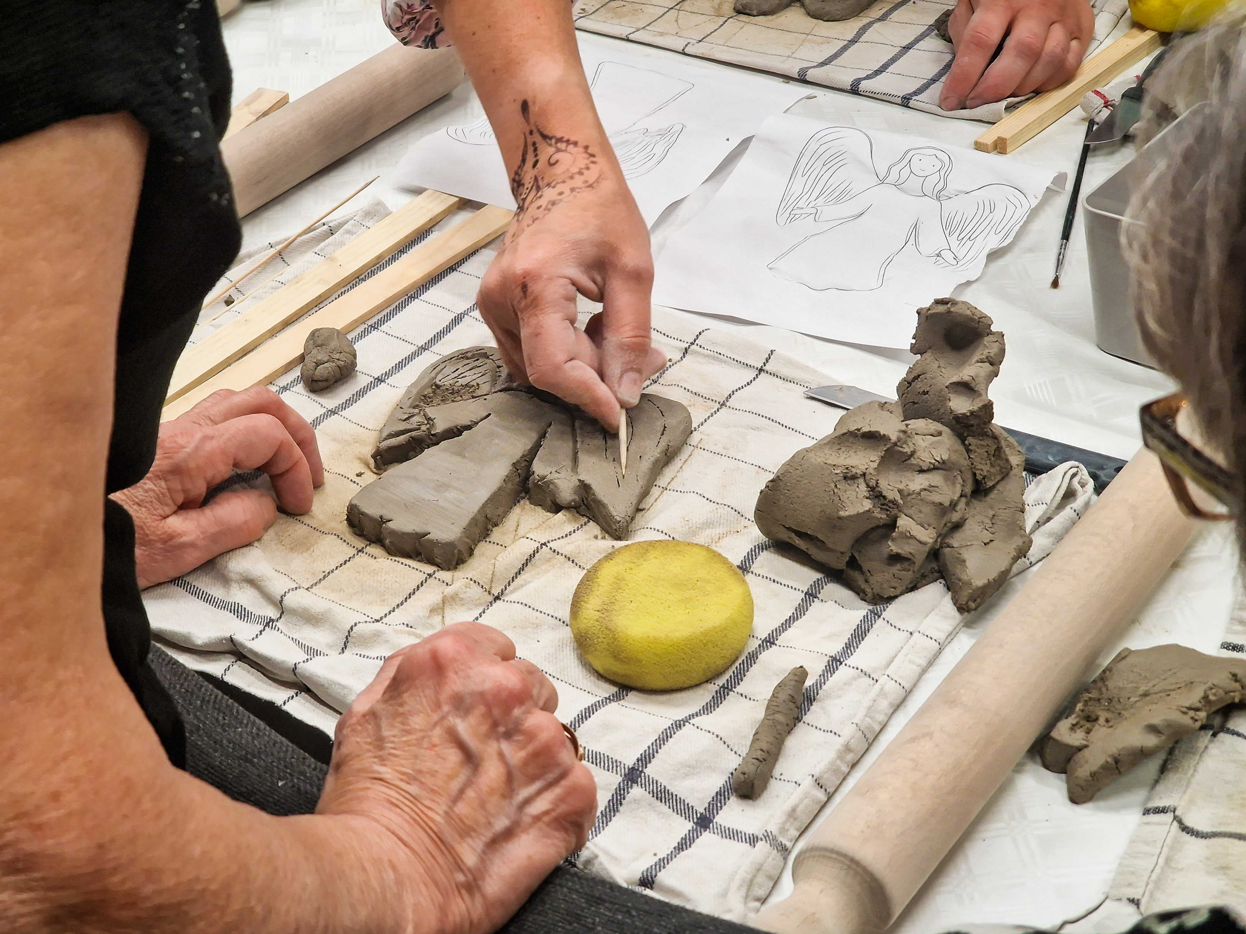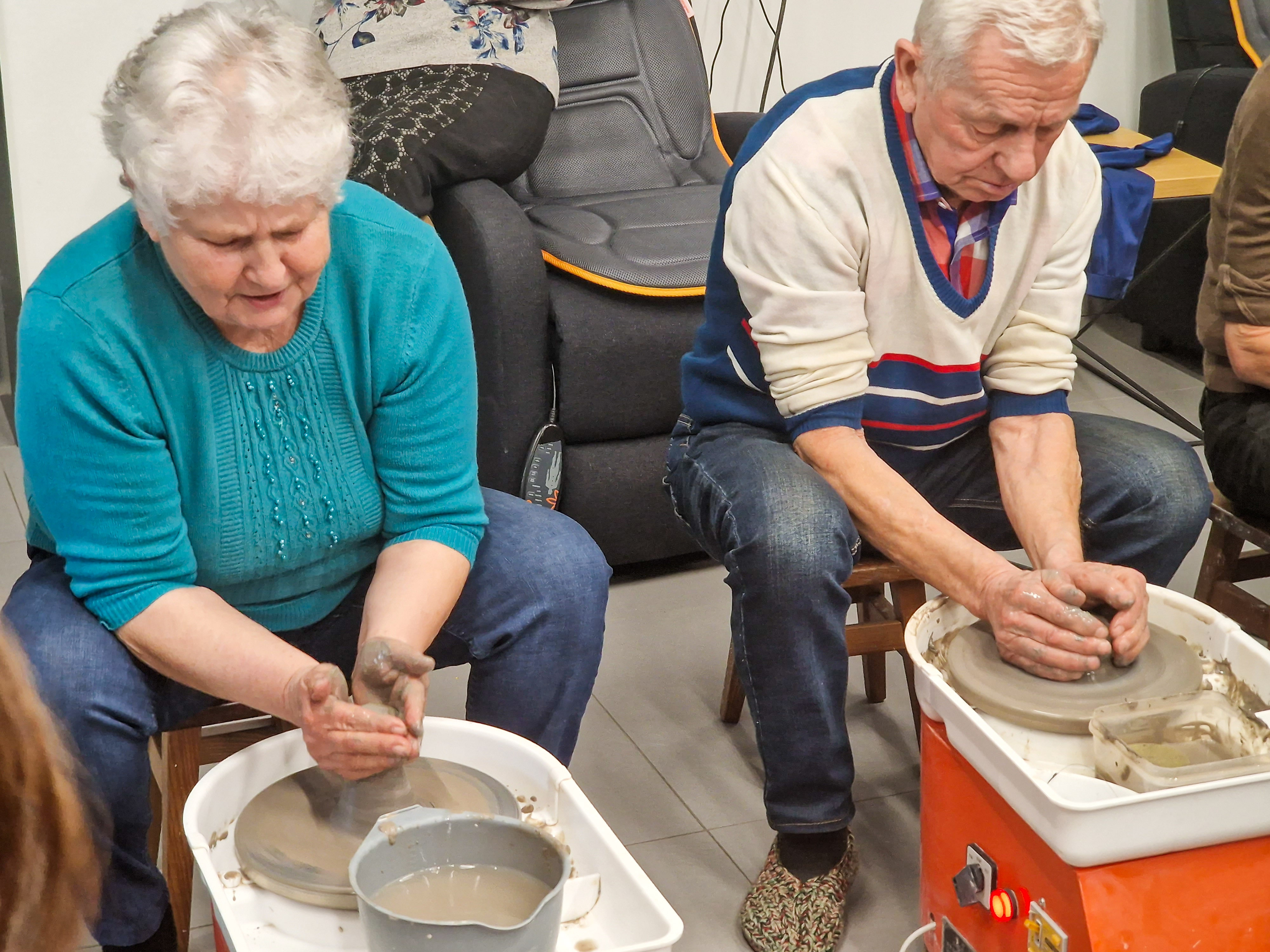 Podczas pierwszych zajęć Seniorzy uczyli się toczenia na kole garncarskim, gdzie przy pomocy instruktora każdy uczestnik stworzył własny wazon. Kolejnym celem zajęć było stworzenie rzeźb aniołów techniką łączoną – czyli formowanie aniołów z płatów gliny i wykorzystanie szablonów. Podsumowaniem pierwszych warsztatów był słodki poczęstunek we wspólnym gronie, który sprzyjał rozmowom i integracji grupy.