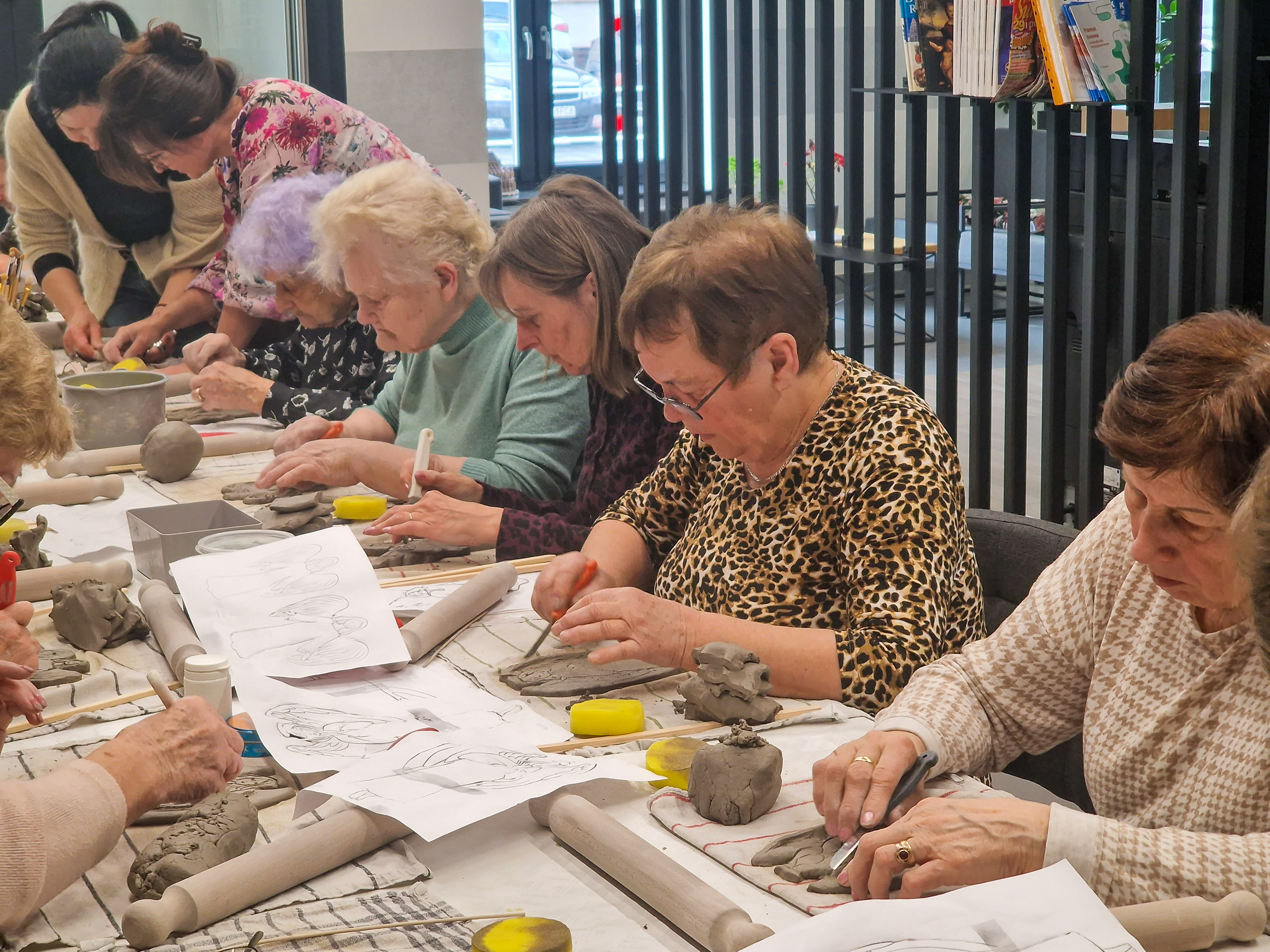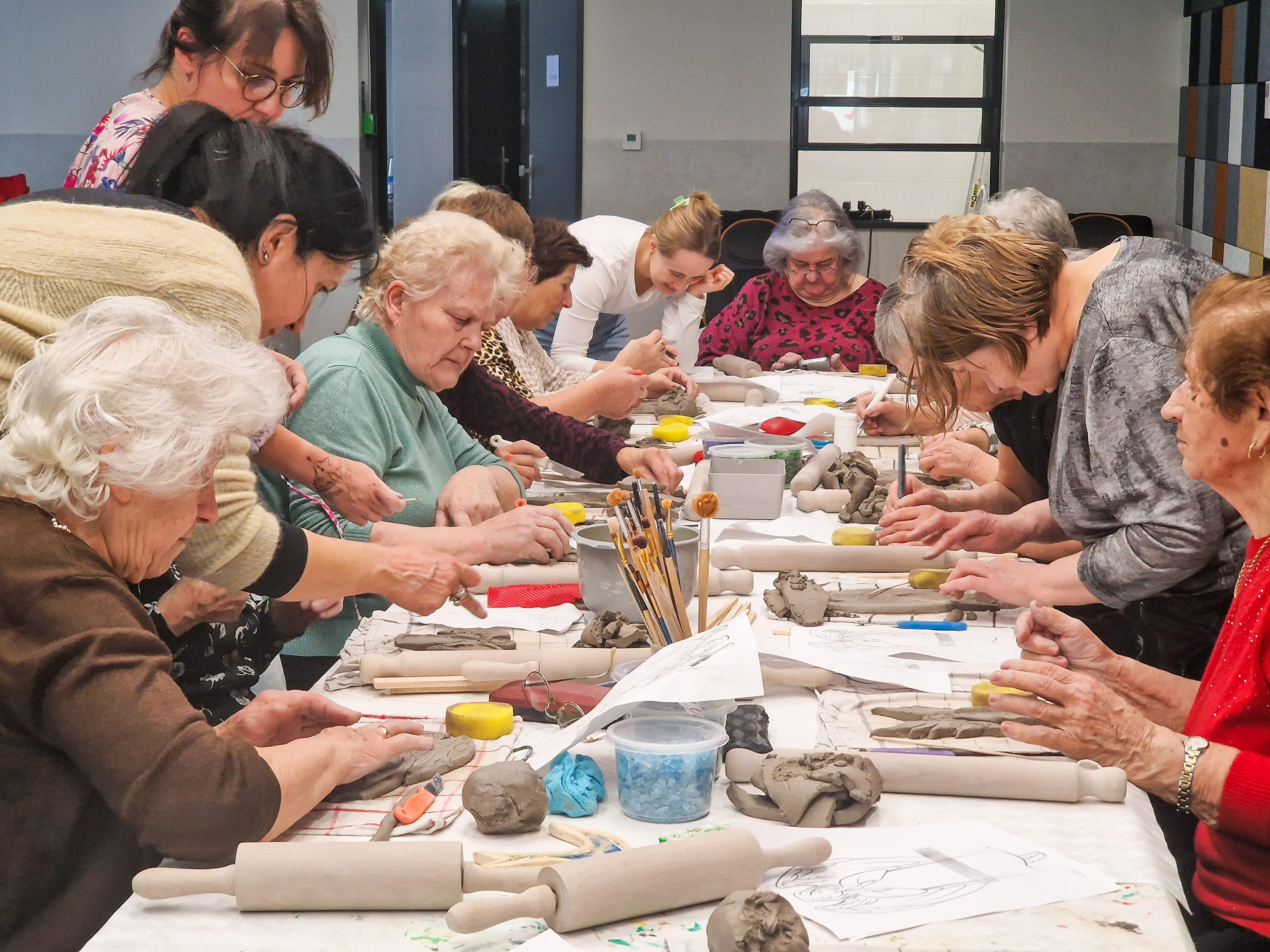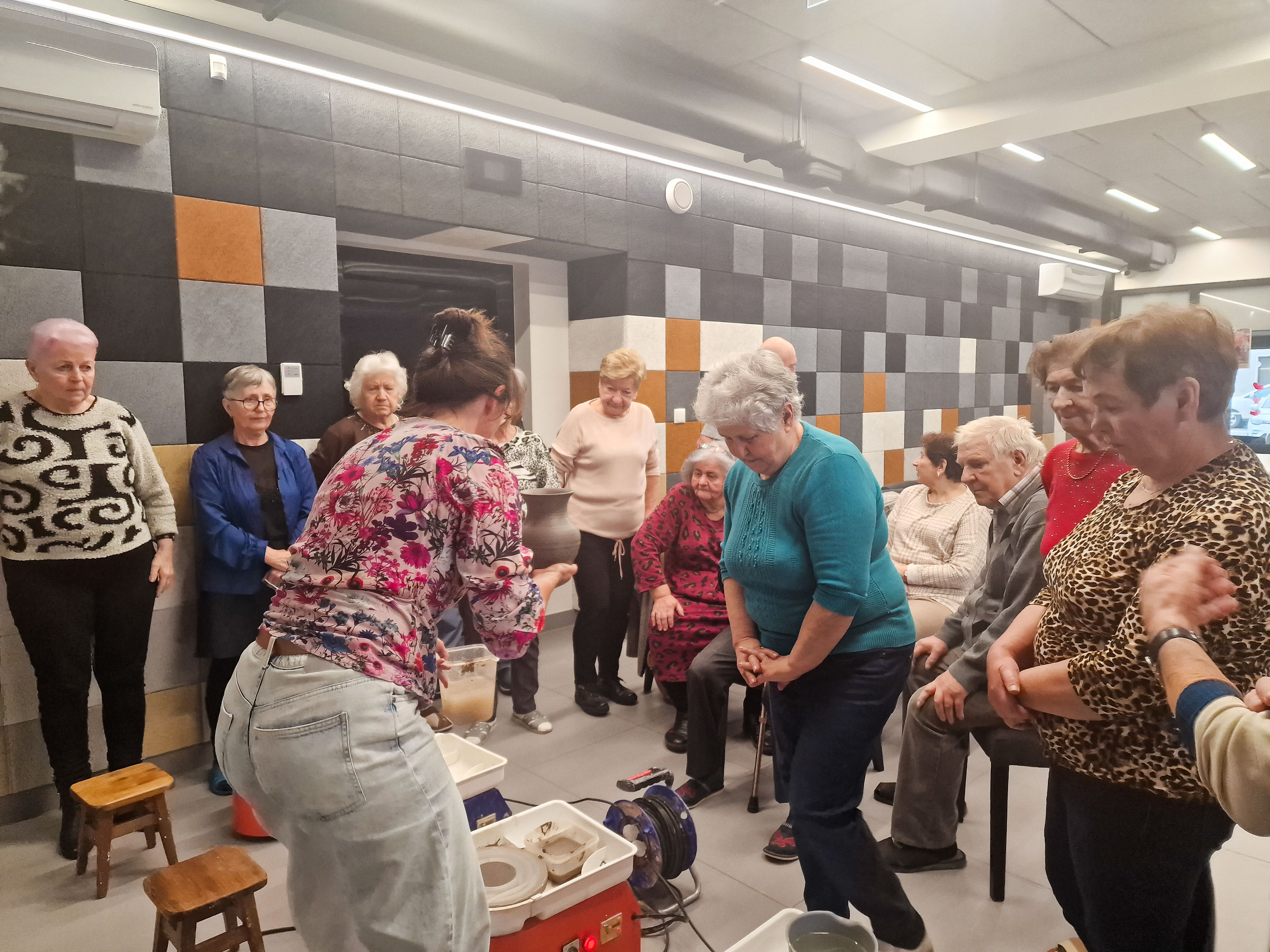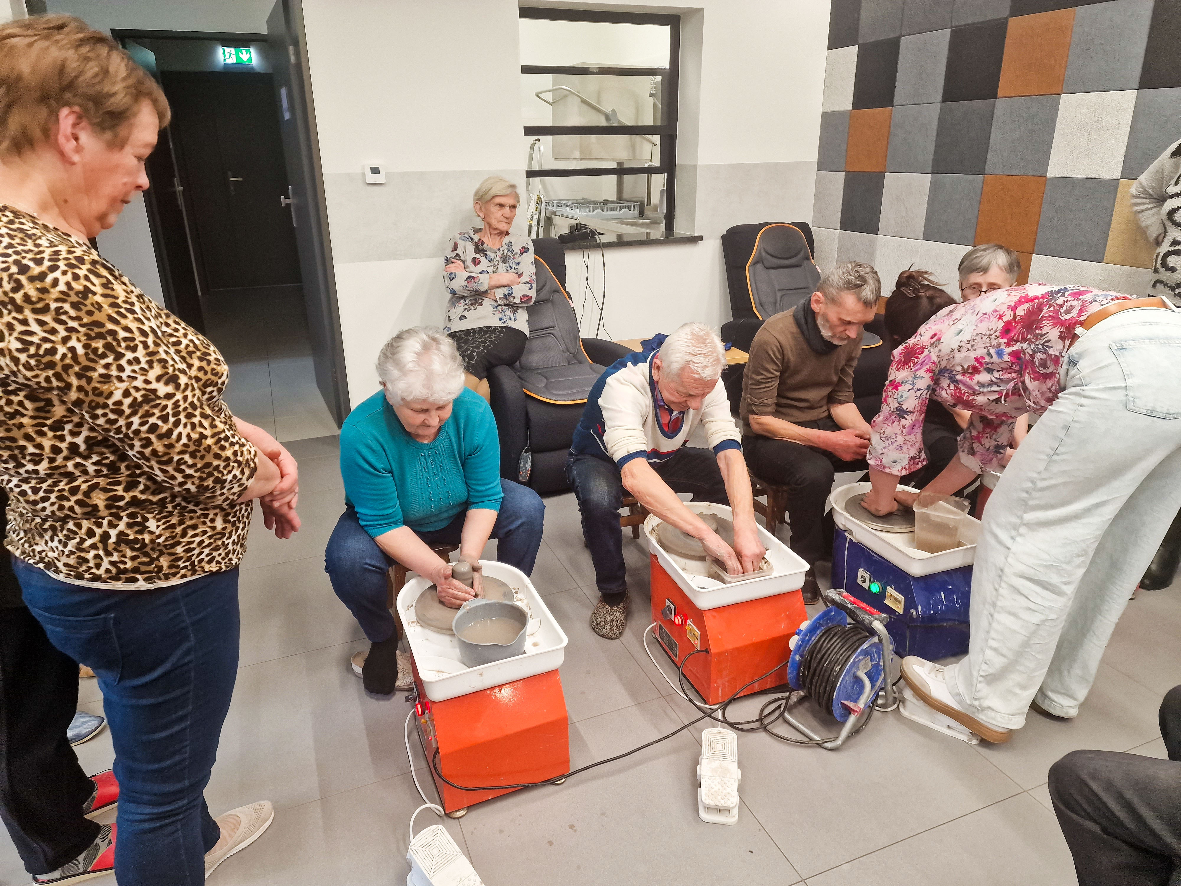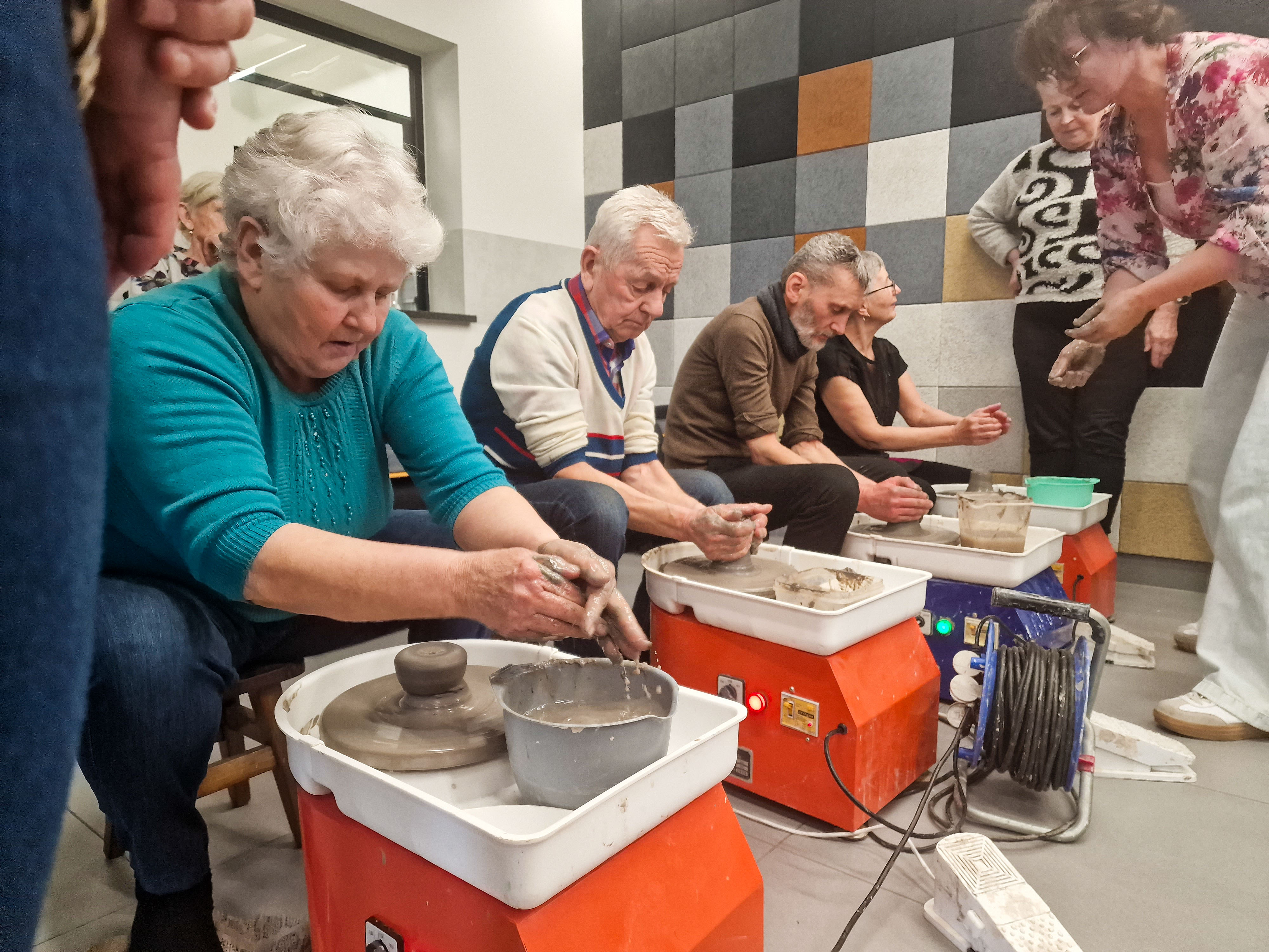 W trakcie cyklu 4 warsztatów Seniorzy poznają różne techniki formowania gliny, zdobienia oraz podstawy szkliwienia i wypalania ceramiki. Zdaniem prowadzącej warsztaty – pani Justyny Wolnej „Glina to niezwykły materiał o nieskończonych możliwościach. Jej plastyczność i kontakt z dłońmi mają kojące działanie, a sam proces tworzenia uczy cierpliwości i uważności. Powstałe prace są unikatowe, odzwierciedlają czas, emocje i osobistą ekspresję twórcy.” Warsztaty ceramiczne są wyjątkową, kreatywną formą integracji, podczas której Seniorzy rozwijają sprawność manualną i koordynację ruchową oraz pobudzają wyobraźnię przestrzenną tworząc dzieła z gliny.