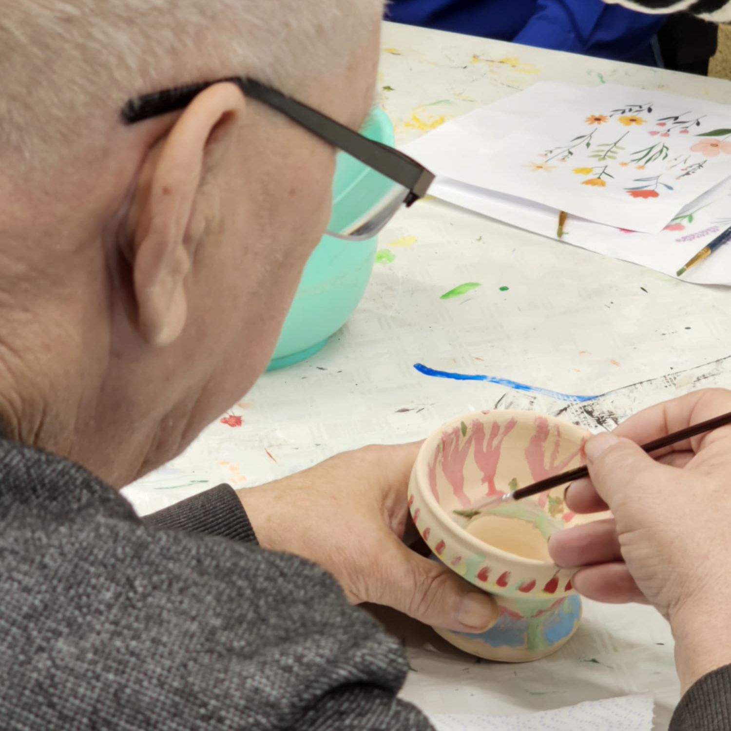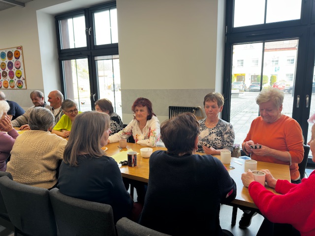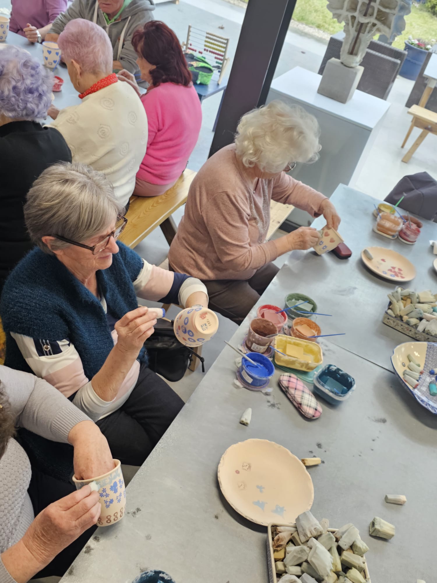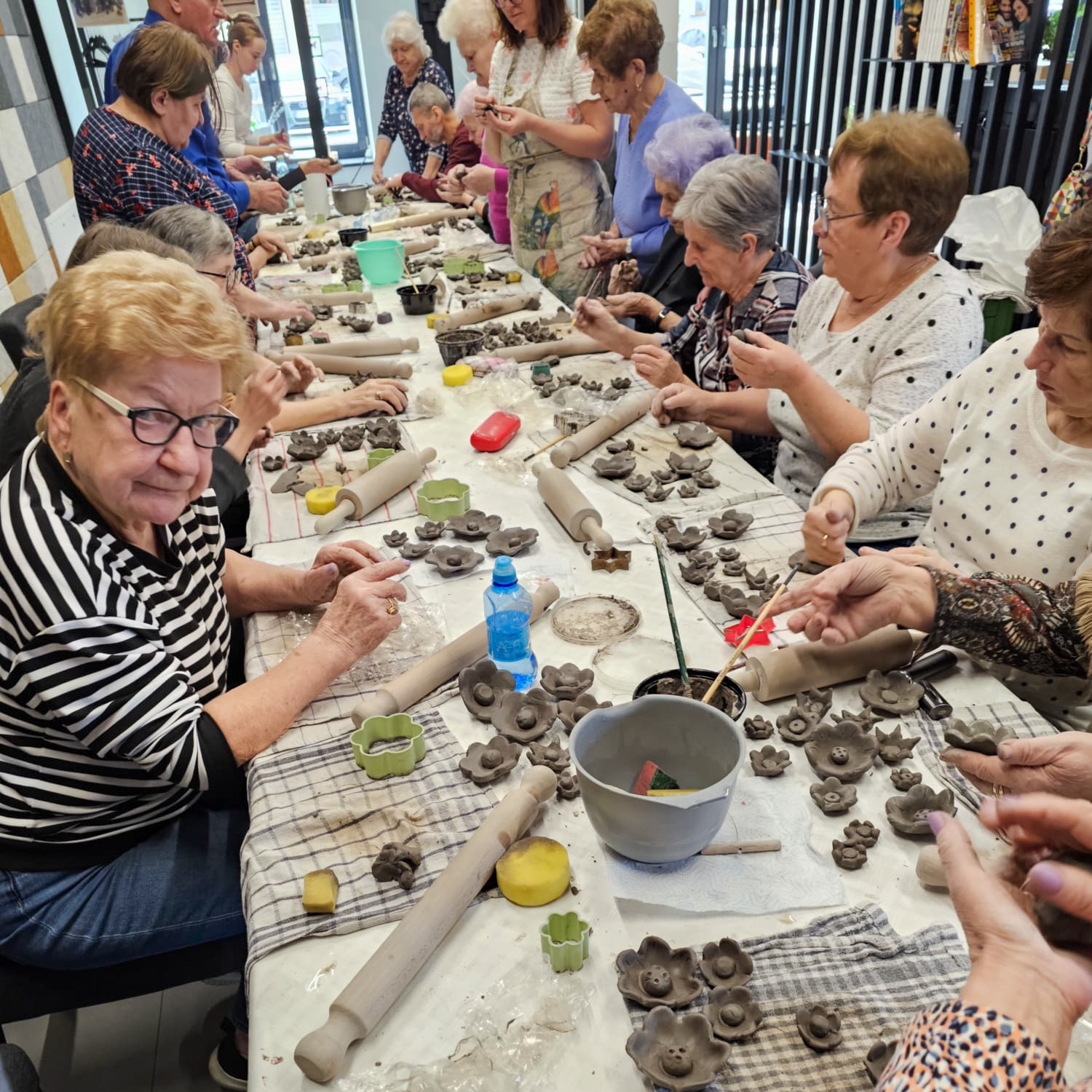 Odbyły się także kolejne warsztaty ceramiczne, których tematem było szkliwienie wypalonych naczyń. Po omówieniu przez prowadzącą procesu i technik szkliwienia (metoda nanoszenia szkliwa: zanurzanie oraz malowanie pędzlem) Seniorzy przystąpili do prac nad kolorystyką stworzonych przez siebie na poprzednich zajęciach aniołów oraz wazonów. Przygotowane tak prace zostały zabrane do pracowni na wypał końcowy. Przerwy pomiędzy warsztatami Seniorzy spędzali przy słodkim i owocowym poczęstunku we wspólnym gronie, który sprzyjał rozmowom i integracji grupy. Ponadto w ramach przerwy kawowej Seniorzy dwukrotnie wybrali się do pobliskiego Bistro na domowe wypieki, deserki, naleśniki, pyszną kawę i herbatę. W marcu Seniorzy uczestniczyli także w całodniowym wyjeździe do Muzeum Ceramiki w Bolesławcu. Wycieczka stanowiła uzupełnienie trwających warsztatów ceramicznych. Odwiedzając manufakturę w Bolesławcu Seniorzy zobaczyli z bliska, jak powstaje ceramika bolesławiecka oraz jak wygląda praca artystów i rzemieślników, którzy tworzą unikatowe wzory na ceramice. Dowiedzieli się także o tradycjach i technikach stosowanych przy wytwarzaniu ceramiki bolesławieckiej. Ponadto, uczestnicy projektu wzięli udział w warsztatach ceramicznych, podczas których samodzielnie ozdabiali wybrane przedmioty ceramiczne, tworząc osobistą pamiątkę pełną wspomnień.