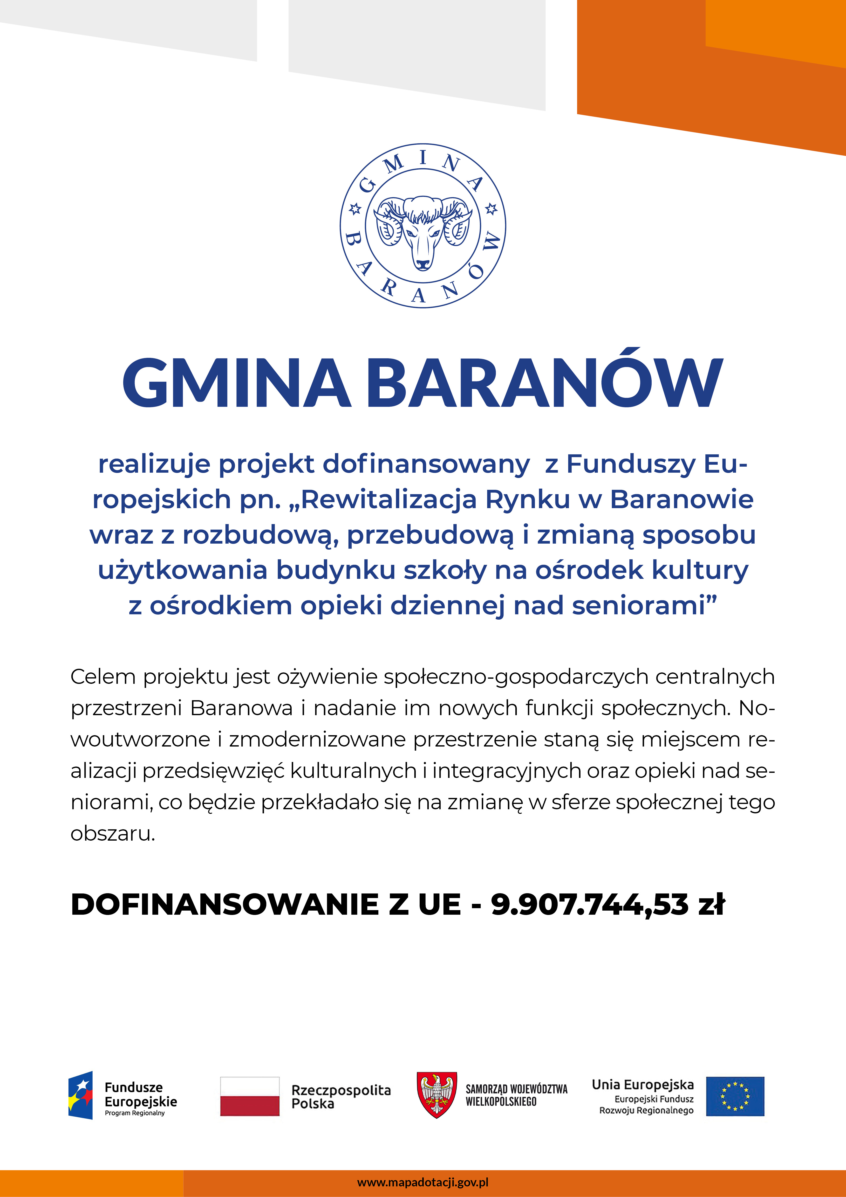 Przedmiot umowy to roboty niezbędne do rewitalizacji Rynku w Baranowie wraz z rozbudową, przebudową i zmianą sposobu użytkowania budynku szkoły na ośrodek kultury z ośrodkiem opieki dziennej nad seniorami, rozbiórką budynku sali gimnastycznej, budową budynku usługowo-gastronomicznego, termomodernizacją budynku Urzędu Gminy oraz budynku OSP wraz z zagospodarowaniem terenu i infrastrukturą techniczną.