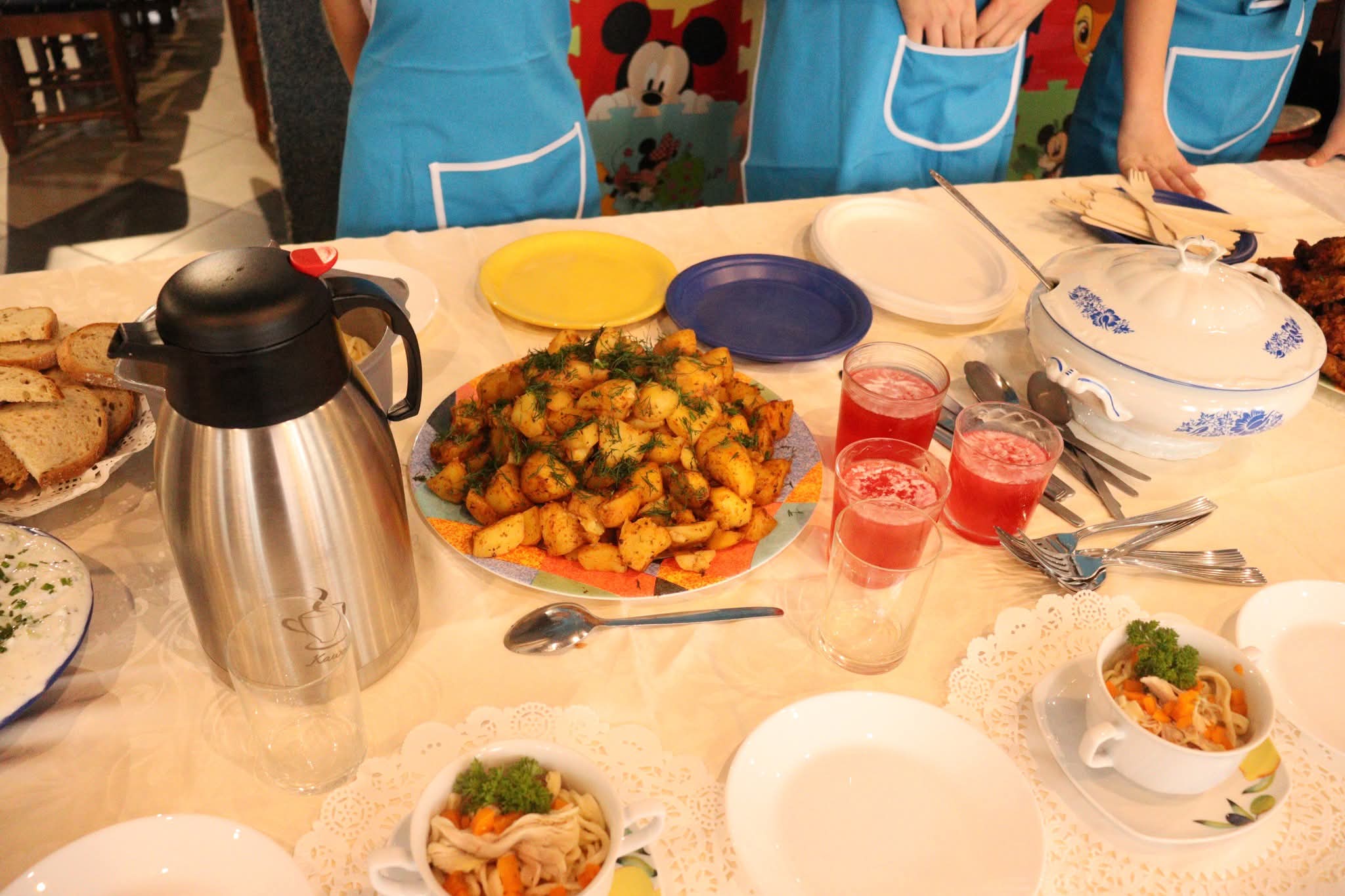Grupa I, pod opieką pań Sylwii Goli, Beaty Misiek i Barbary Wiśniewskiej (uczestnicy: Blanka Kowalilak, Nikola Misiek, Filip Wiśniewski, Anna Gola), przygotowała tradycyjny rosół z lanymi kluskami, pieczeń z karkówki z ciemnym sosem i szarymi kluskami, surówkę z białej kapusty, kompot z dyni oraz sernik. Grupa II, której opiekunkami były panie Ivana Karliak i Olena Okhremchuk (uczestnicy: Artur Karliak, Andrej Okhremchuk, Dawid Usiak), zaserwowała rosół, kotlet schabowy z kością, pieczone ziemniaki, surówkę i deserki. Grupa III pod kierunkiem pań Karoliny Wodyńskiej, Urszuli Marczak i Katarzyny Nawrot (uczestnicy: Maja Marczak, Maja Wodyńska, Kamila Marczak, Dominika Wodyńska, Nadia Nawrot) zachwyciła jury rosołem, roladą z kluskami i surówką z czerwonej kapusty oraz pachnącą szarlotką. Grupa IV, pracująca pod opieką pań Weroniki Serafin, Katarzyny Kani i Hanny Rymus (uczestnicy: Lilianna Kania, Agata Stasiewska, Maja Czechlowska, Maria Serafin, Oliwia Rymus) przygotowała żurek, schab duszony z ziemniakami i surówką oraz kolorowe babeczki. Grupa V, prowadzona przez panie Emilię Rachulę i Ewelinę Klimecką (uczestnicy: Kacper Rachula, Konrad Klimecki, Jan Lipiński, Hubert Murawski, Stanisław Zimoch), postawiła na prostotę i smak – serwując zupę pomidorową z ryżem, makaron z sosem pomidorowym i jabłecznik. Natomiast Grupa VI, pod czujnym okiem pań Anny Tyry, Mazur i Marty Wojtkowskiej (uczestnicy: Milena Tyra, Marta Mazur, Lena Handrysik), przyrządziła zupę pomidorową z makaronem, kotlet „szarpany” z pieczonymi ziemniaczkami i surówką oraz aromatyczne ciasto ze śliwkami.