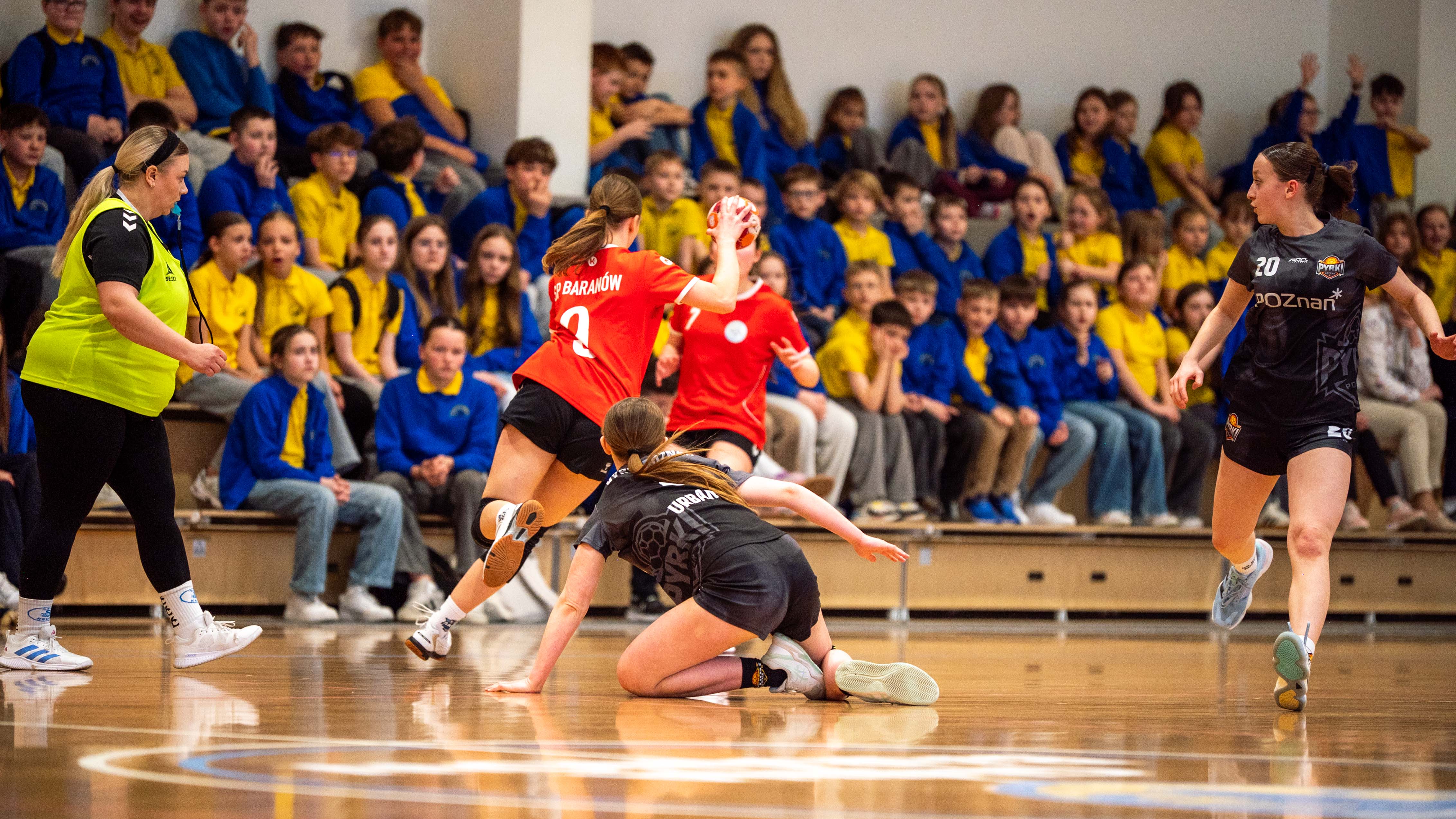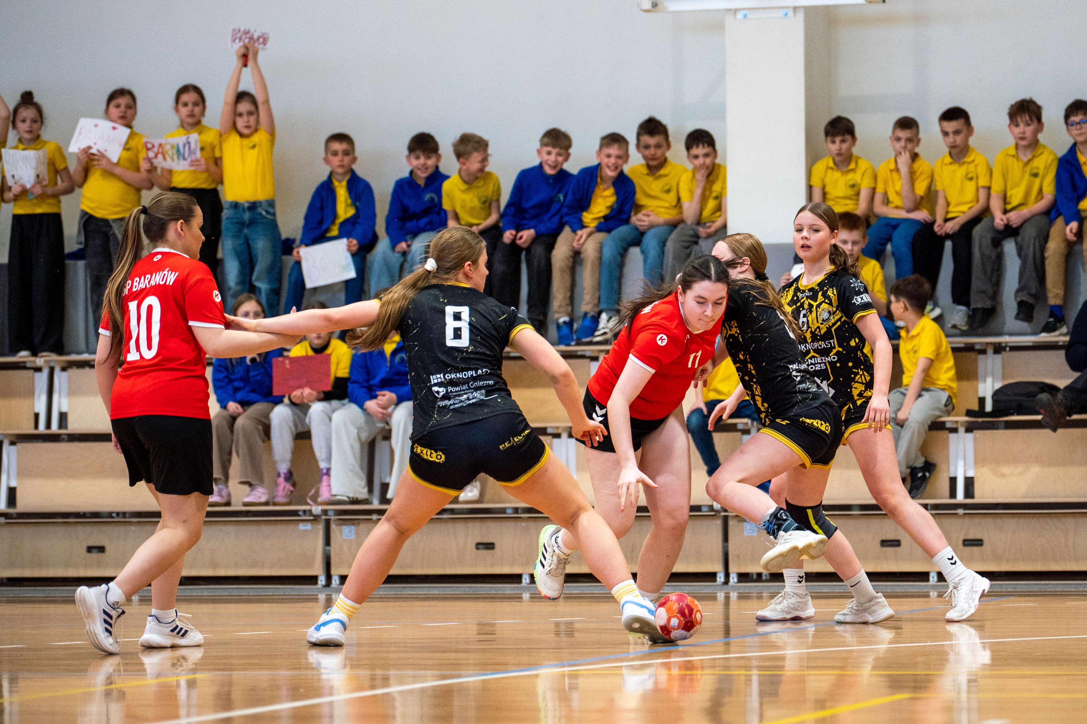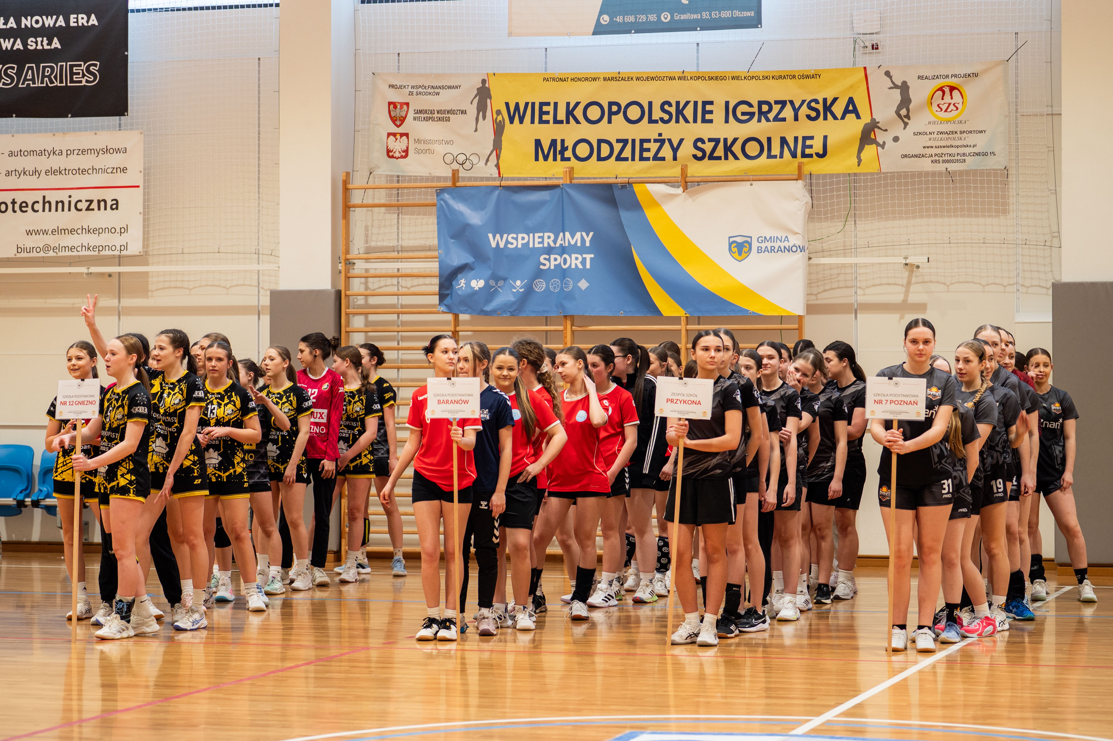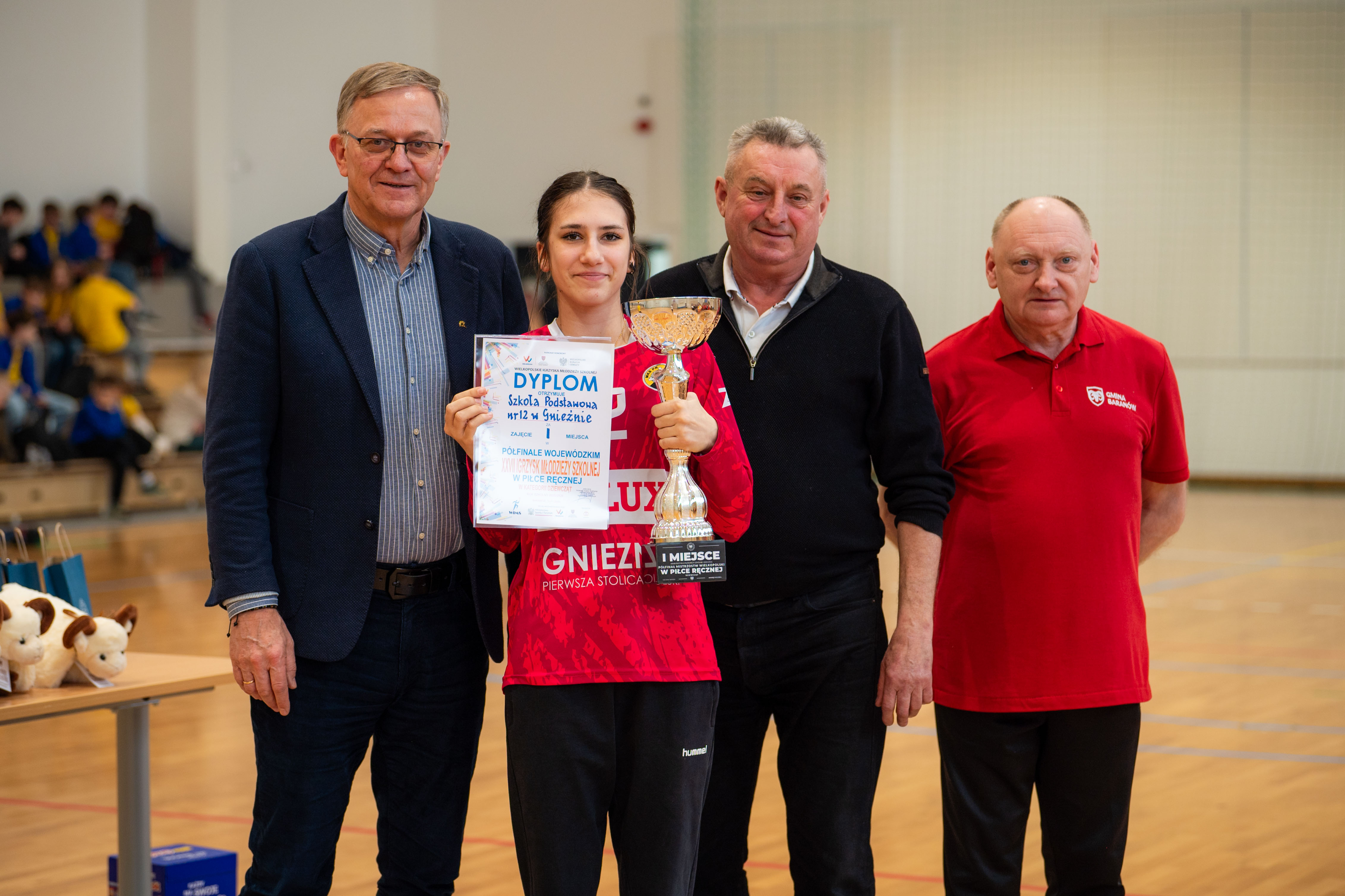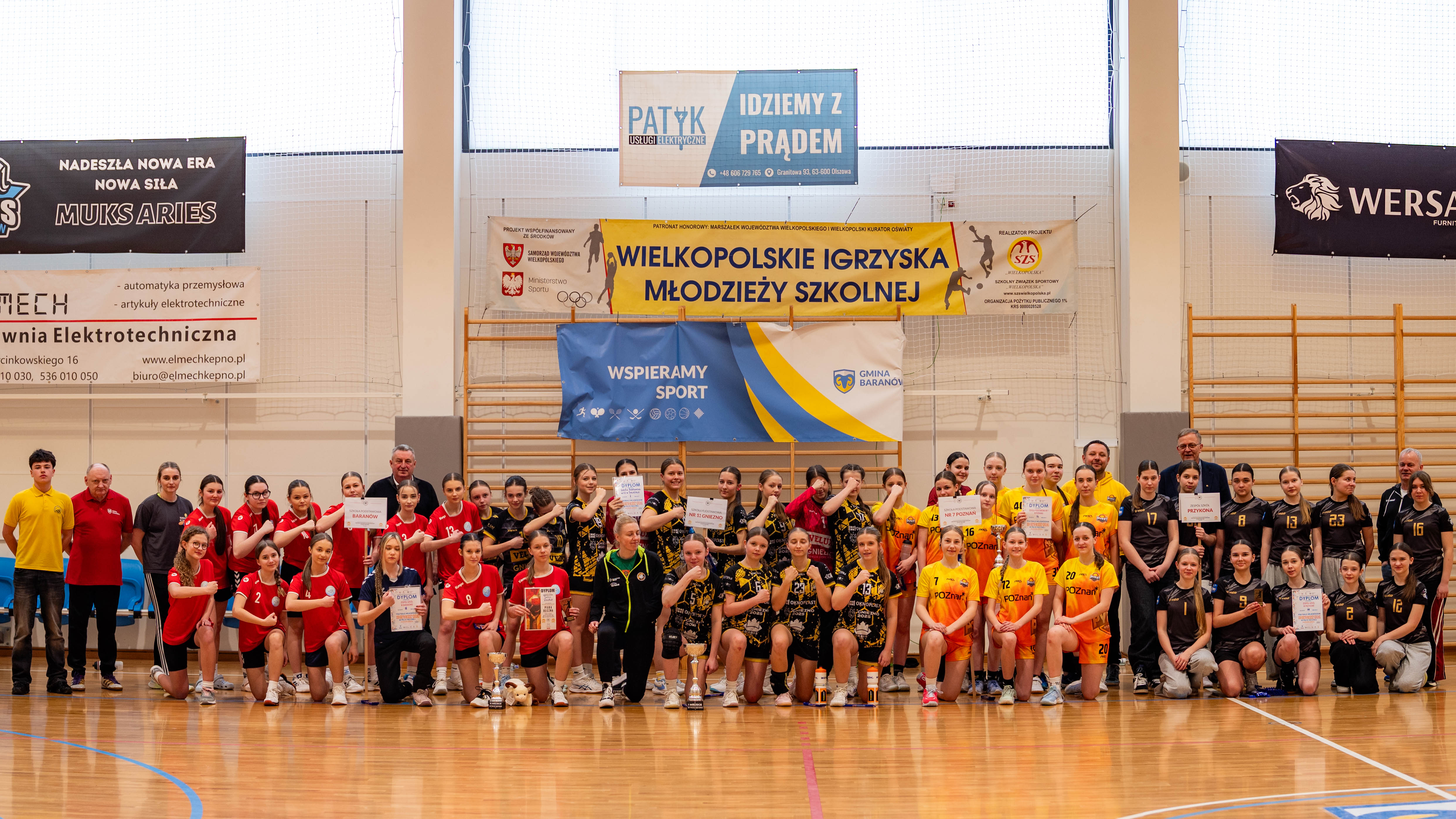 Wybudowana przed czterema laty baranowska hala sportowa po raz pierwszy gościła turniej rangi półfinału województwa. Decyzji o powierzeniu Baranowowi tego prestiżowego zadania z pewnością pomógł fakt, iż reprezentacja miejscowej szkoły wywalczyła awans do tej imprezy. Handbalistki ze szkoły w Baranowie na co dzień grają w barwach „Aries”, najmłodszego klubu sportowego w powiecie. Udział w baranowskim Półfinale to jak do tej pory największy sukces podopiecznych Pauliny Leszczyńskiej. Tym razem poprzeczka zawieszona została jeszcze wyżej. Szczypiornistki z Baranowa musiały stawić czoła trzem czołowym zespołom w Wielkopolsce (Przykona: trener Rafał Łukasik, Poznań: trener Tomasz Draszkiewicz, Gniezno: p. trener Martyna Bigoszewska-Jackowiak, Baranów: p. trener Paulina Leszczyńska), a tylko dwa z nich mogły zameldować się w Finale Wojewódzkim. Gospodarze starali się sprostać prestiżowemu zadaniu, jakim była organizacja takiego Turnieju. Uczestnicy zawodów, a niektórzy z nich dotarli przecież do południowych „Wrót Wielkopolski” po kilkugodzinnej podróży, podjęci zostali śniadaniem. Na zawodniczki oraz ich opiekunów czekała herbata i smaczne kanapki. Punktualnie o godz. 10.00, po prezentacji drużyn w iście olimpijskim stylu, Turniej otworzyła p. wójt Bogumiła Lewandowska-Siwek. Już pierwszy mecz pokazał, kto w tym Turnieju może grać pierwsze skrzypce. Drużyna z Gniezna rozbiła rywalki z Przykony, wbijając im aż 19 goli, a tracąc tylko jednego. Następny mecz rozgrzał publiczność do czerwoności. Poznanianki kilka razy uciekały Baranowiankom na kilka punktów, ale w sześciu kluczowych momentach zadrżały im ręce i kolana. Z trzech najtrudniejszych w trakcie regulaminowego czasu prób dla bramkarki, jakimi są rzuty karne, Kasia Garyga, golkiperka Baranowa, wyszła zwycięsko. Co więcej, w serii rzutów karnych ani razu nie dała się pokonać! Po zwycięstwie z Przykoną, baranowianki złożyły swój sportowy los w ręce rywalek z Poznania i Gniezna. Poznanianki, by myśleć o awansie, musiały wygrać z Gnieznem. I tej przeszkody nie udało im się pokonać. Baranowskiemu turniejowi patronował olimpijski duch fair play. Żywiołowi kibice wspierali jak tylko mogli swój zespół, ale nagradzali również udane akcje pozostałych teamów. Ceremonia wręczenia nagród, ufundowanych przez wójta Gminy Baranów (puchary, dyplomy, statuetki oraz niecodzienne upominki dla najlepszych zawodniczek – bramkarki, MVP oraz snajperki) miała więc fantastyczną oprawę. Każda z wyróżnionych szczypiornistek wzbogaciła swoją kolekcję trofeów o maskotkę, urokliwego Baranka – Franka. Po zmaganiach sportowych na wszystkich uczestników turnieju czekał zaś smaczny obiad (ems).
