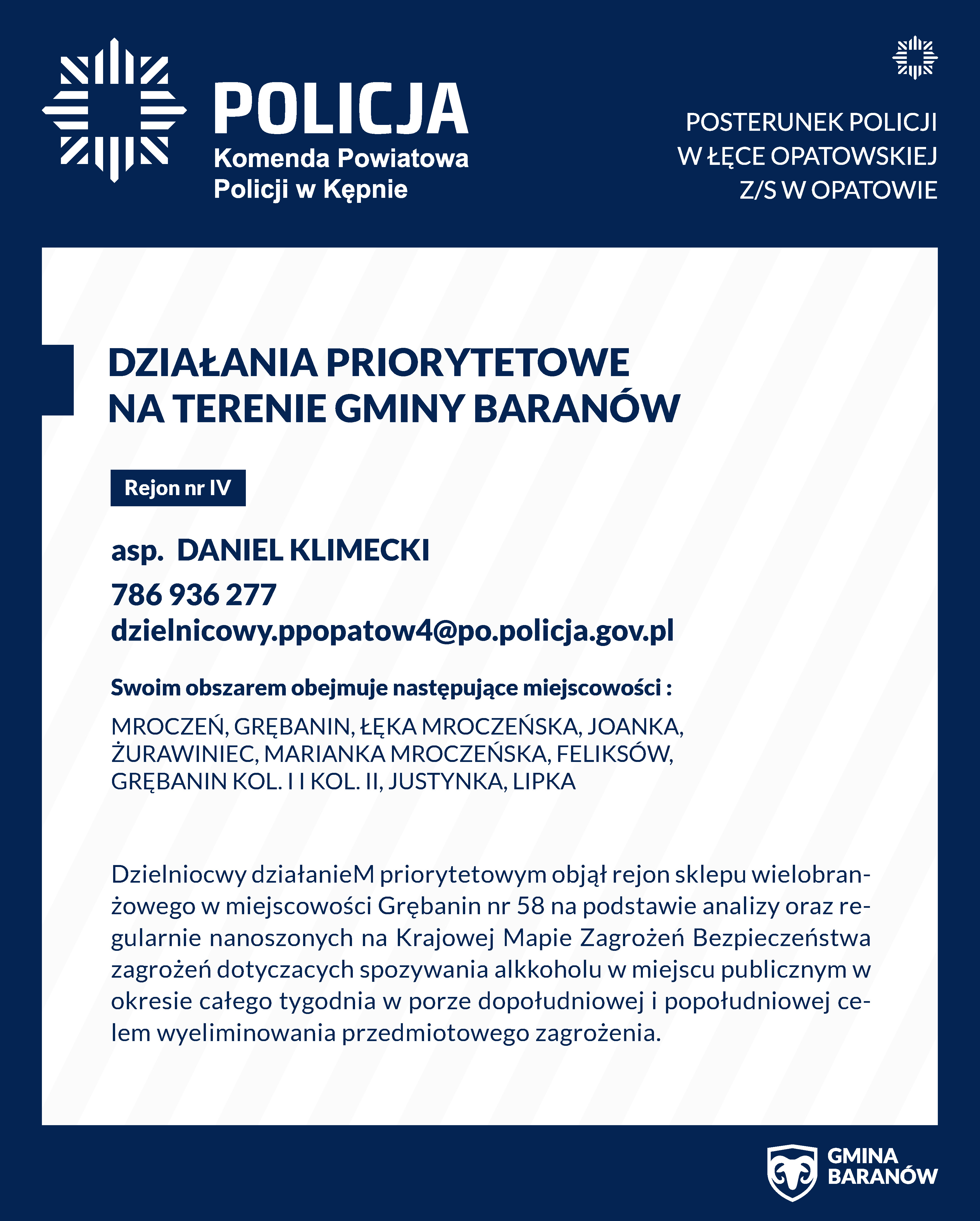 Posterunek Policji w Łęce Opatowskiej z/s w Opatowie przedstawia plan działań priorytetowych na terenie Gminy Baranów na najbliższy okres. Plan został stworzony na podstawie zdiagnozowanych oczekiwań społecznych oraz analizy zagrożeń dokonanej w rejonach służbowych.