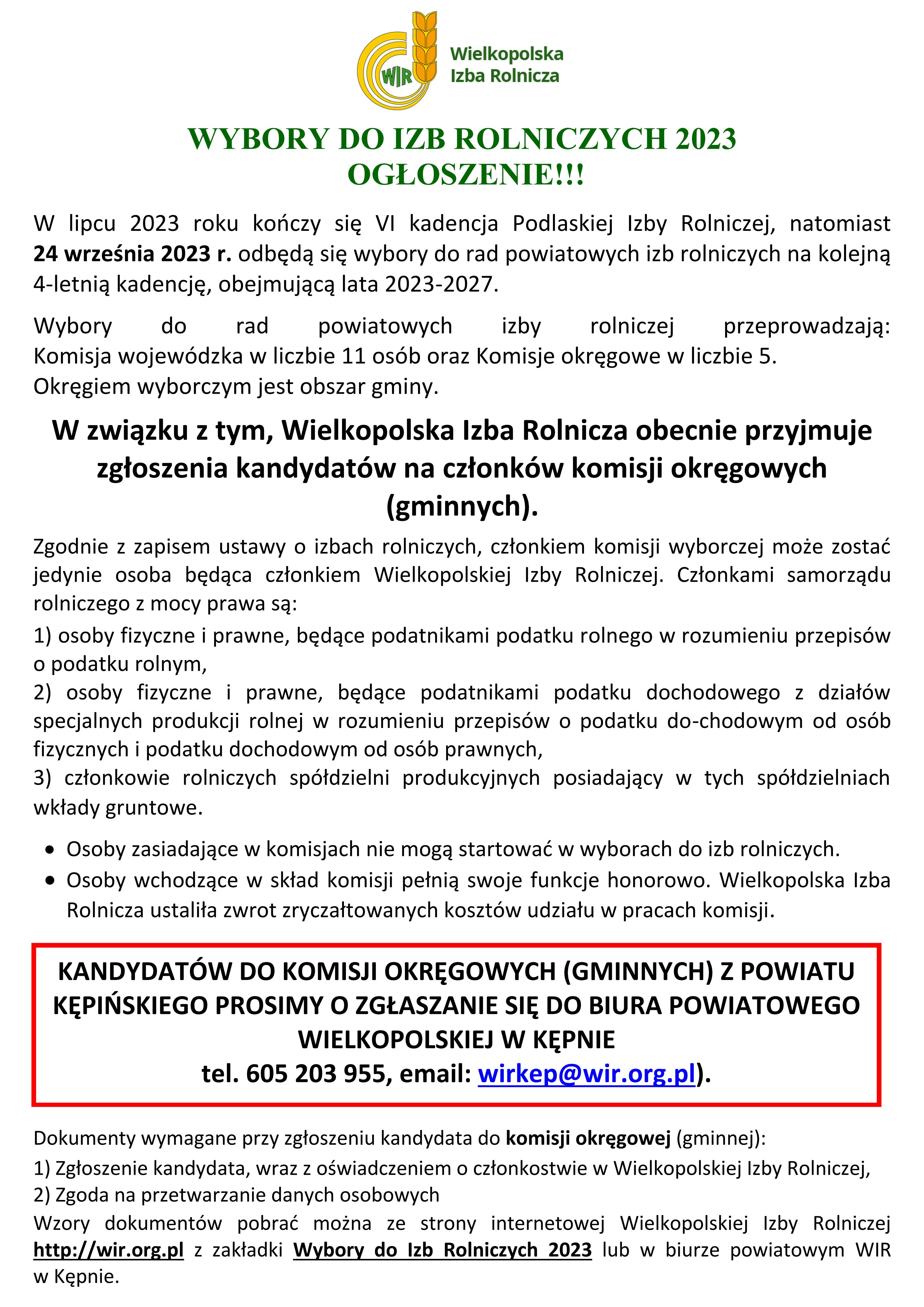 W lipcu 2023 roku kończy się VI kadencja Podlaskiej Izby Rolniczej, natomiast 24 września 2023 r. odbędą się wybory do rad powiatowych izb rolniczych na kolejną 4-letnią kadencję, obejmującą lata 2023-2027. W związku z tym, Wielkopolska Izba Rolnicza obecnie przyjmuje zgłoszenia kandydatów na członków komisji okręgowych (gminnych).
