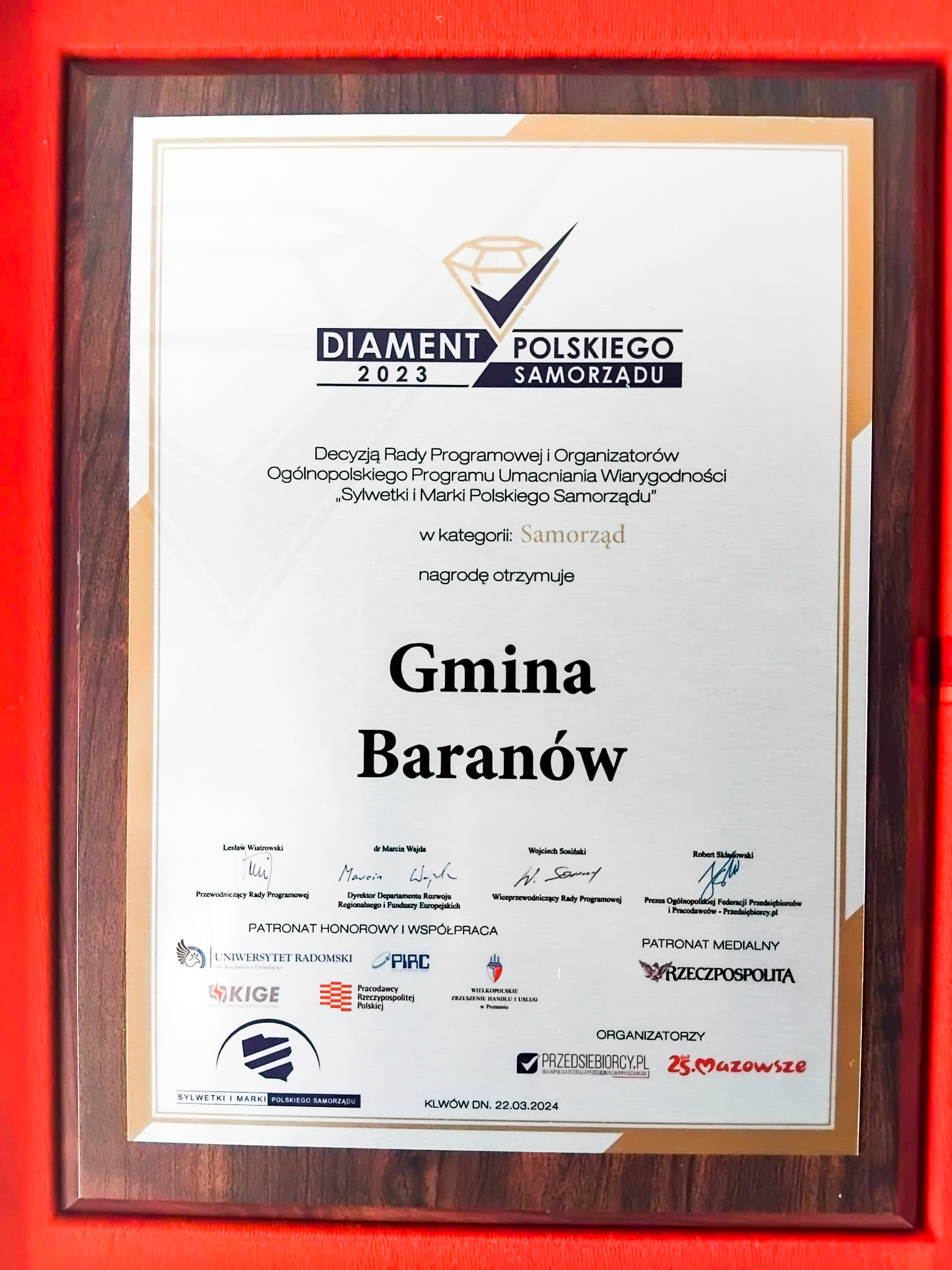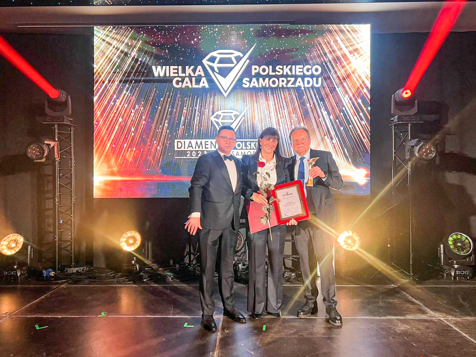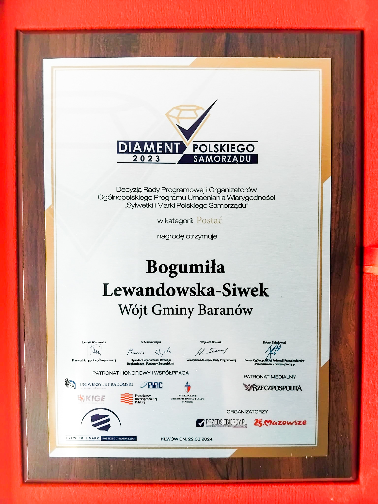 Wójt Gminy Baranów Bogumiła Lewandowska-Siwek odebrała nagrodę dla Gminy Baranów w kategorii Samorząd, jednocześnie sama została uhonorowana prestiżową nagrodą "Diament Polskiego Samorządu 2023" w kategorii postać.