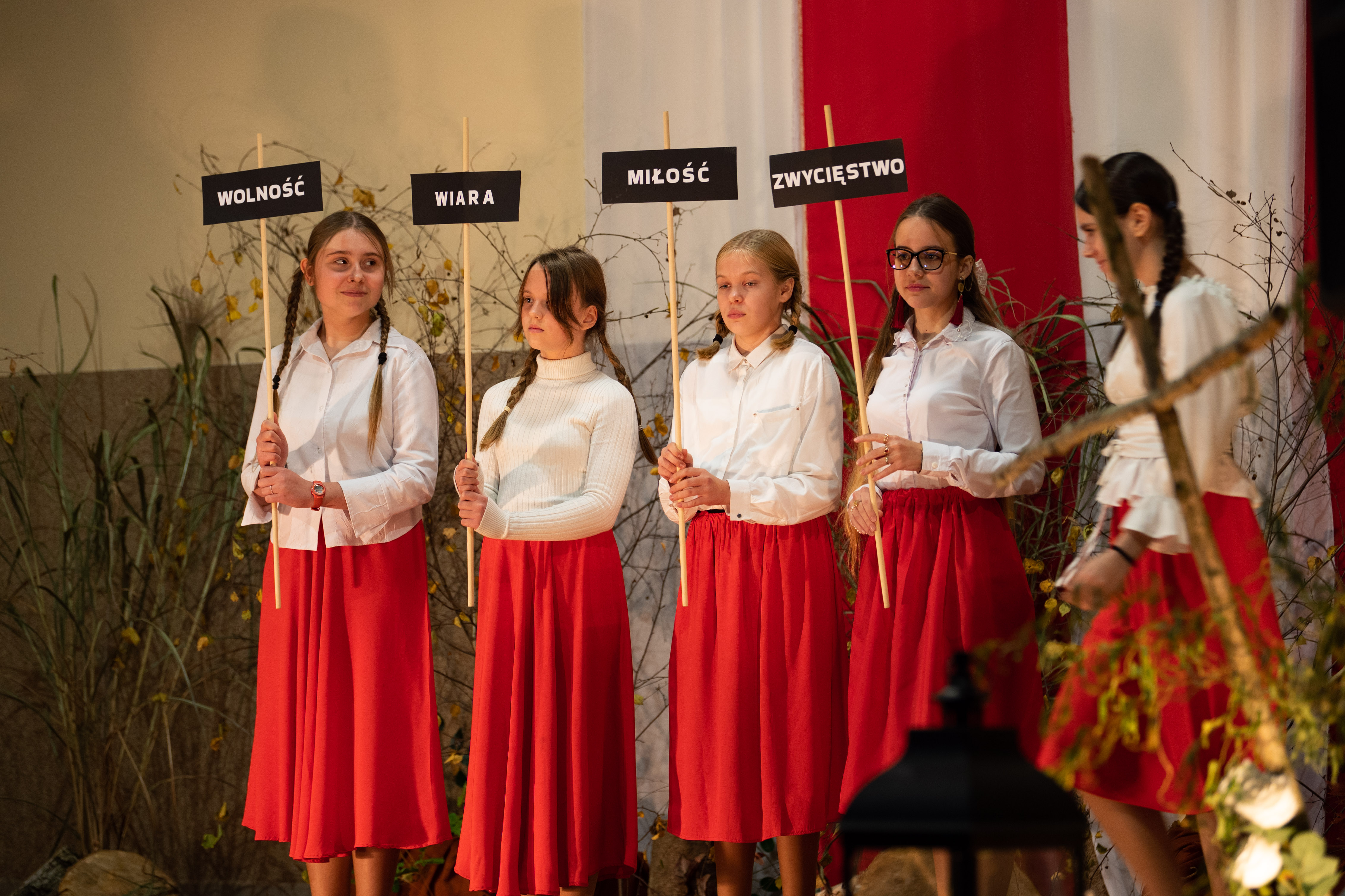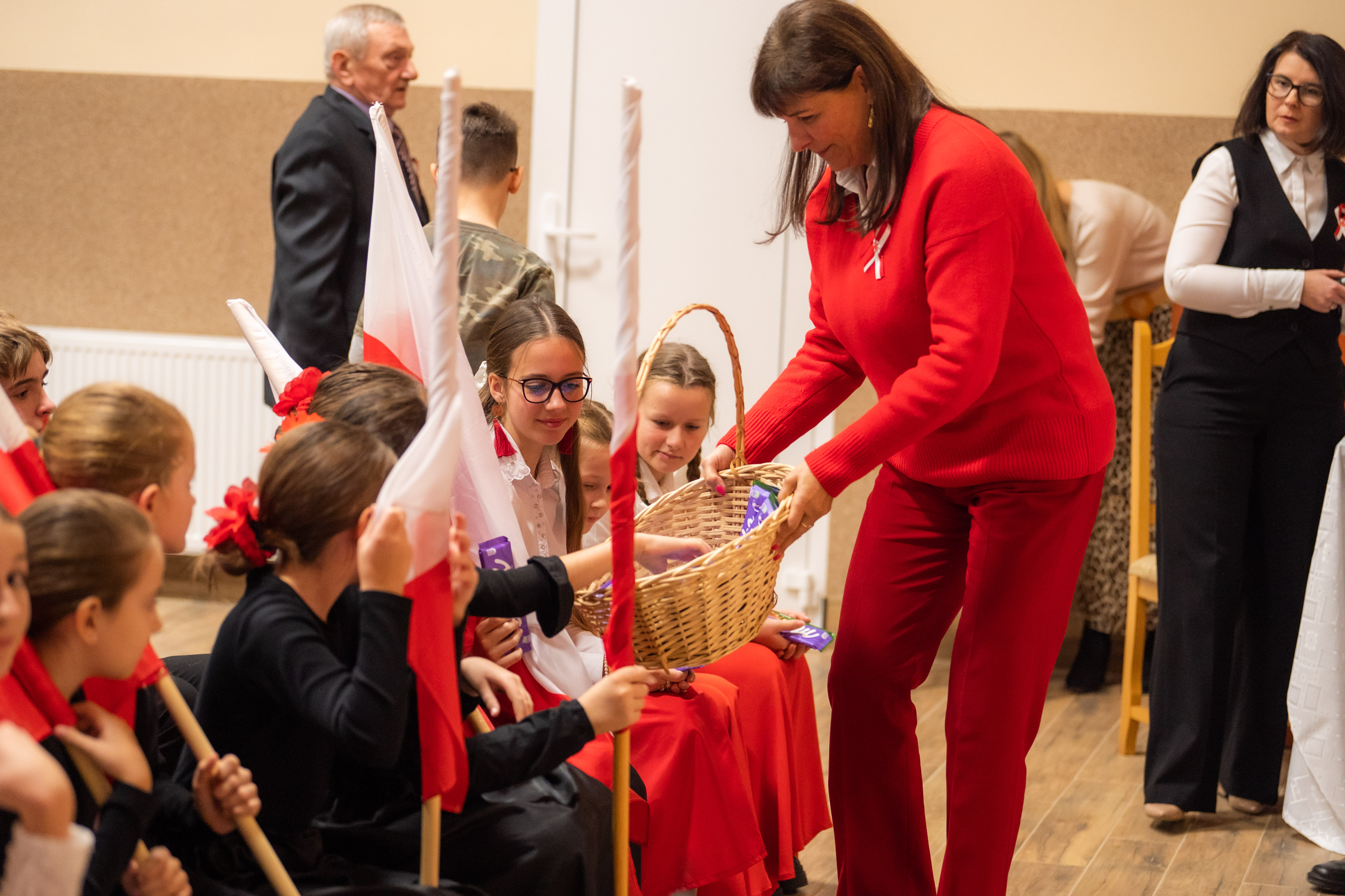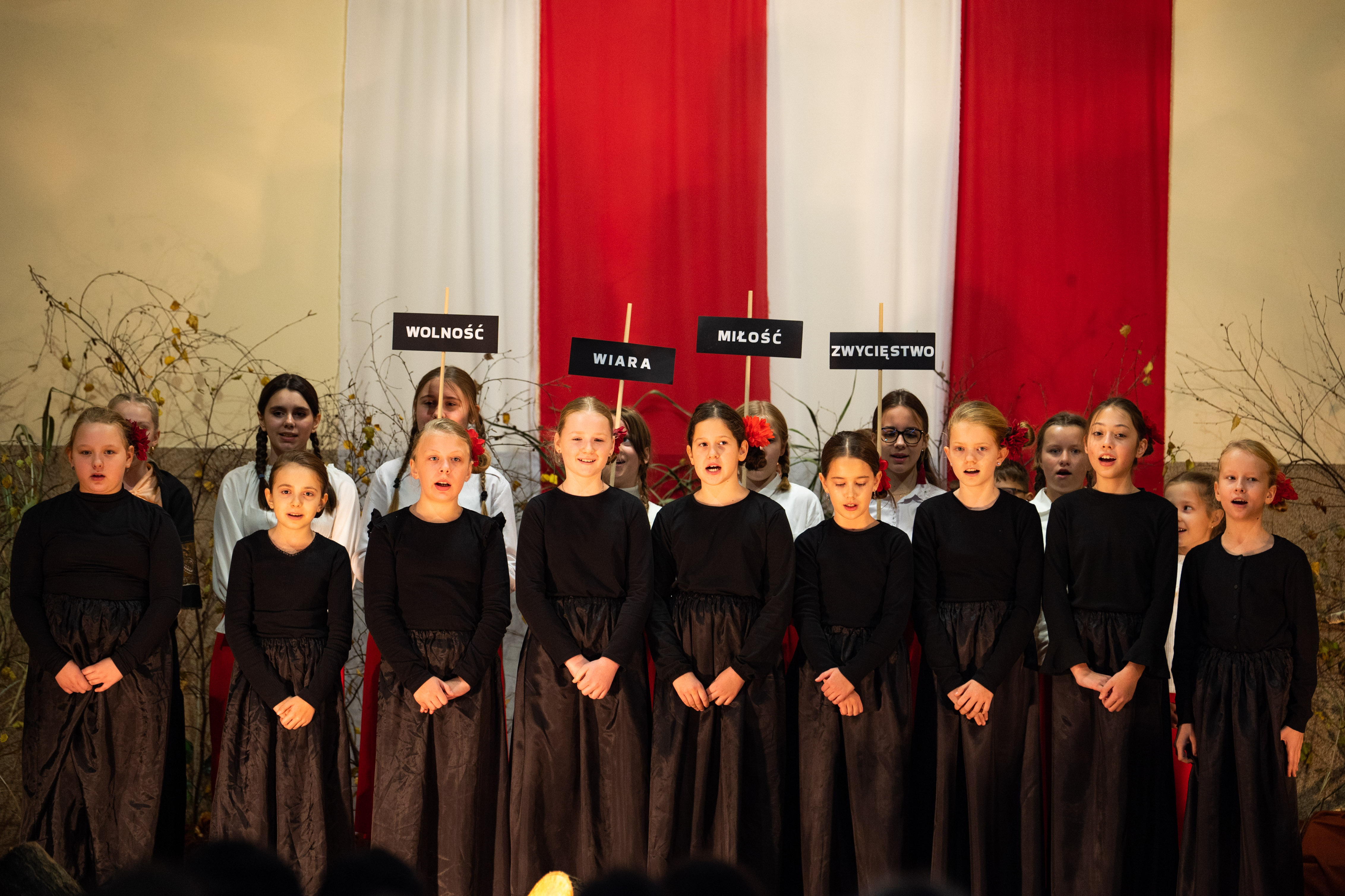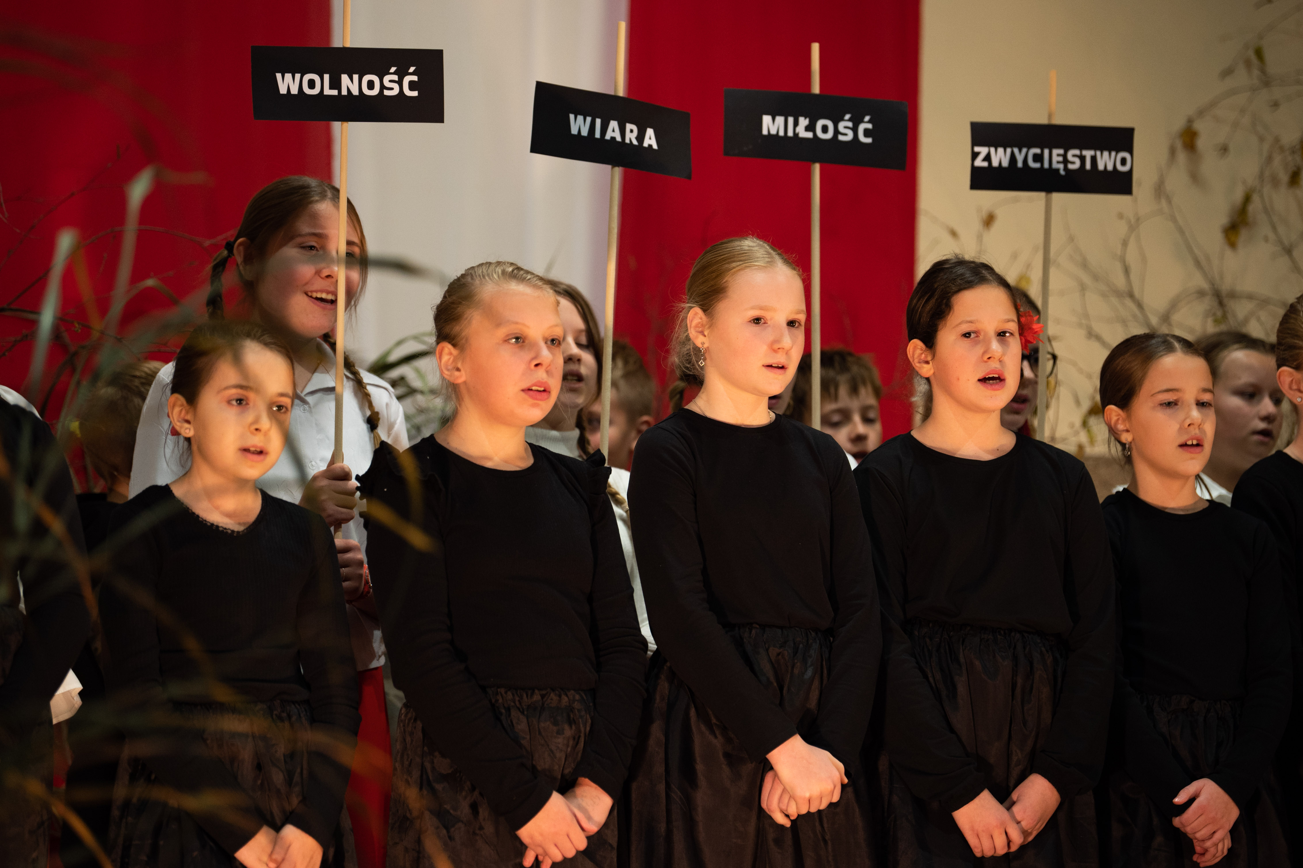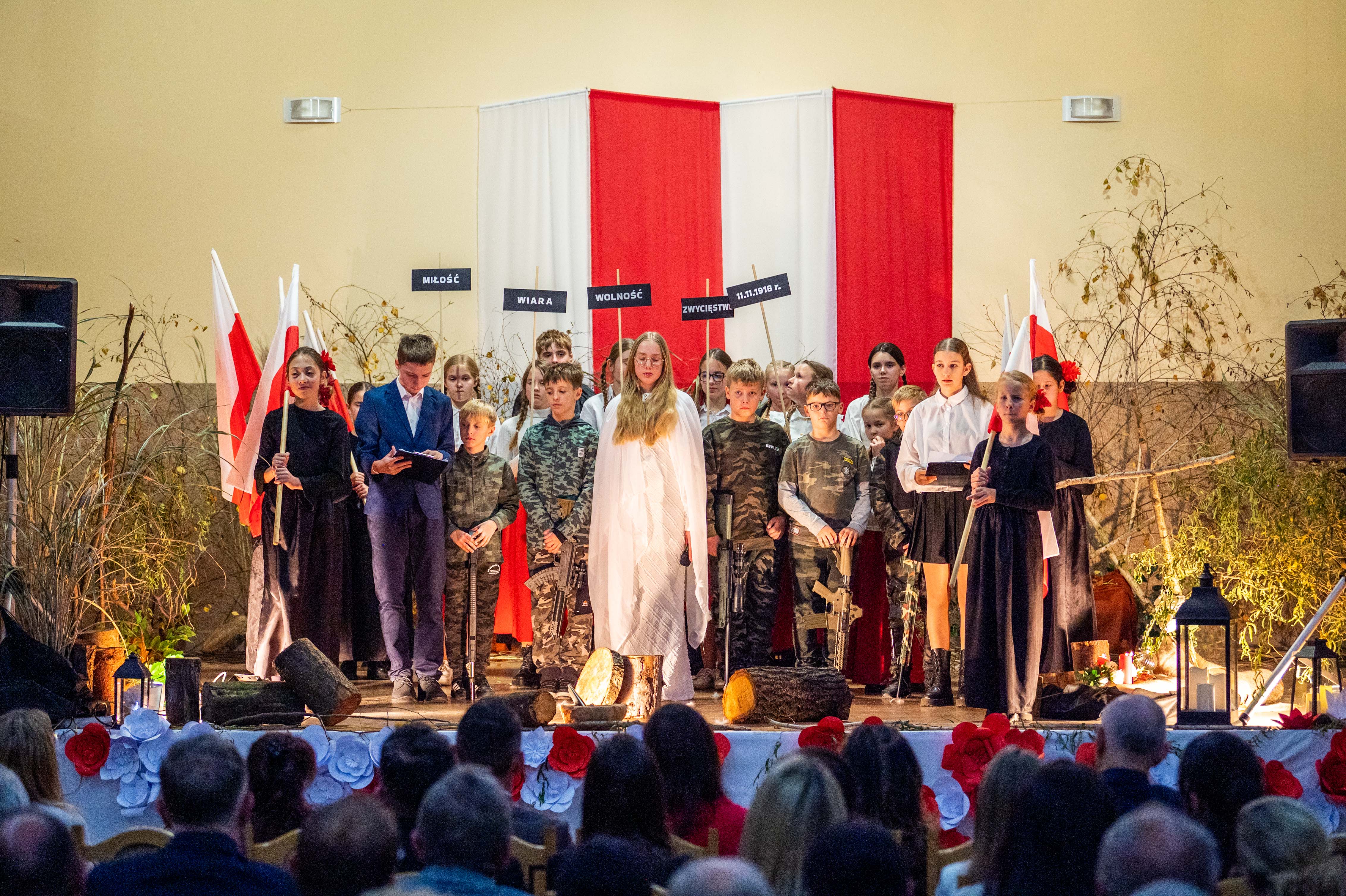 Uroczystość uświetnił patriotyczny występ uczniów z miejscowej szkoły, przygotowany pod kierunkiem Agnieszki Skąpskiej – Hełki. Młodzi artyści prozą i wierszem przypomnieli tragiczne losy naszej ojczyzny i heroiczną postawę Polaków, którzy nie godzili się z niewolą i gorąco pragnęli wolności. Podkreślili ważne dla wszystkich pokoleń słowa: wolność, wiara, miłość i zwycięstwo. Szczególną wymowę miała scena rozszarpywania Polski – białego orła – przez trzy czarne kruki. Uczniowie śpiewali pieśni patriotyczne bliskie sercom Polaków, o czym świadczyło włączanie się gości do śpiewu. Wzruszenie wywołała pięknie, delikatnie odśpiewana piosenka o Jasieńku, który zginął, a ukochana czeka z pąkami białych róż. Scenę finałową poprzedził taniec dziewczynek z flagami, po którym znów pojawił się orzeł – Polska już bez więzów niewoli, dumna i niepokonana. Widzowie na stojąco nagrodzili młodych artystów gromkimi brawami.