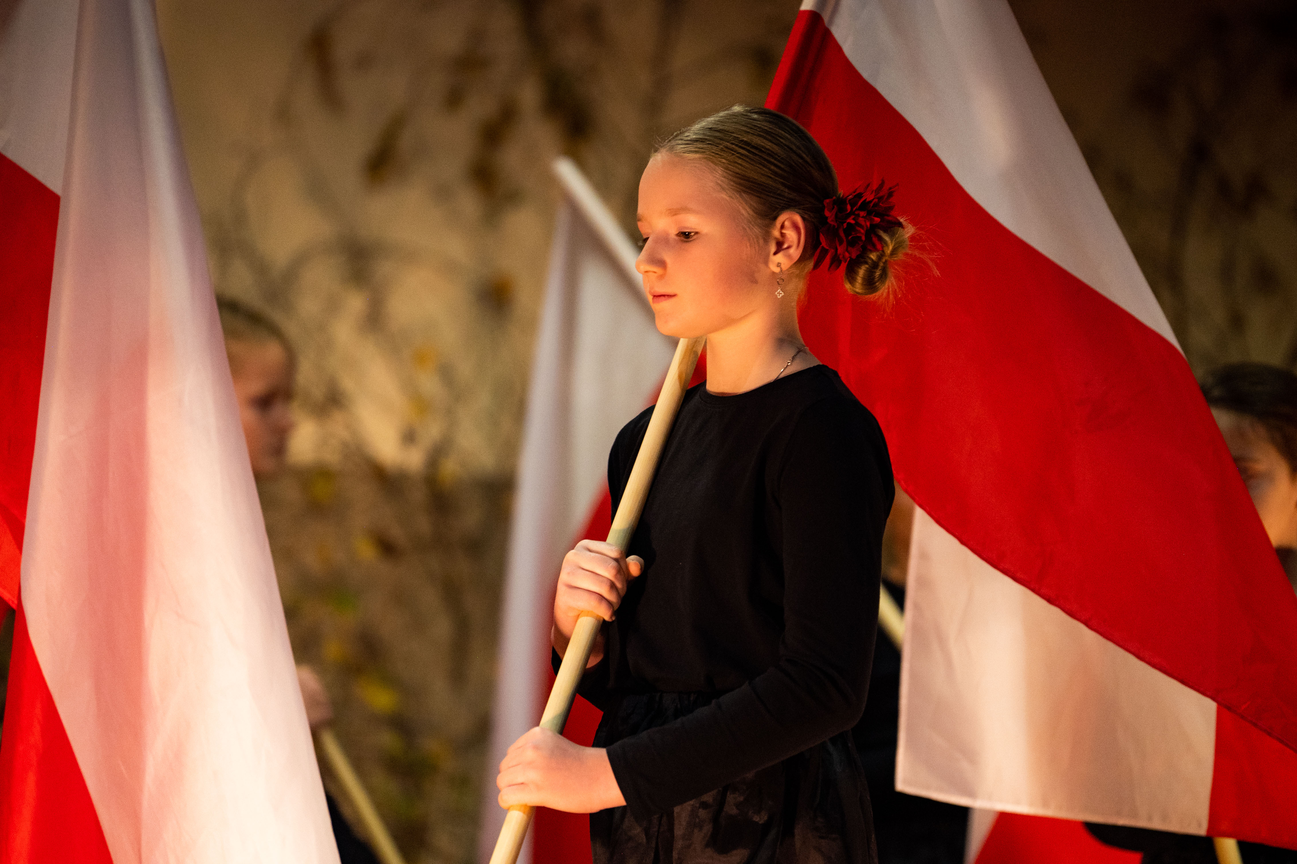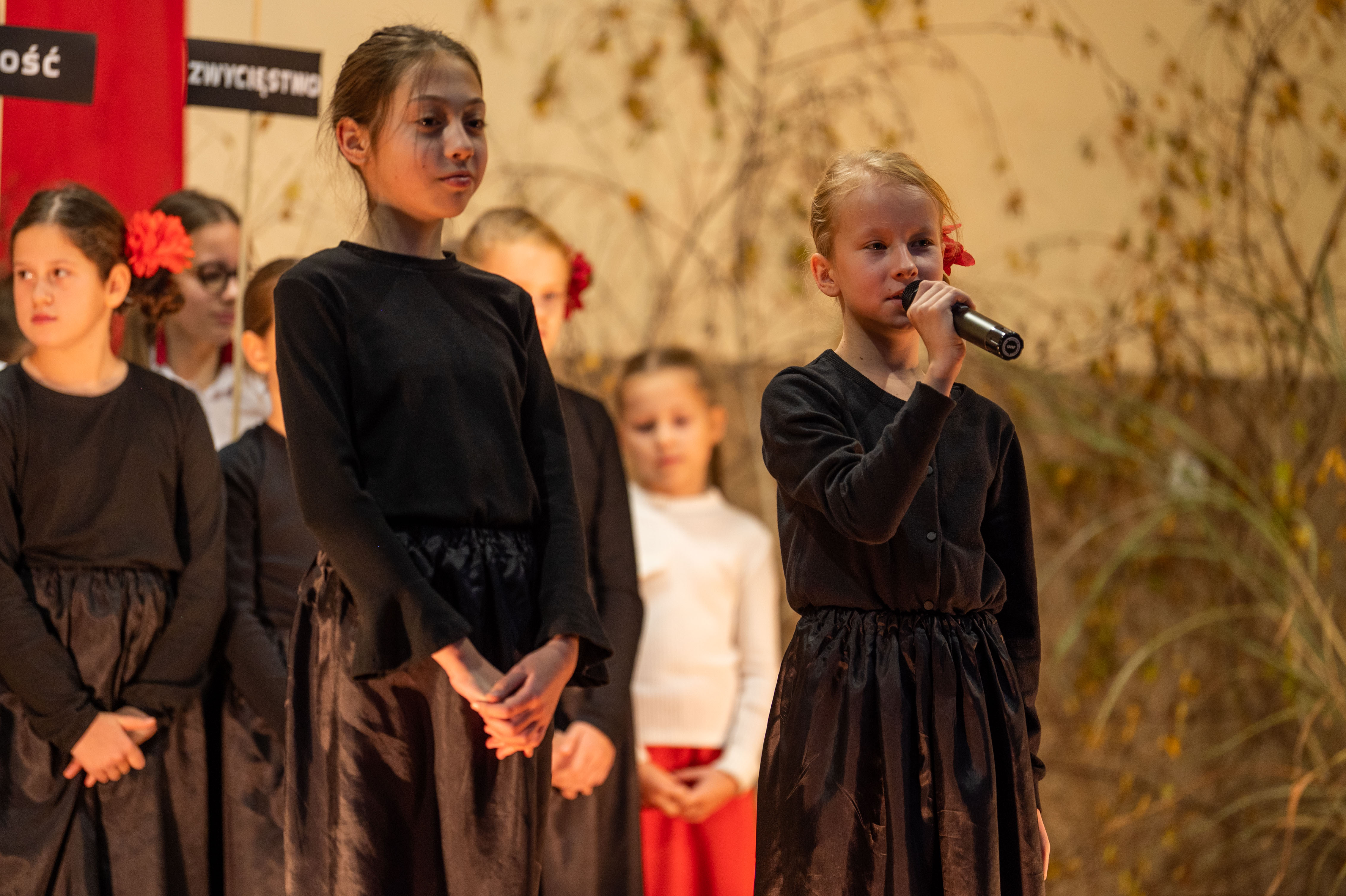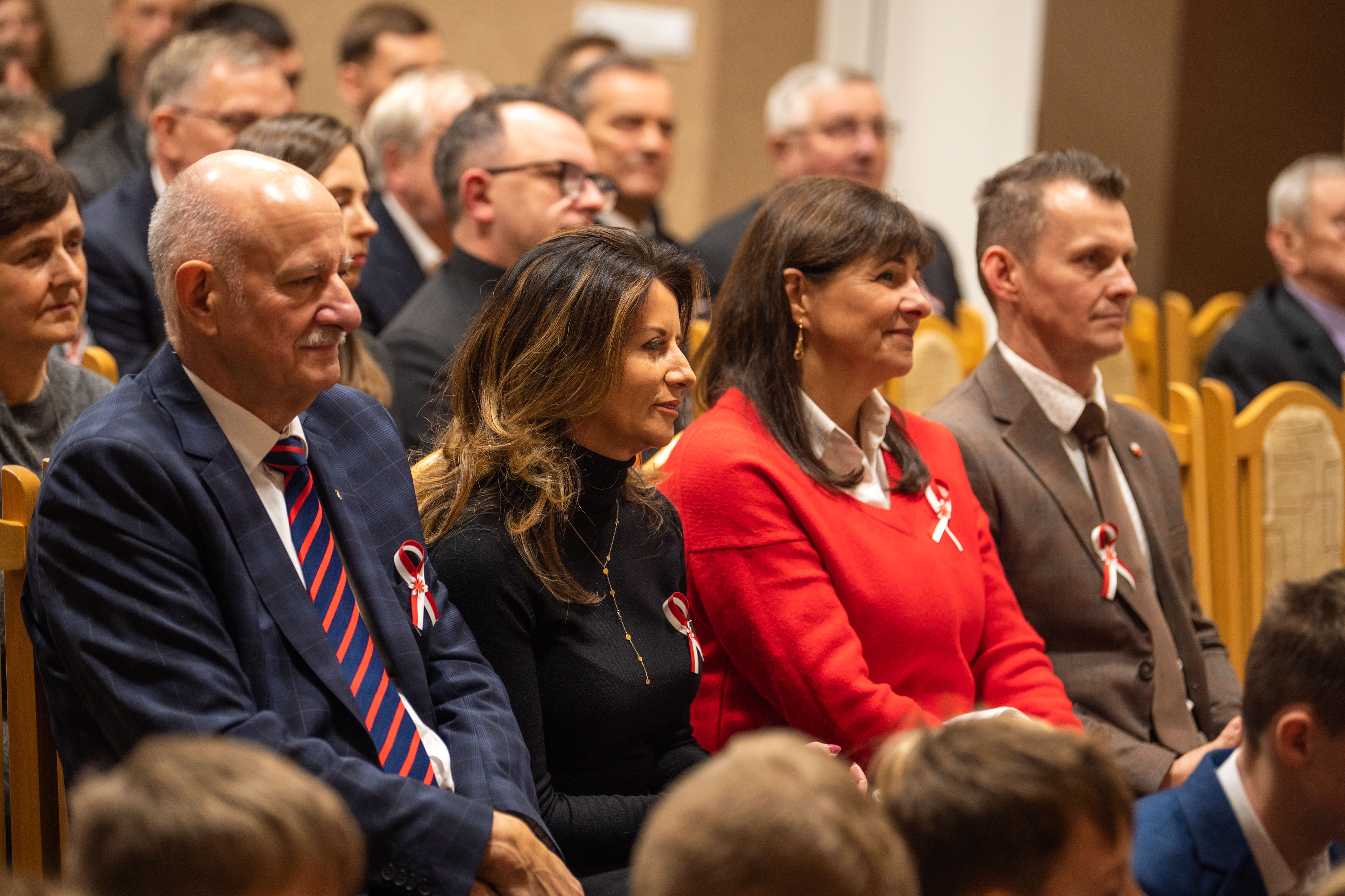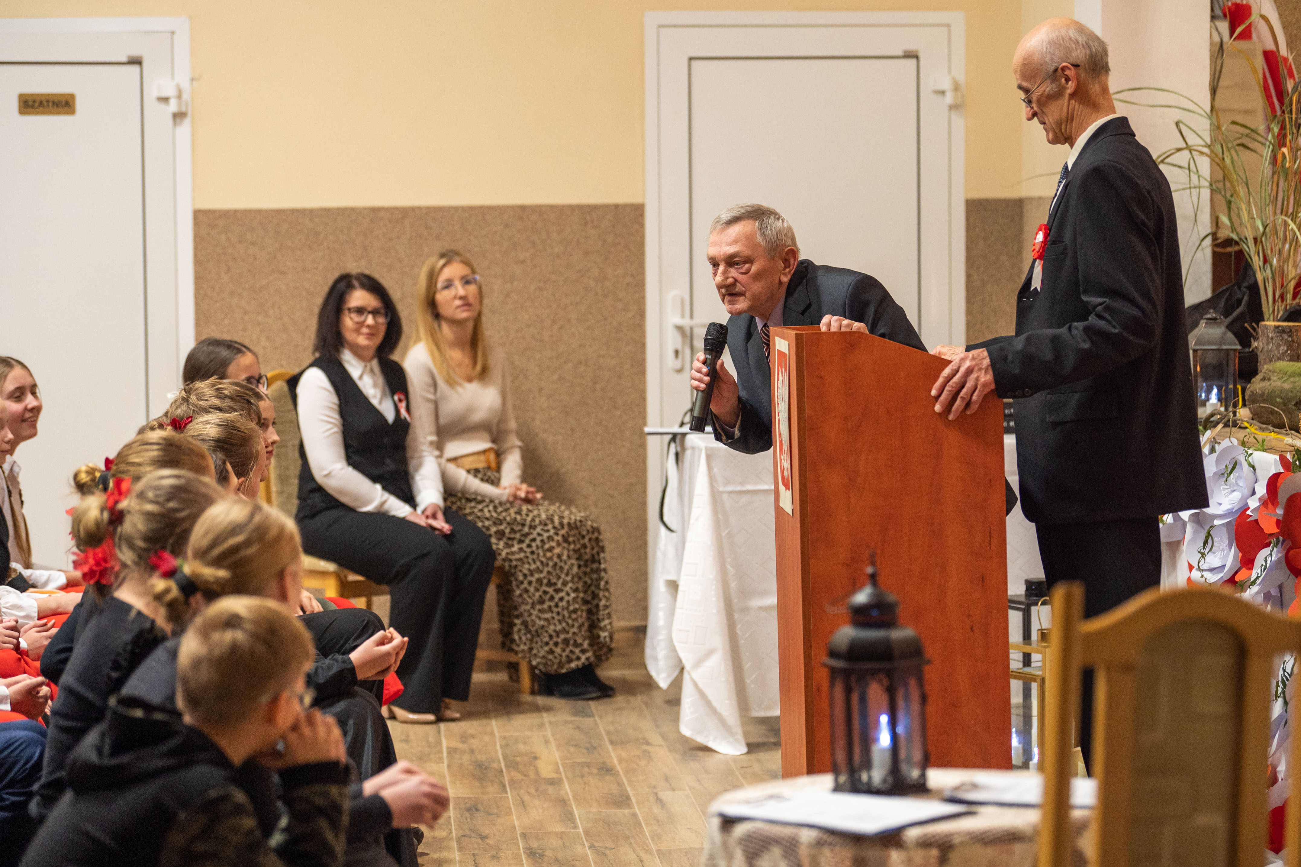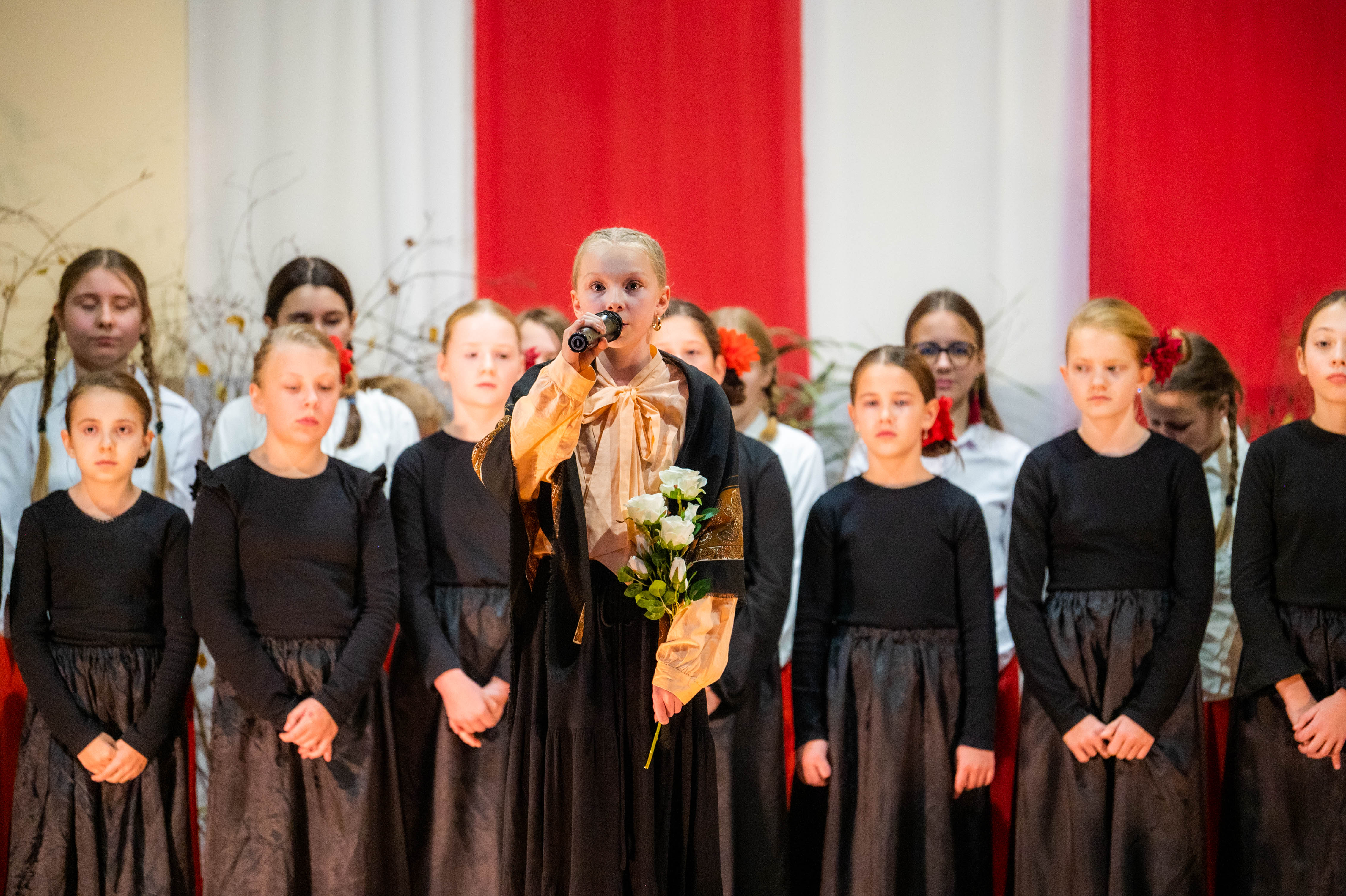Uroczystość uświetnił patriotyczny występ uczniów z miejscowej szkoły, przygotowany pod kierunkiem Agnieszki Skąpskiej – Hełki. Młodzi artyści prozą i wierszem przypomnieli tragiczne losy naszej ojczyzny i heroiczną postawę Polaków, którzy nie godzili się z niewolą i gorąco pragnęli wolności. Podkreślili ważne dla wszystkich pokoleń słowa: wolność, wiara, miłość i zwycięstwo. Szczególną wymowę miała scena rozszarpywania Polski – białego orła – przez trzy czarne kruki. Uczniowie śpiewali pieśni patriotyczne bliskie sercom Polaków, o czym świadczyło włączanie się gości do śpiewu. Wzruszenie wywołała pięknie, delikatnie odśpiewana piosenka o Jasieńku, który zginął, a ukochana czeka z pąkami białych róż. Scenę finałową poprzedził taniec dziewczynek z flagami, po którym znów pojawił się orzeł – Polska już bez więzów niewoli, dumna i niepokonana. Widzowie na stojąco nagrodzili młodych artystów gromkimi brawami.