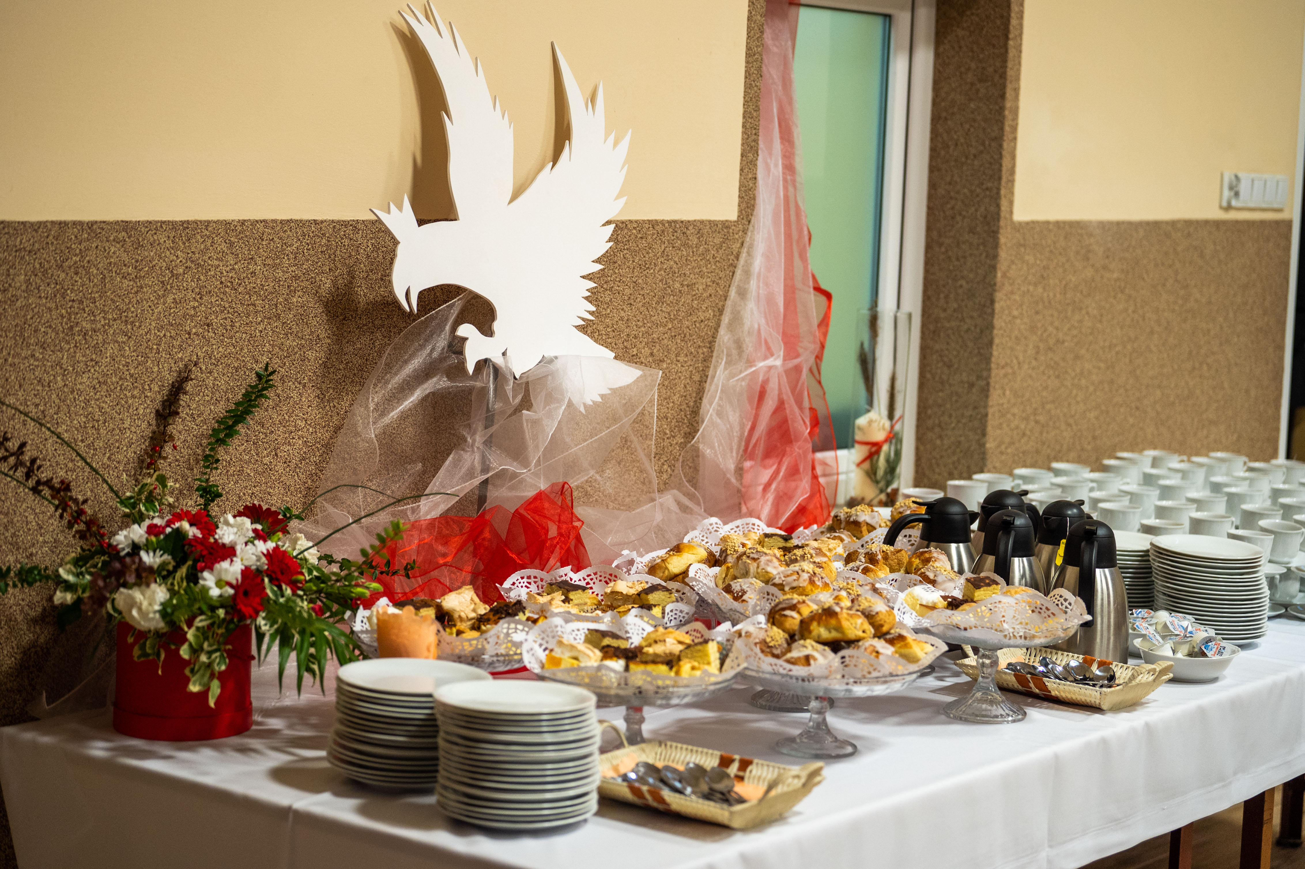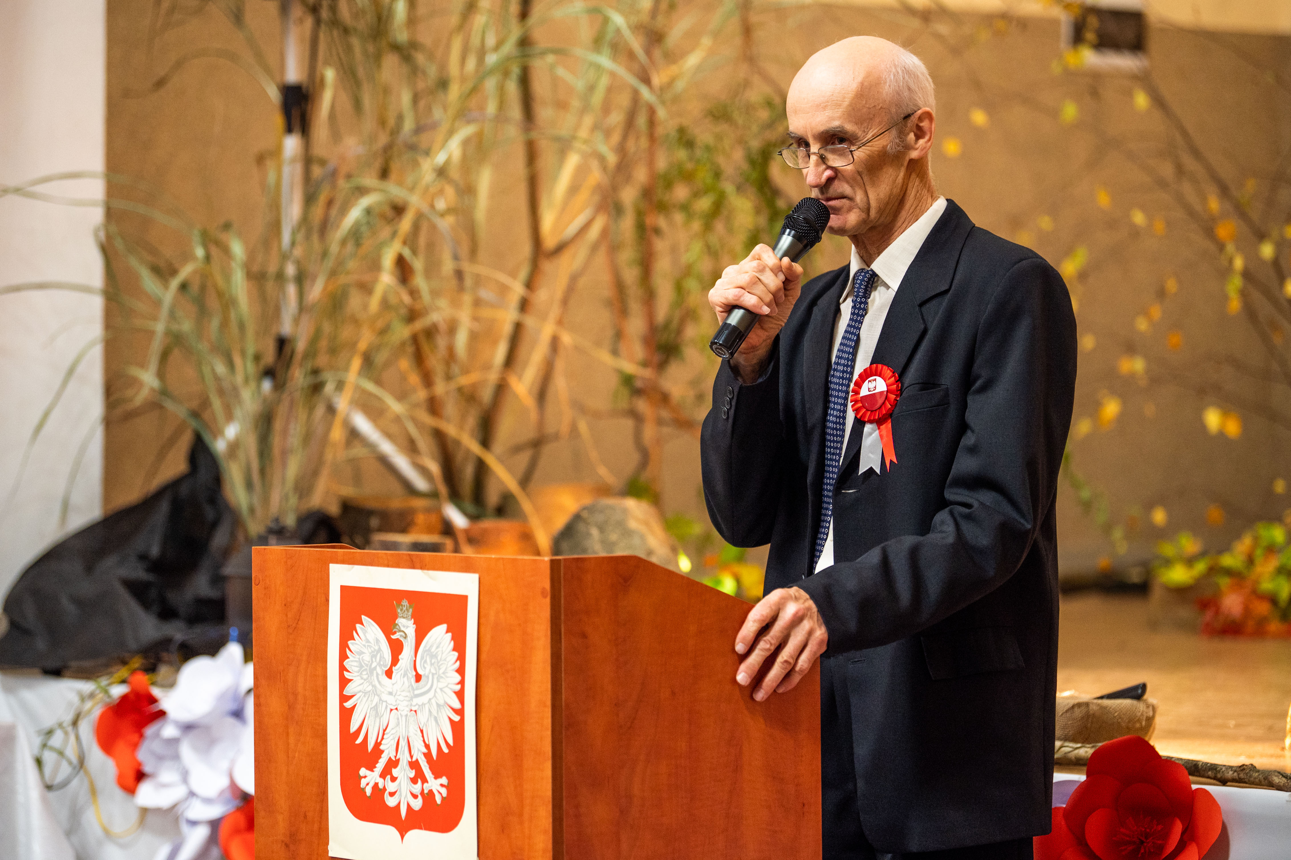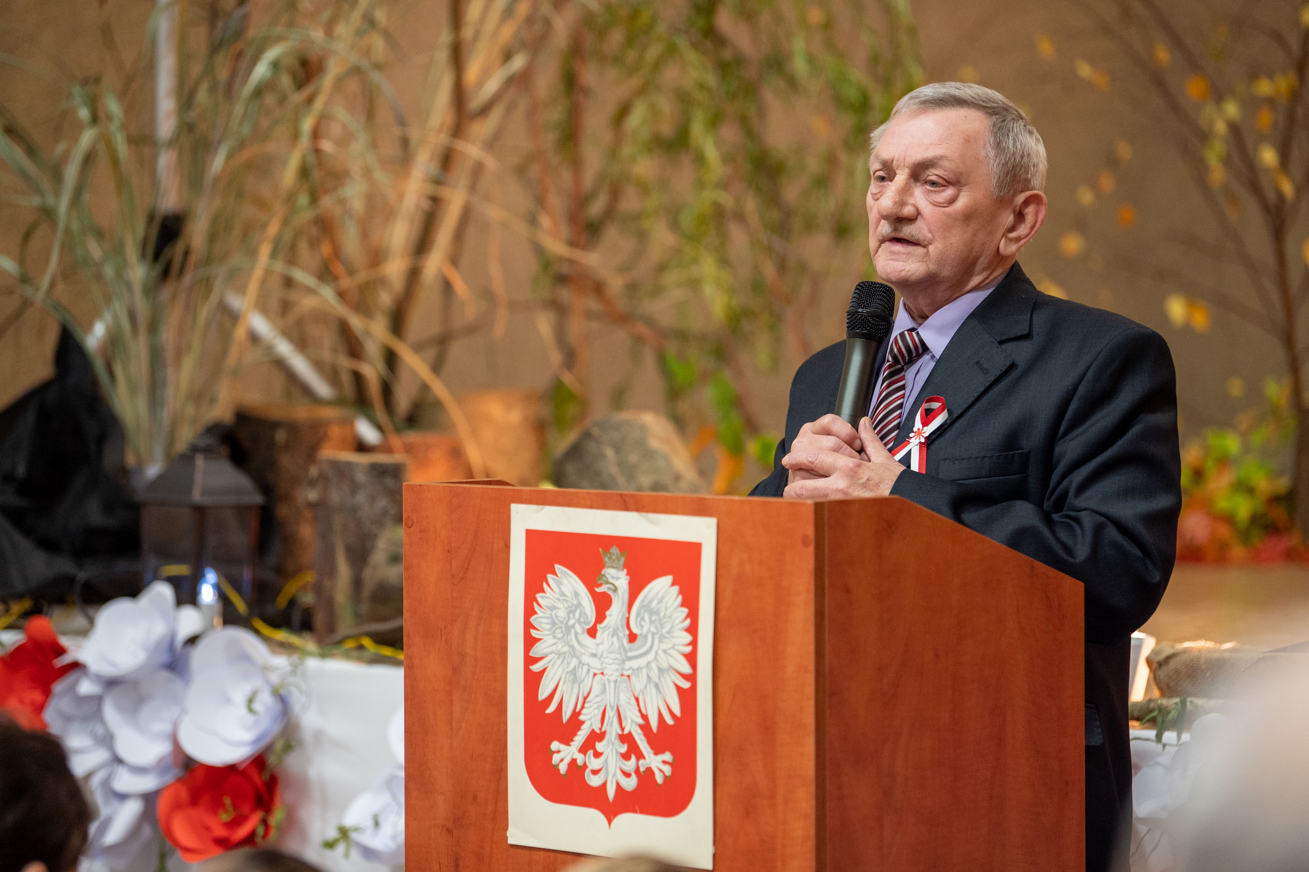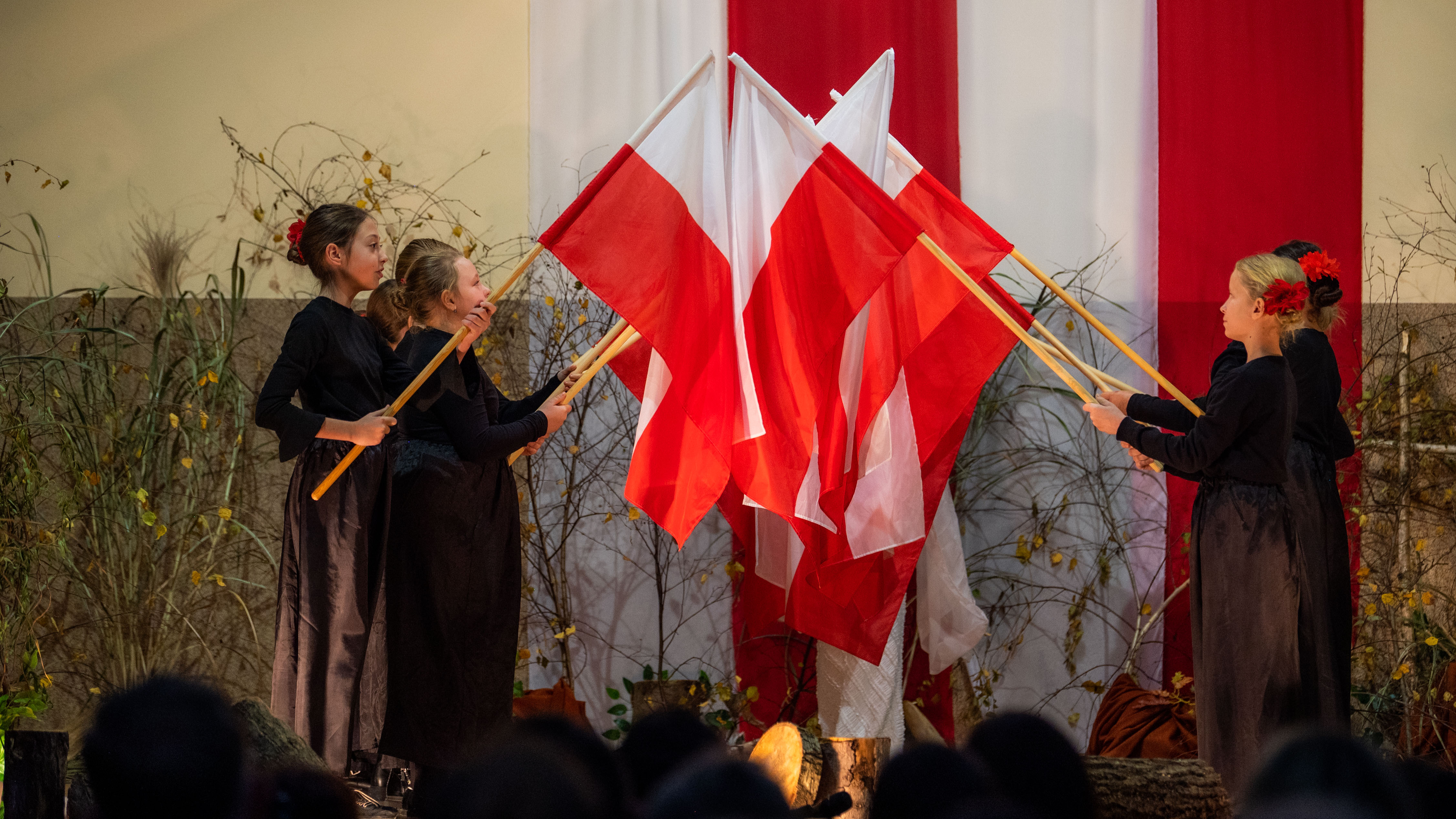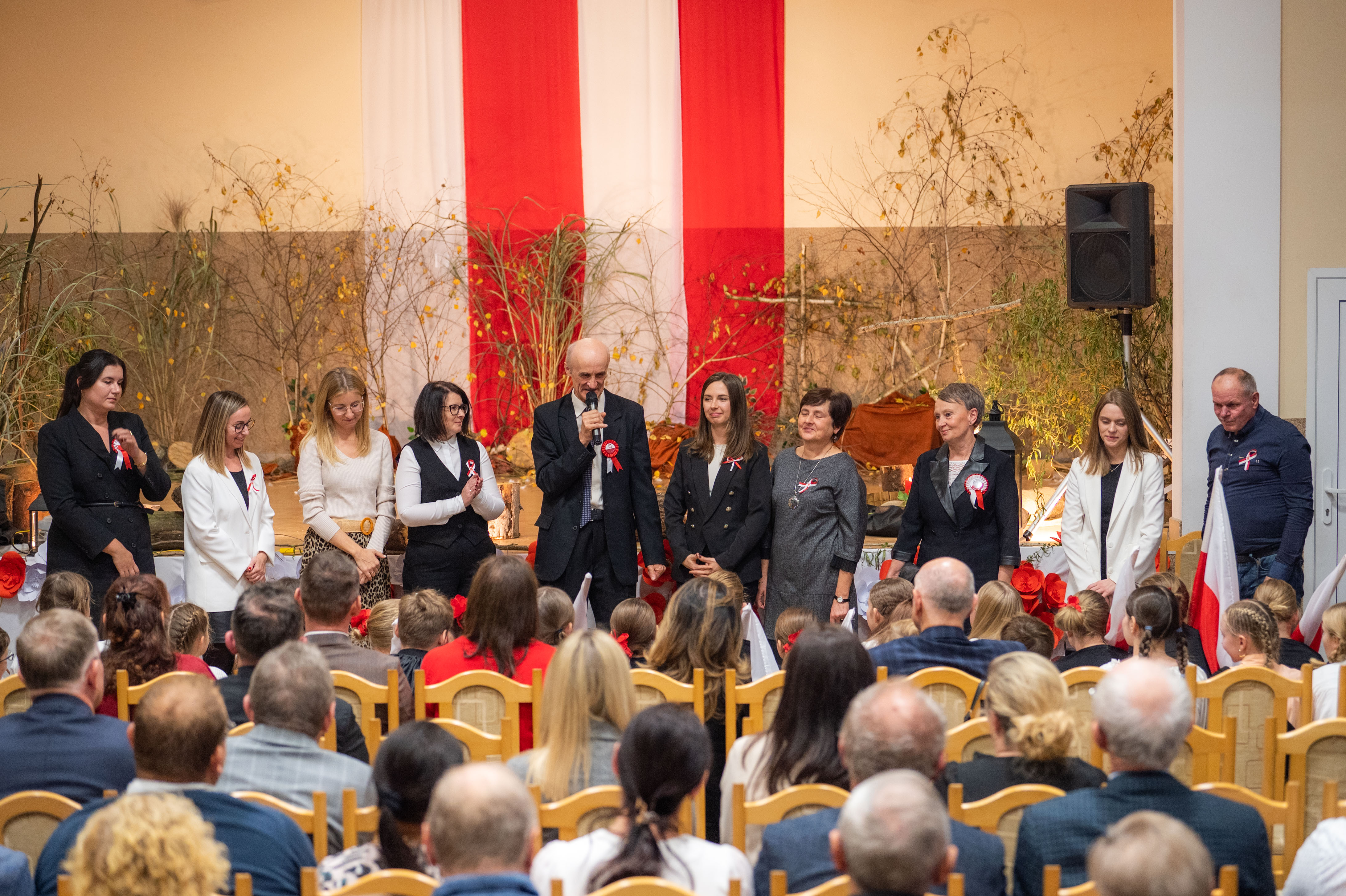Uroczystość uświetnił patriotyczny występ uczniów z miejscowej szkoły, przygotowany pod kierunkiem Agnieszki Skąpskiej – Hełki. Młodzi artyści prozą i wierszem przypomnieli tragiczne losy naszej ojczyzny i heroiczną postawę Polaków, którzy nie godzili się z niewolą i gorąco pragnęli wolności. Podkreślili ważne dla wszystkich pokoleń słowa: wolność, wiara, miłość i zwycięstwo. Szczególną wymowę miała scena rozszarpywania Polski – białego orła – przez trzy czarne kruki. Uczniowie śpiewali pieśni patriotyczne bliskie sercom Polaków, o czym świadczyło włączanie się gości do śpiewu. Wzruszenie wywołała pięknie, delikatnie odśpiewana piosenka o Jasieńku, który zginął, a ukochana czeka z pąkami białych róż. Scenę finałową poprzedził taniec dziewczynek z flagami, po którym znów pojawił się orzeł – Polska już bez więzów niewoli, dumna i niepokonana. Widzowie na stojąco nagrodzili młodych artystów gromkimi brawami.