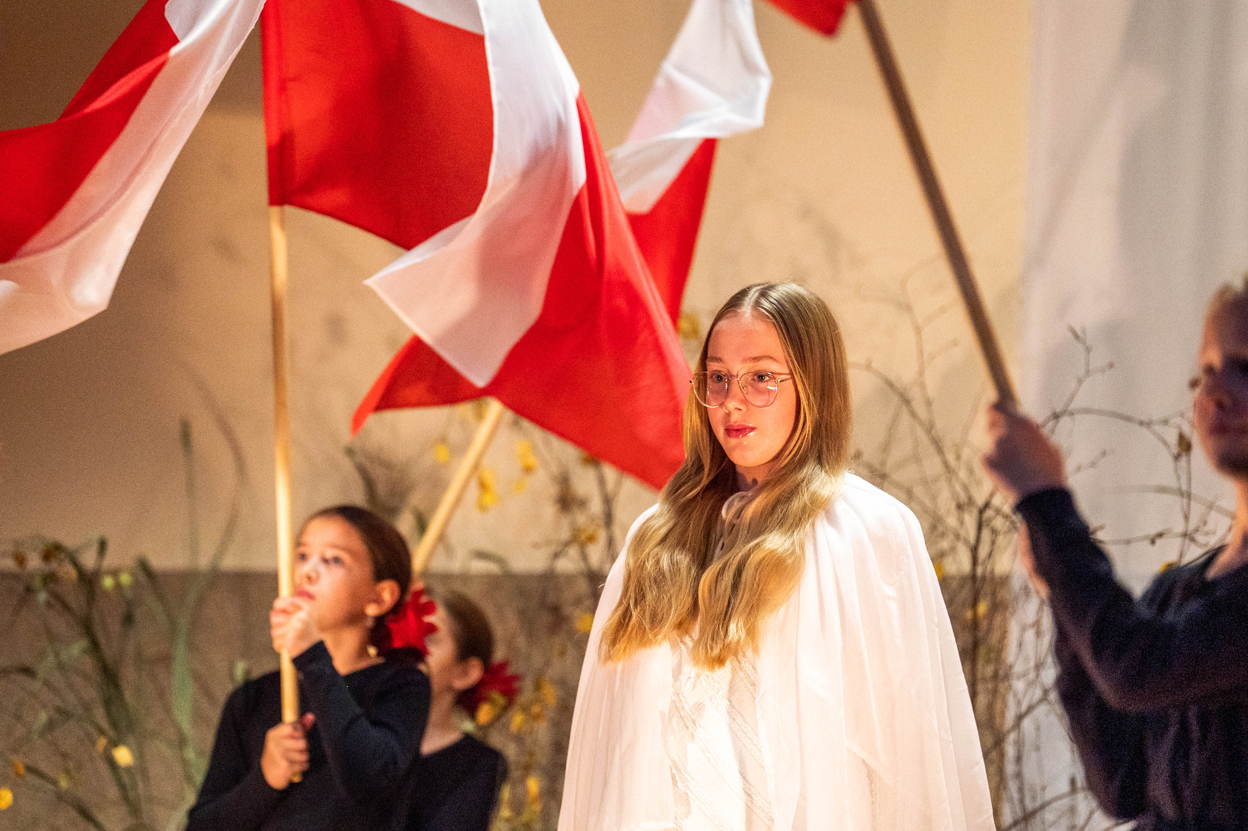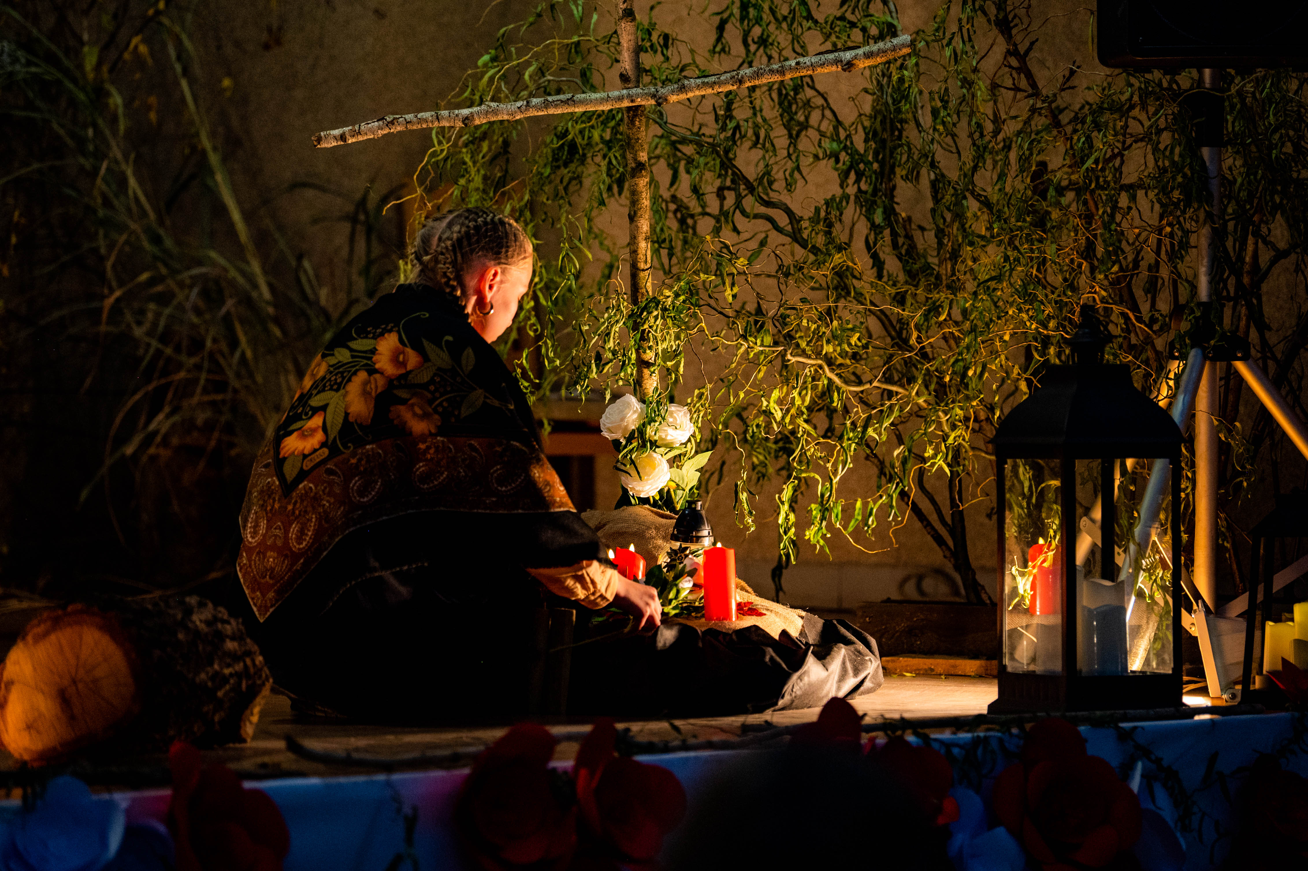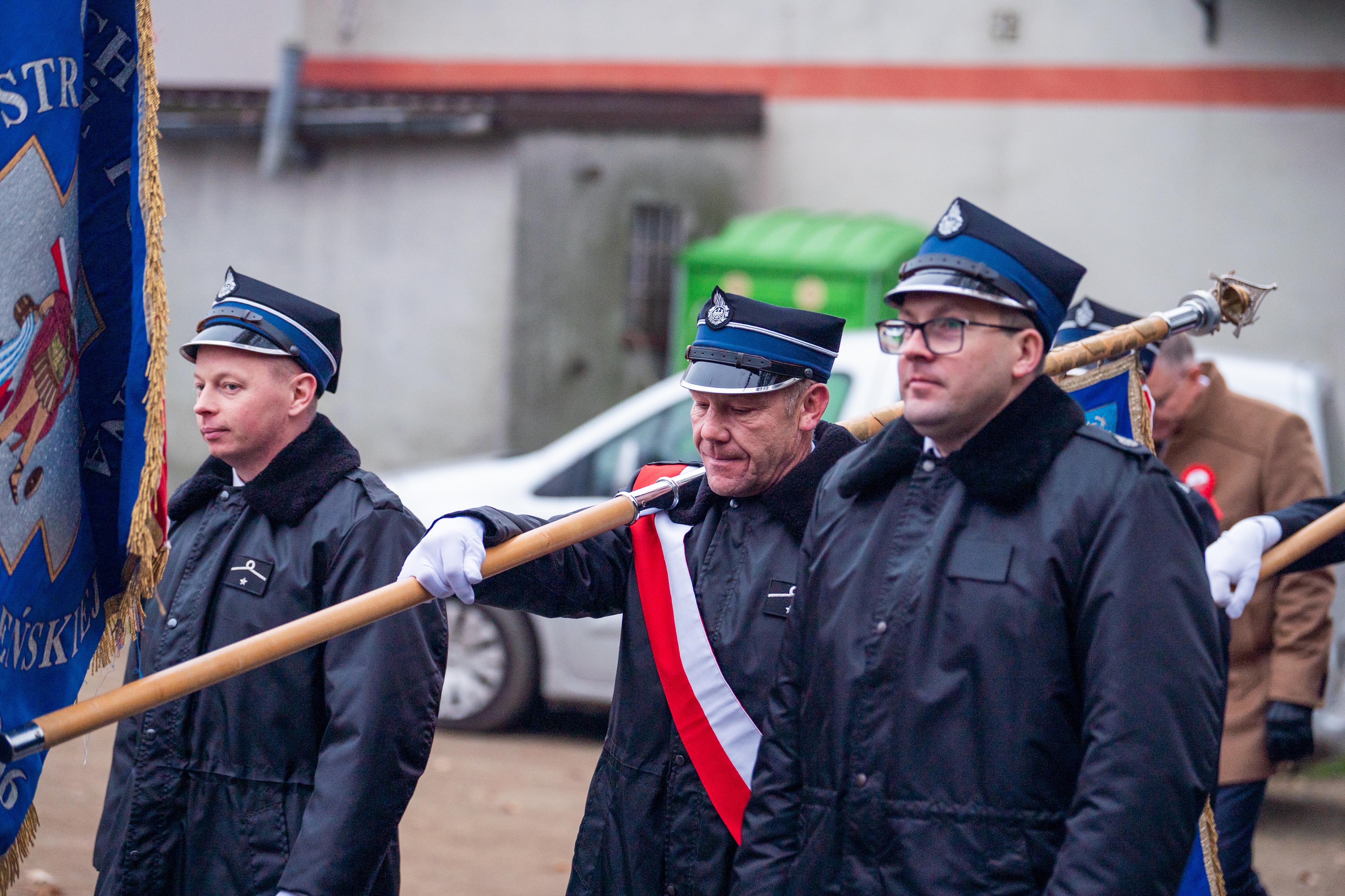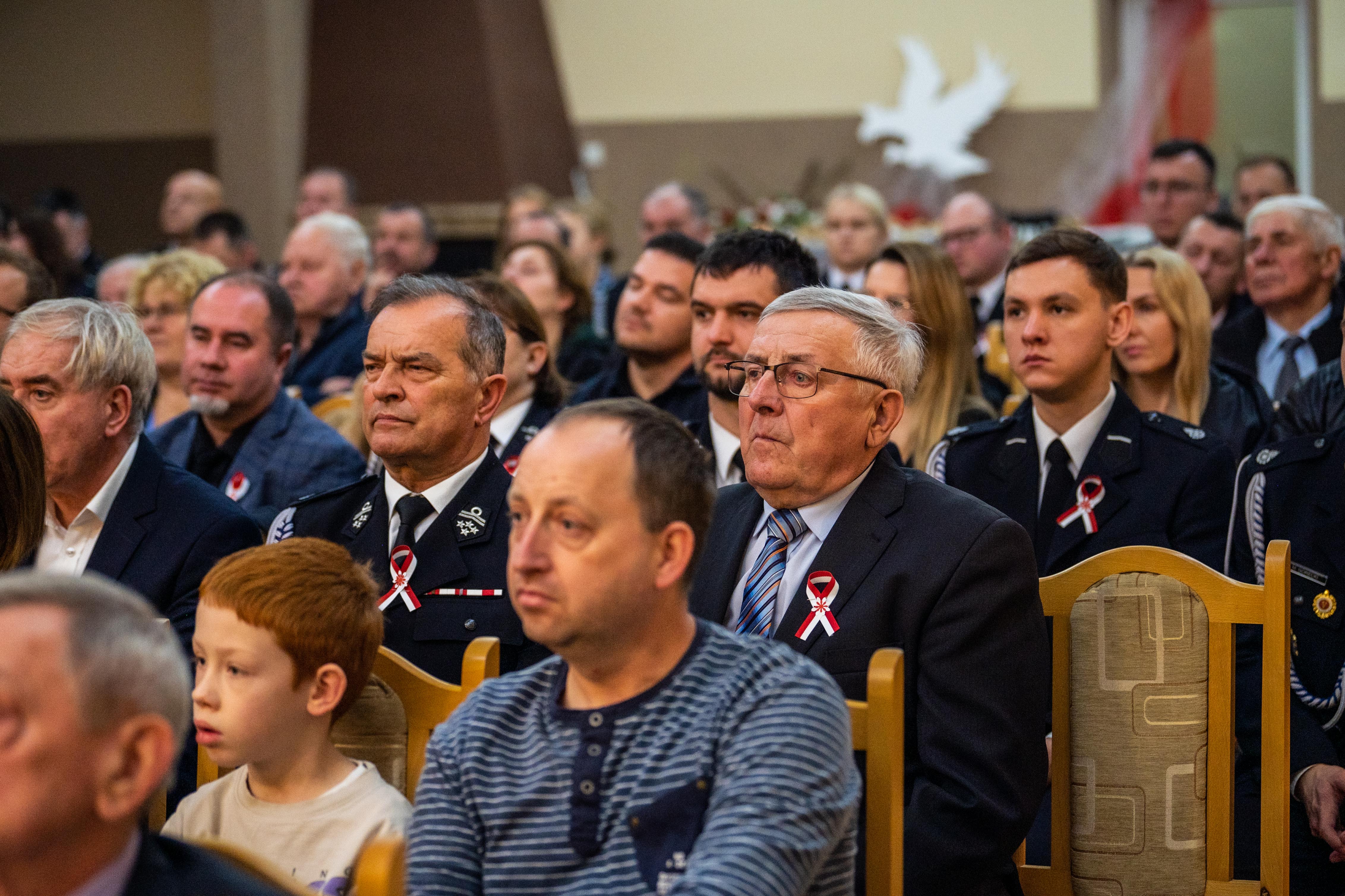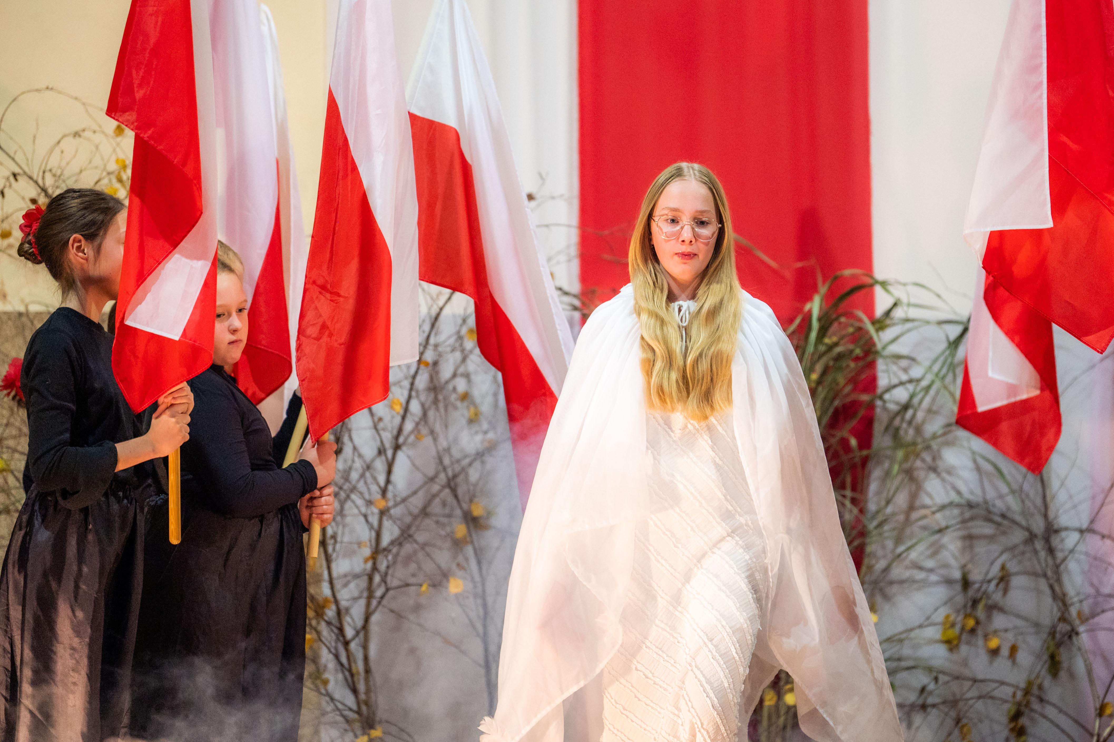 Uroczystość uświetnił patriotyczny występ uczniów z miejscowej szkoły, przygotowany pod kierunkiem Agnieszki Skąpskiej – Hełki. Młodzi artyści prozą i wierszem przypomnieli tragiczne losy naszej ojczyzny i heroiczną postawę Polaków, którzy nie godzili się z niewolą i gorąco pragnęli wolności. Podkreślili ważne dla wszystkich pokoleń słowa: wolność, wiara, miłość i zwycięstwo. Szczególną wymowę miała scena rozszarpywania Polski – białego orła – przez trzy czarne kruki. Uczniowie śpiewali pieśni patriotyczne bliskie sercom Polaków, o czym świadczyło włączanie się gości do śpiewu. Wzruszenie wywołała pięknie, delikatnie odśpiewana piosenka o Jasieńku, który zginął, a ukochana czeka z pąkami białych róż. Scenę finałową poprzedził taniec dziewczynek z flagami, po którym znów pojawił się orzeł – Polska już bez więzów niewoli, dumna i niepokonana. Widzowie na stojąco nagrodzili młodych artystów gromkimi brawami.