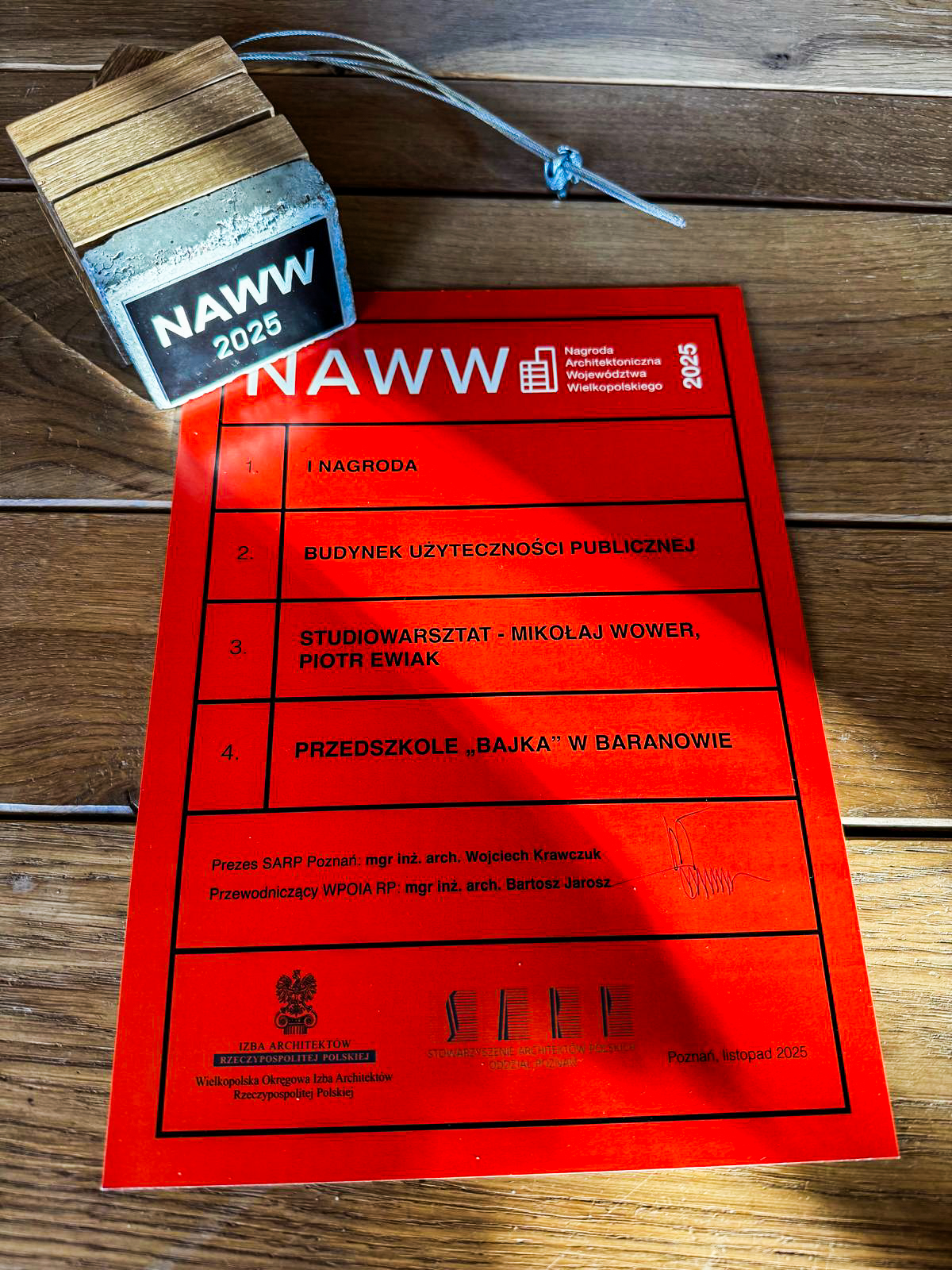 Z dumą możemy poinformować, że nasze Przedszkole „Bajka” w Baranowie zdobyło pierwsze miejsce w kategorii „Budynek użyteczności publicznej”, za którego projekt odpowiedzialna była pracownia studioWarsztat – Mikołaj Wower i Piotr Ewiak. Architekci otrzymali nagrodę finansową ufundowaną przez Samorząd Województwa Wielkopolskiego.