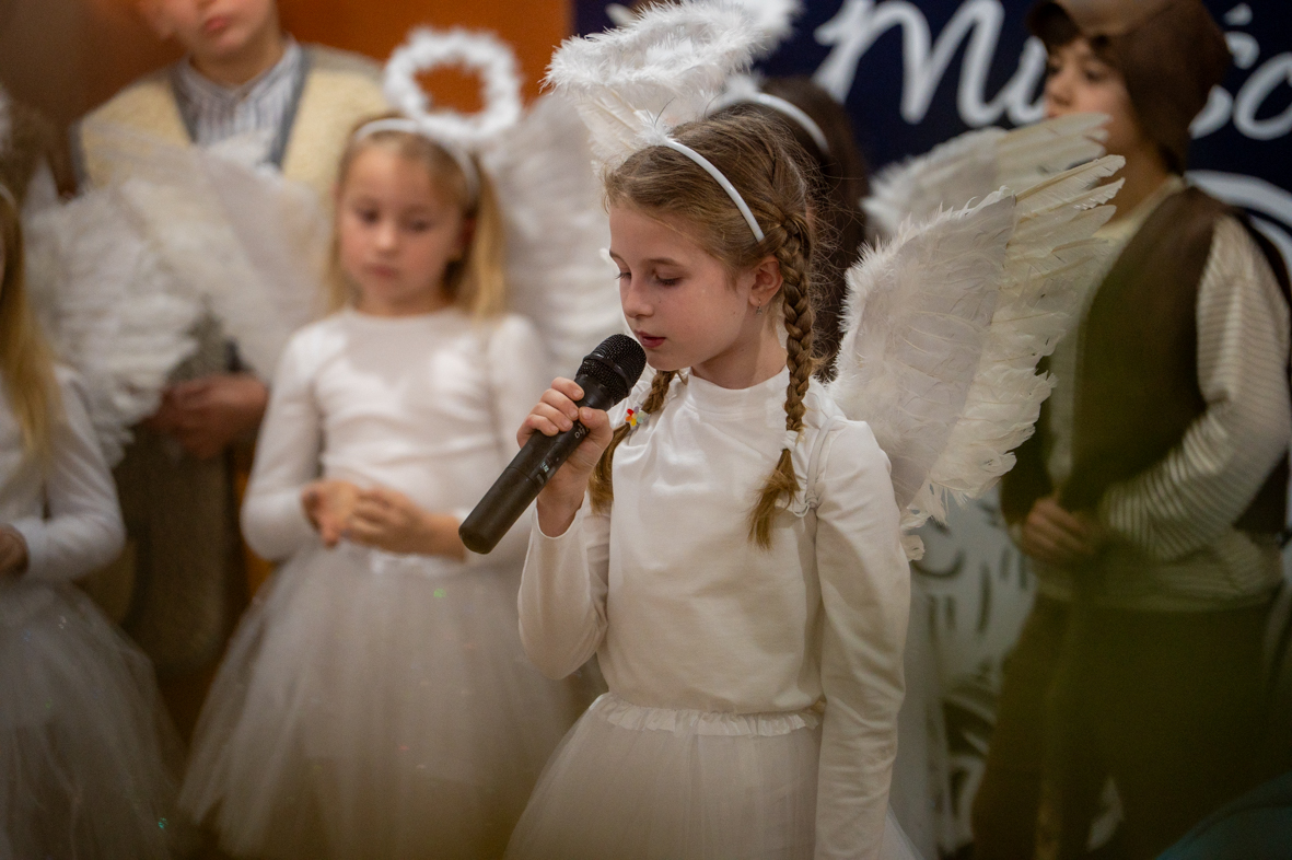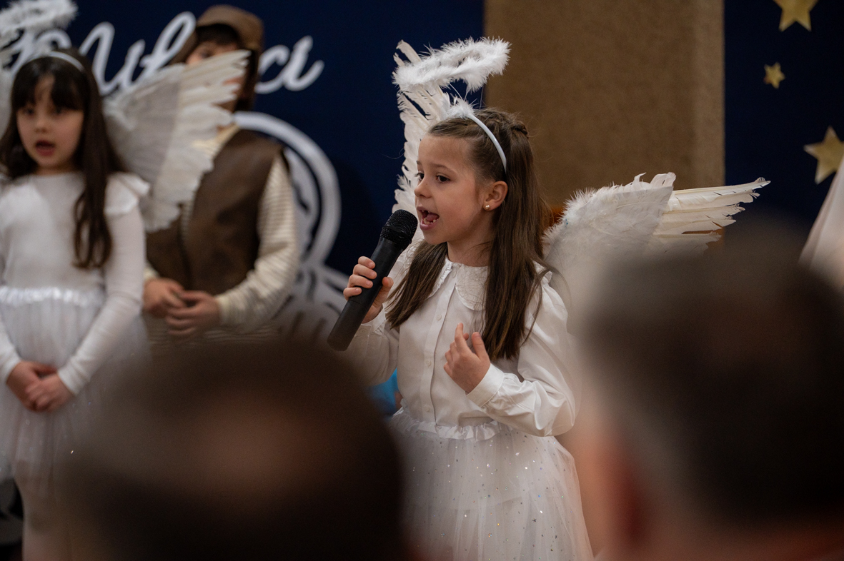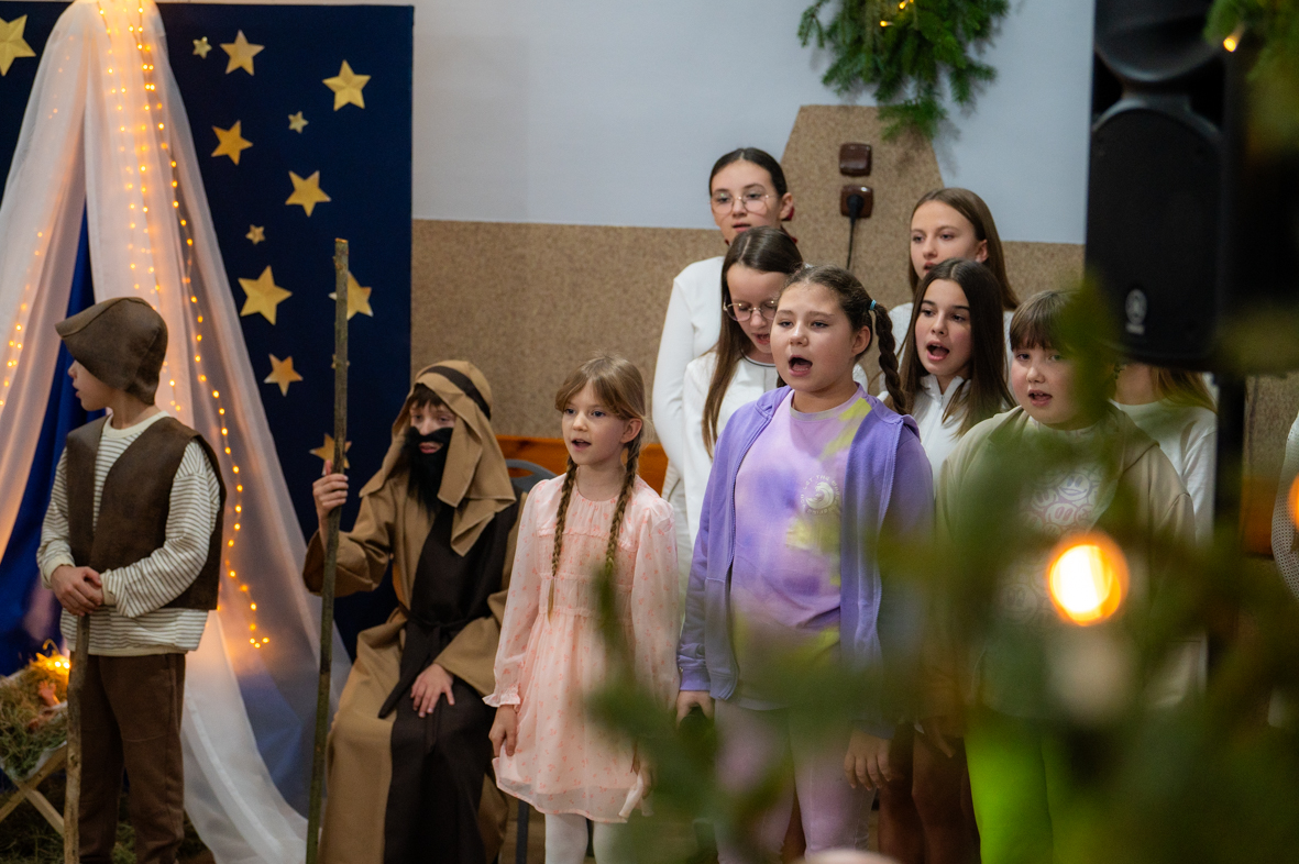 Cytowany na wstępie C.K. Norwid wspominał o Wspólnym Gnieździe, a Nasze Gniazdo to Gminna Wspólnota. I tak wszyscy spotkali się przy symbolicznym świątecznym stole. Powitali ich mali artyści, którzy przygotowali świąteczne widowisko. Witamy serdecznie wszystkich gości, / wszystkich co dziś są pełni radości, / Tych, co przyszli z nadzieją w sercu, / że coś pięknego zobaczą - Ta zachęta popłynęła ze strony aktorów z szkoły w Łęce Mroczeńskiej, którzy zaprezentowali spektakl wyreżyserowany przez Andżelikę Marcinkowską, Henrykę Orszulak oraz Annę Raszewską. Oprawę muzyczną stworzył Andrzej Ciurys. Choć lata lecą i płyną wieki, / Choć nas oddziela dziś czas daleki / Od tamtych czasów gdy w Betlejem/Pan Bóg zstąpił do nas na ziemię / Chcemy te wydarzenia uczcić przedstawieniem.
