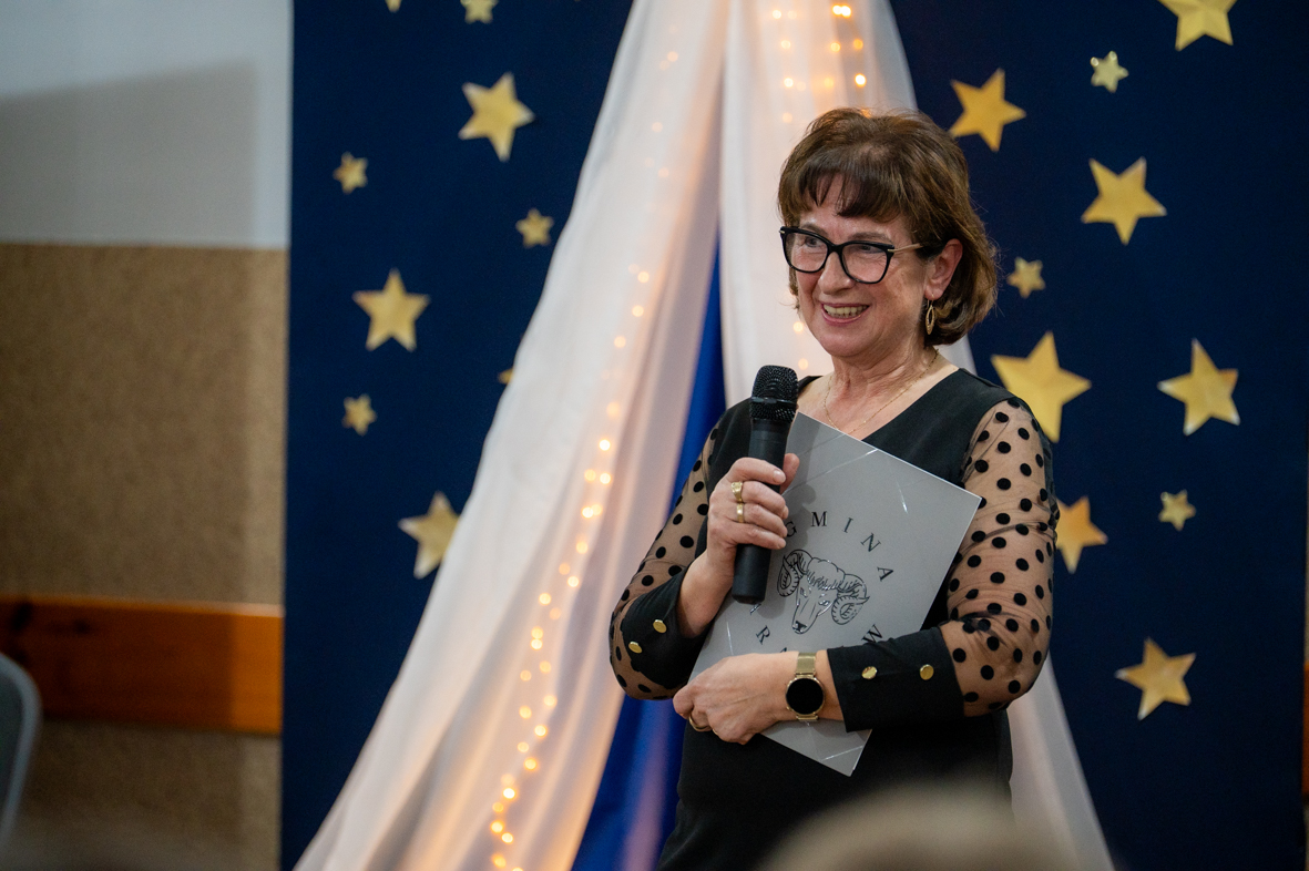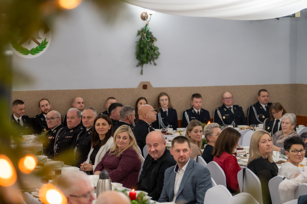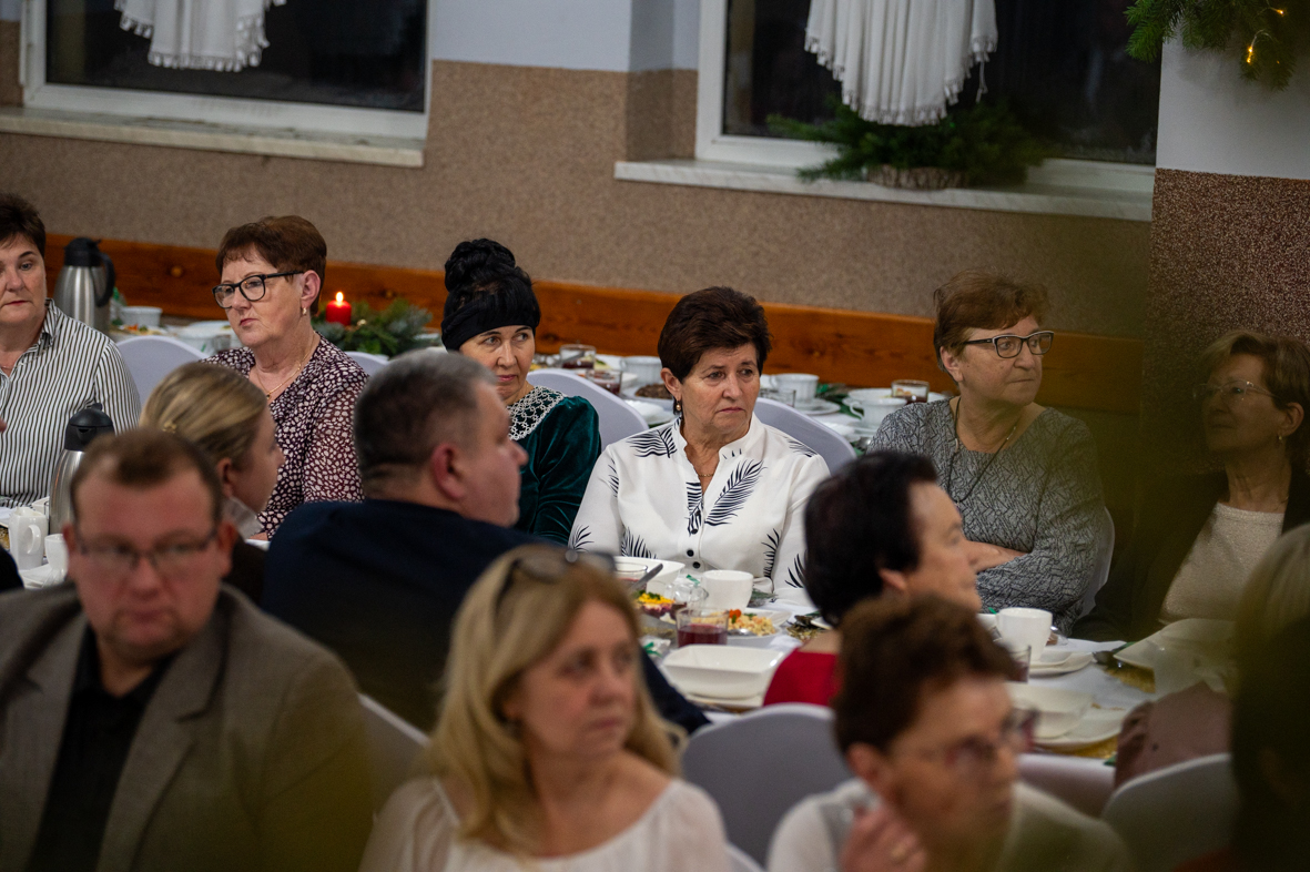 Przed świąteczną wieczerzą, szacowni Goście Gminnej Wigilii przełamali się opłatkiem. Ten biały kruchy opłatek, / pszenna kruszyna chleba, / a symbol wielkich rzeczy, / symbol pokoju i nieba. / Na ziemię w noc wtuloną, Bóg schodzi jak przed wiekami. / Braćmi się znowu poczyńmy, przebaczmy krzywdy, gdy trzeba. / Podzielmy się opłatkiem, chlebem pokoju i nieba. (ems)