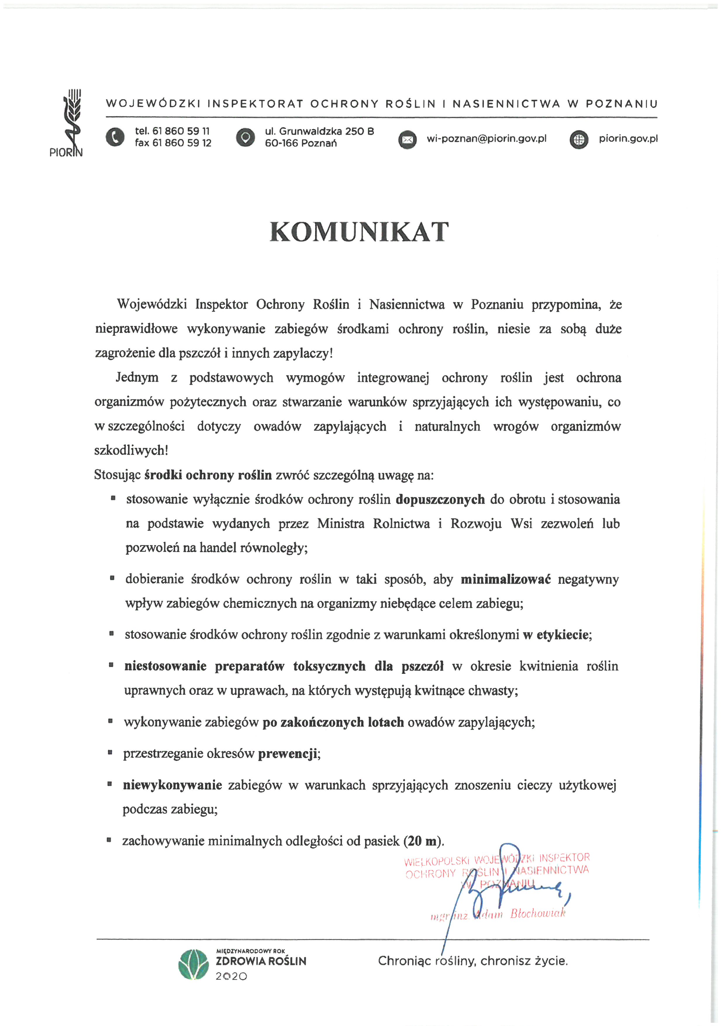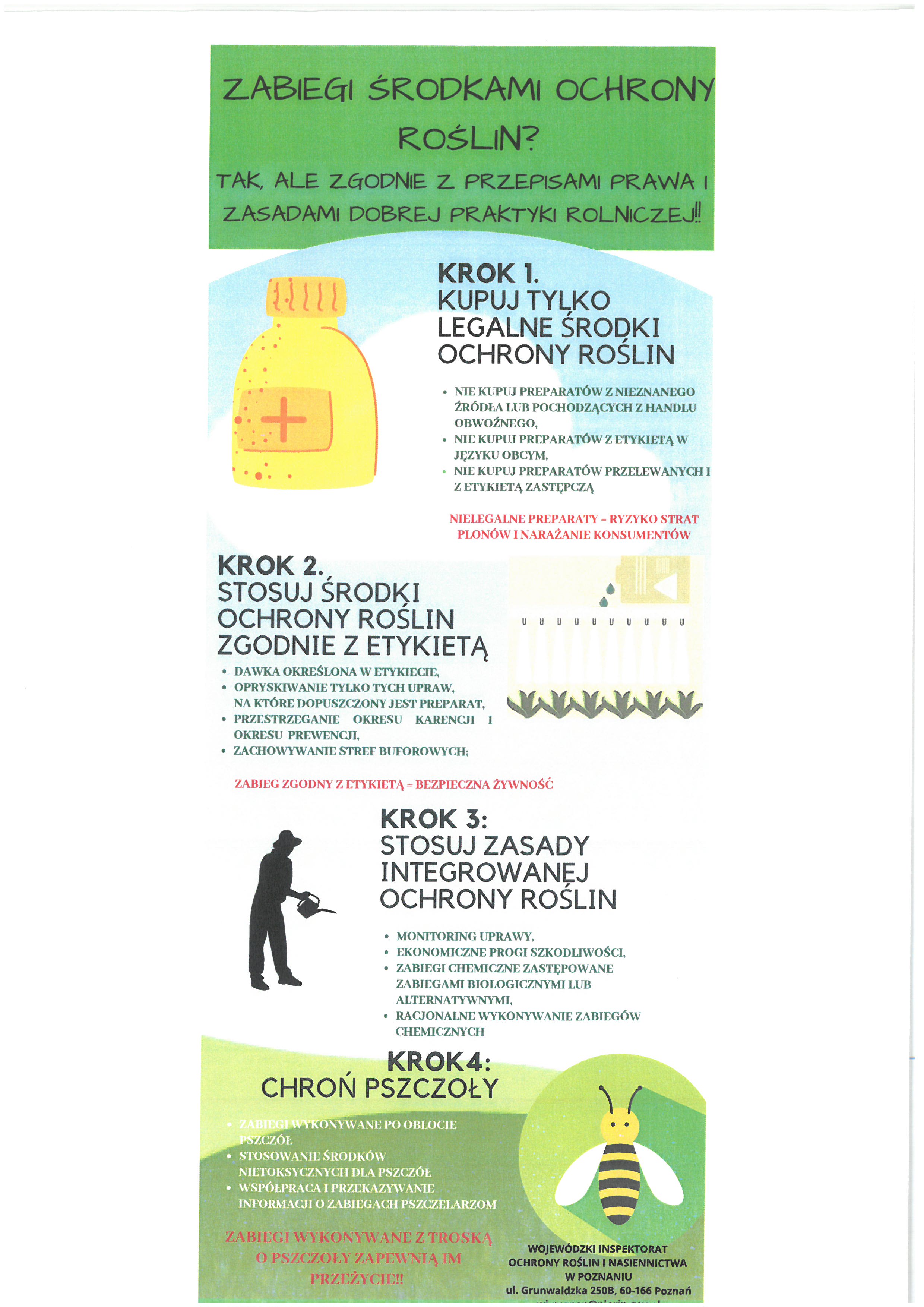 Informacje Wojewódzkiego Inspektoratu Ochrony Roślin i Nasiennictwa w Poznaniu dotyczące stosowania środków ochrony roślin zgodnie z przepisami, z uwzględnieniem bezpieczeństwa pszczół.