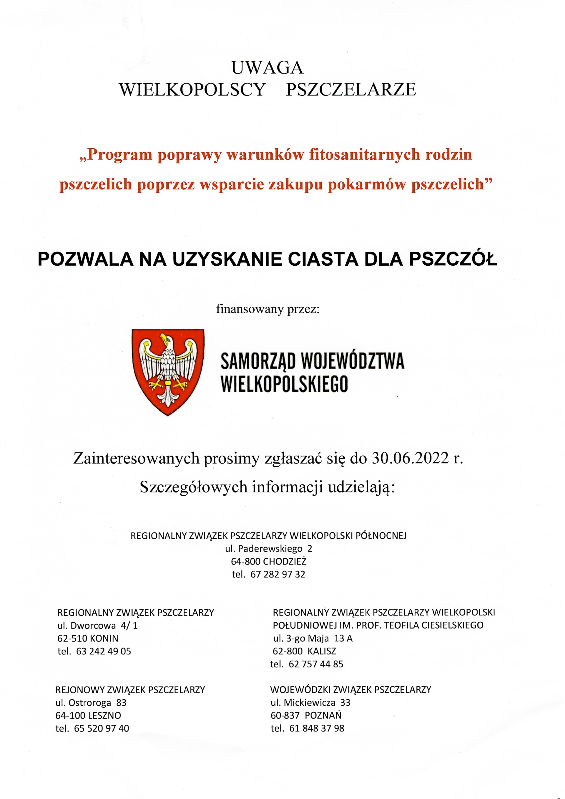 Wielkopolski Urząd Marszałkowski w ramach dotacji w roku 2022 przekazał środki na zakup pokarmów dla pszczół w postaci ciasta. Pszczelarze z terenu Wielkopolski mają możliwość przystąpienia do udziału w programie: "Program poprawy warunków fitosanitarnych rodzin pszczelich poprzez wsparcie zakupu pokarmów pszczelich".